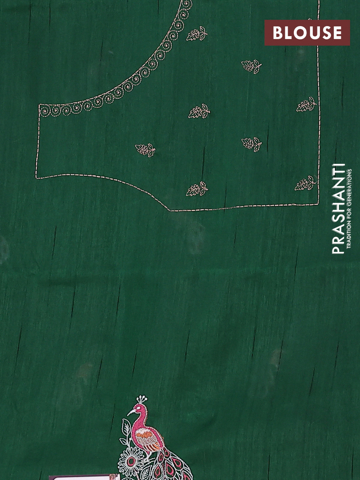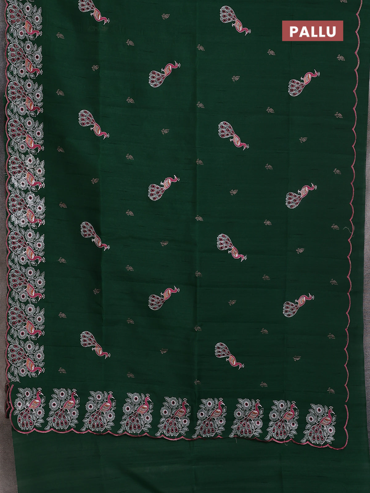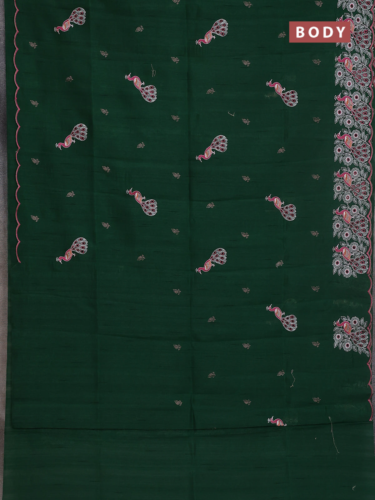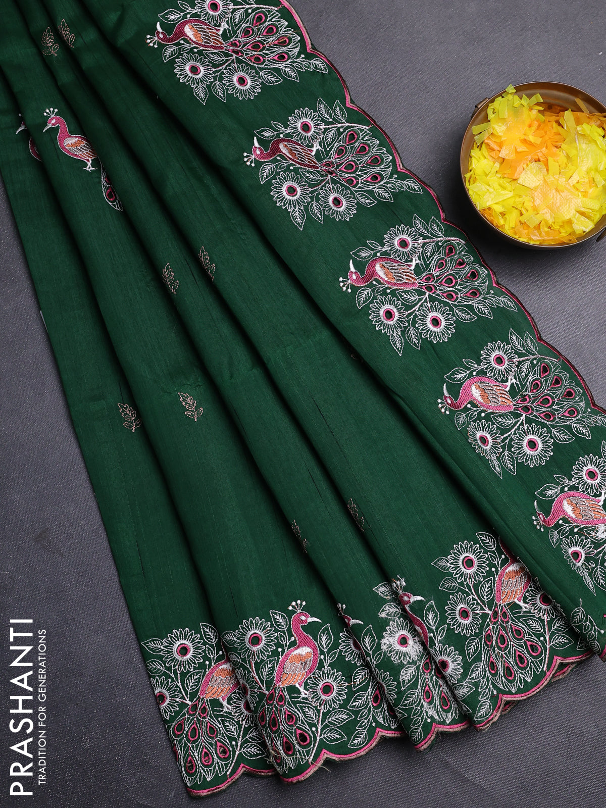 Semi raw silk saree green with embroidery buttas and peacock embroidery cut work border