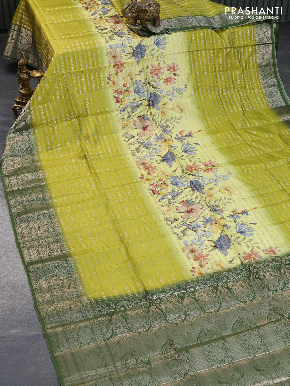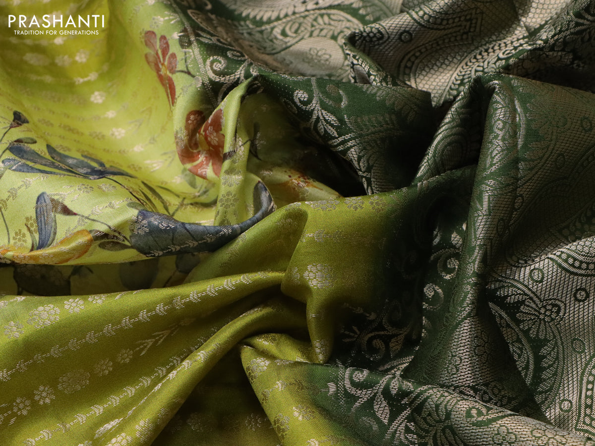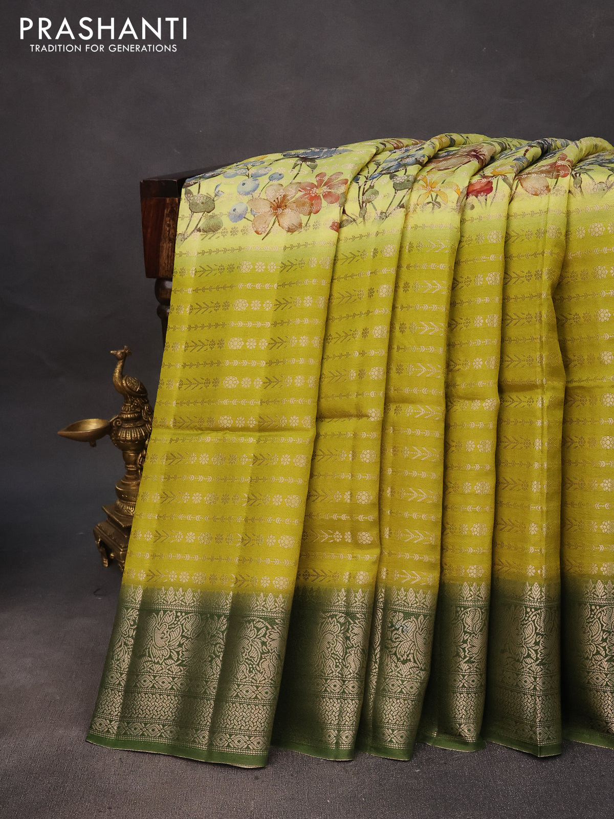 Semi raw silk saree lime shade and green with allover zari weaves & floral digital prints and zari woven border