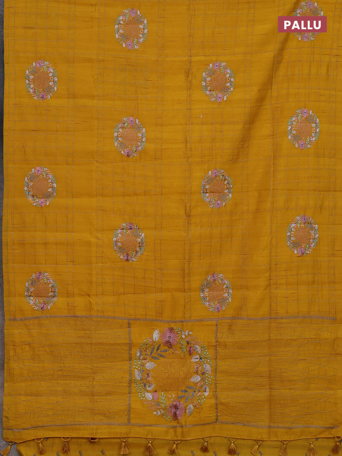 Semi raw silk saree mustard yellow with allover embroidery work buttas in borderless style