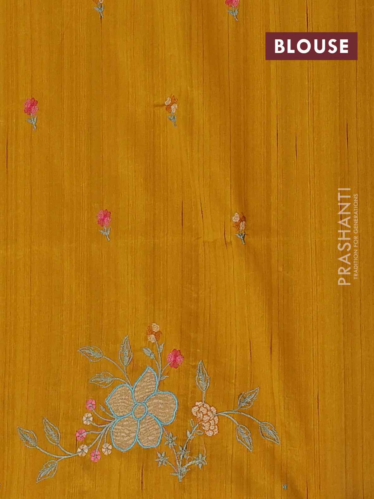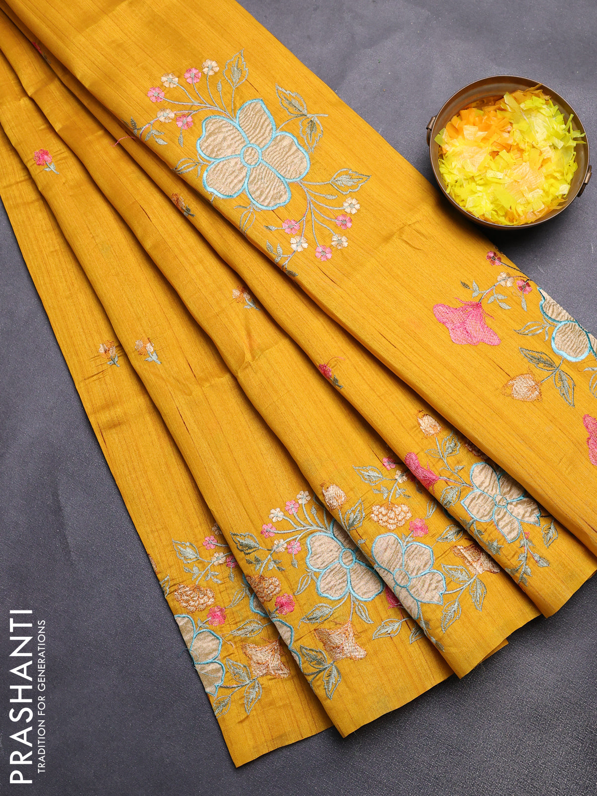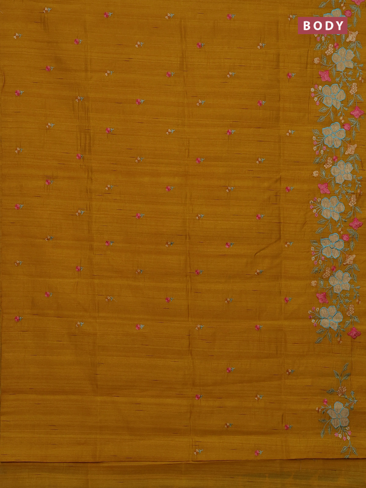 Semi raw silk saree mustard yellow with embroidery buttas and floral embroidery border