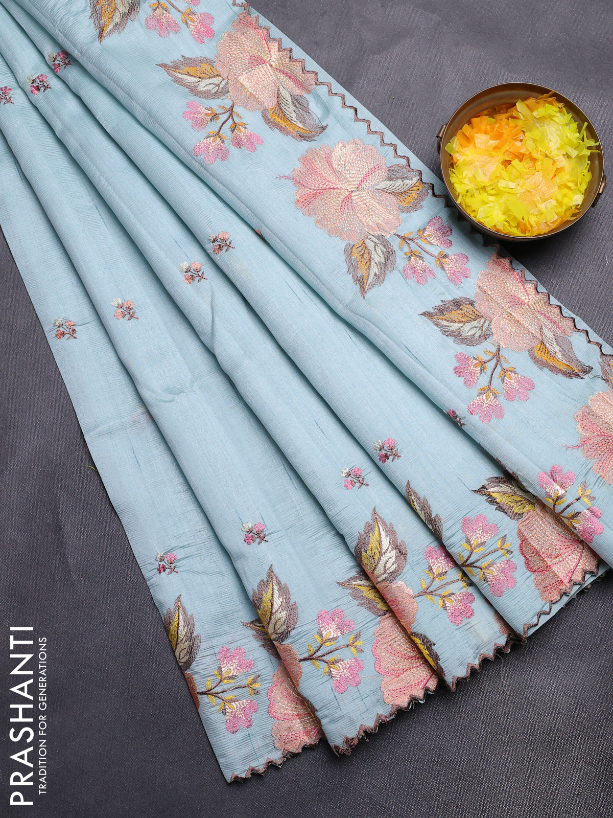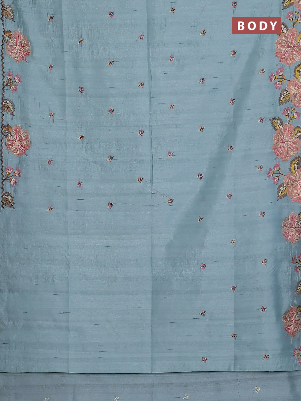 Semi raw silk saree pastel blue with embroidery buttas and floral embroidery border