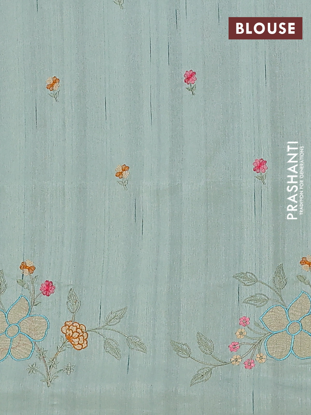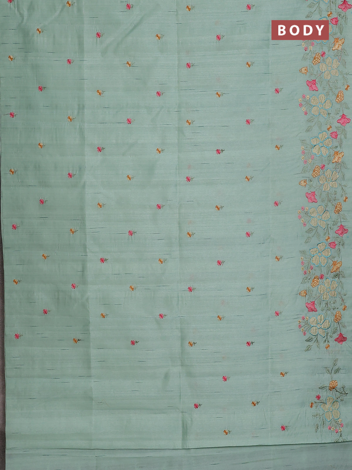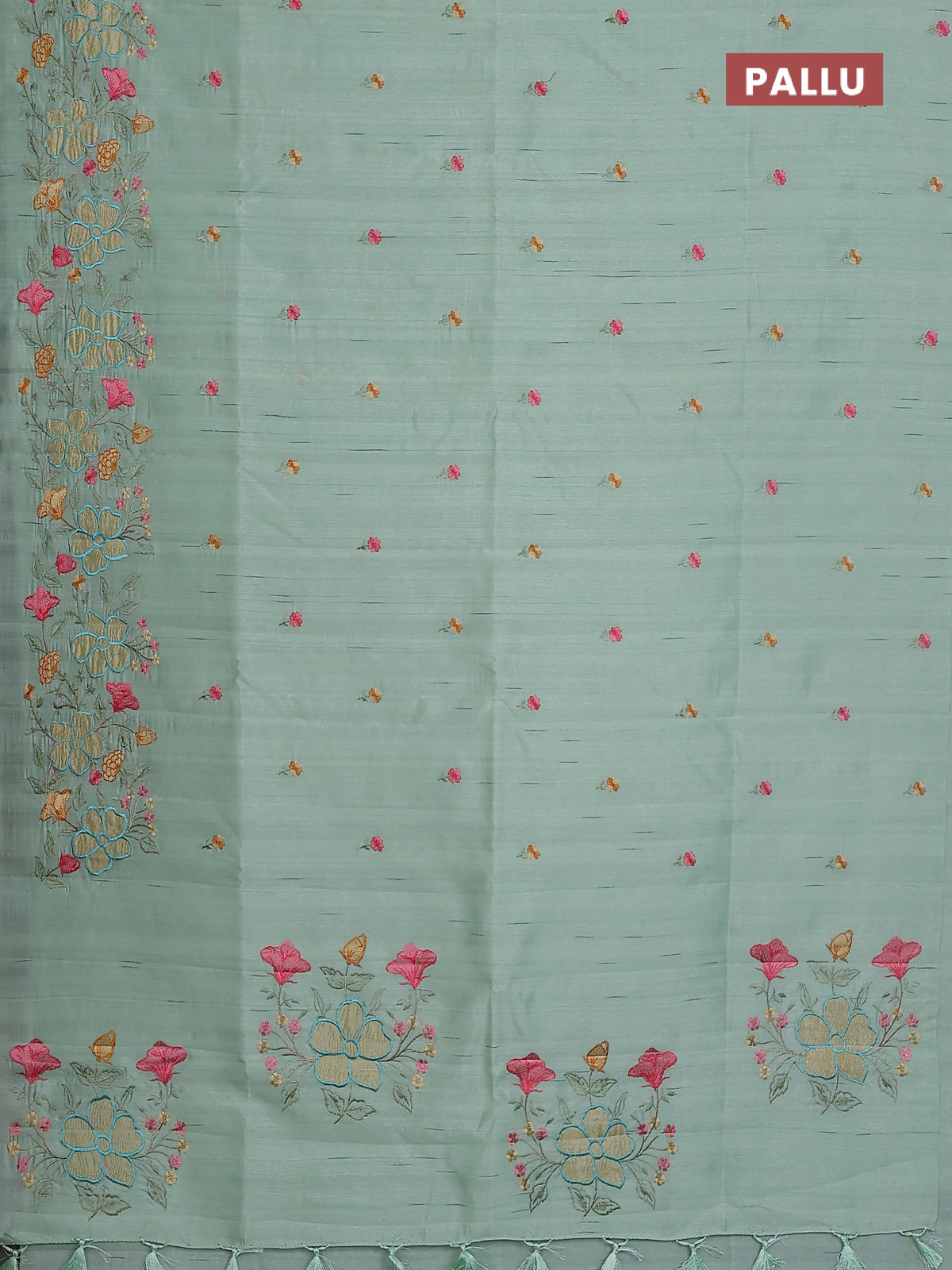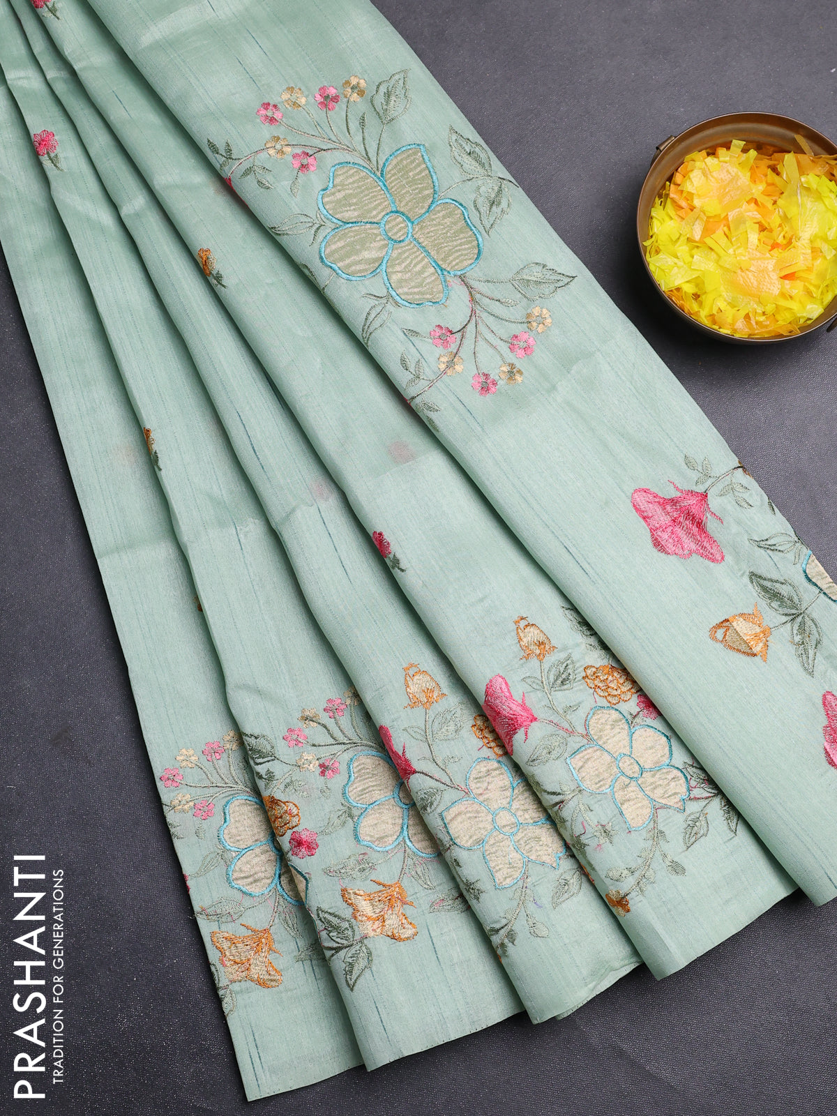 Semi raw silk saree pastel green with embroidery buttas and floral embroidery border
