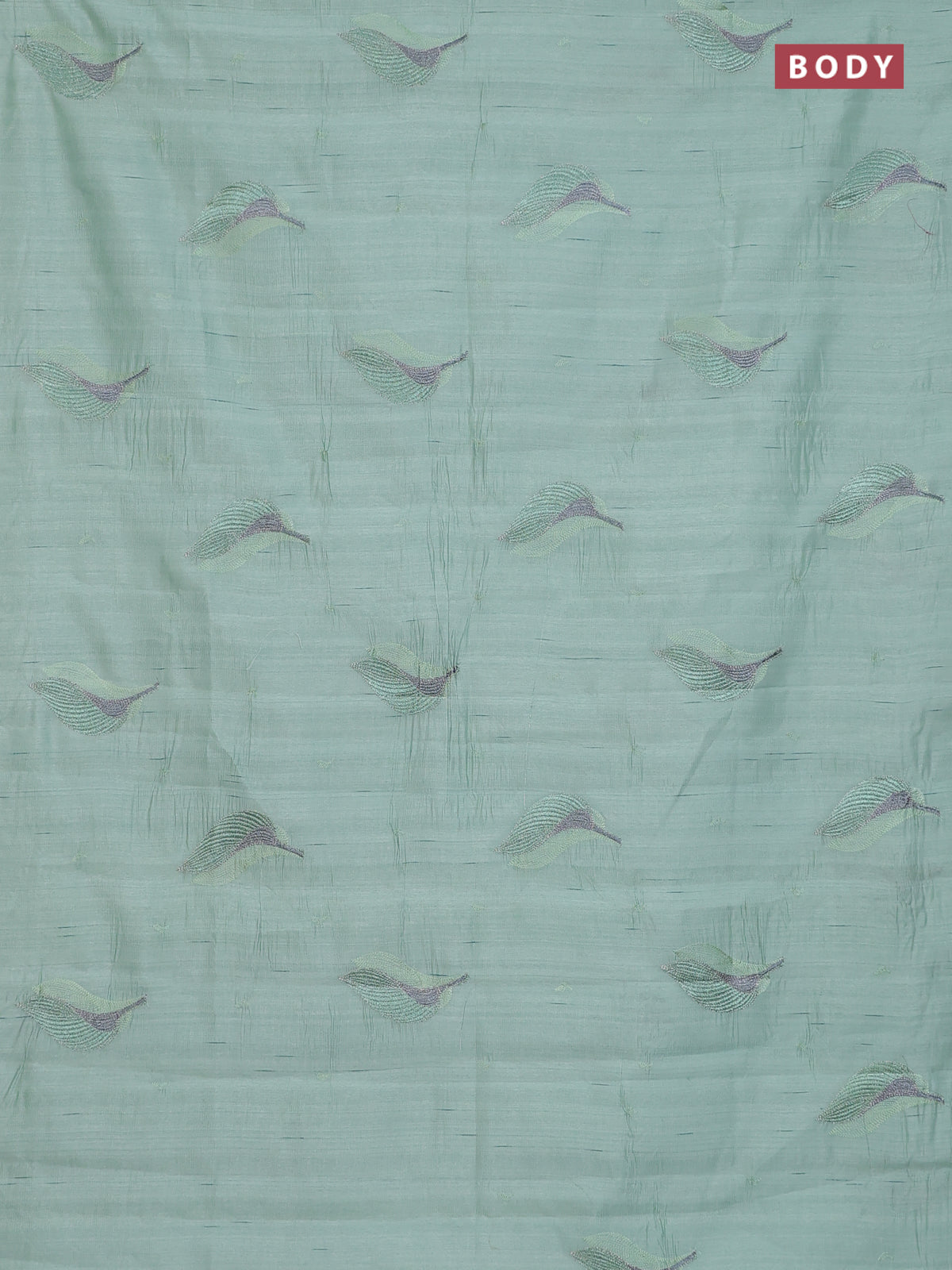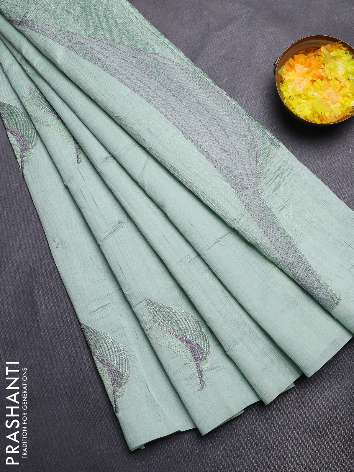 Semi raw silk saree pastel green with leaf embroidery buttas in borderless style
