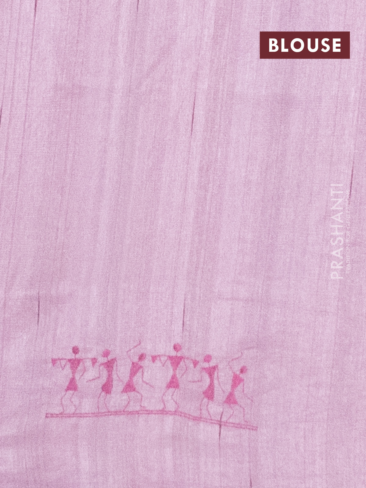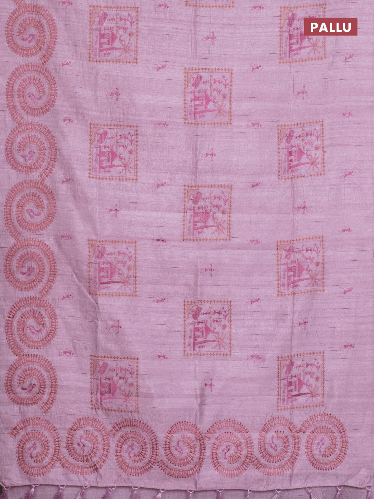 Semi raw silk saree pastel pink with embroidery work buttas and warli design embroidery border