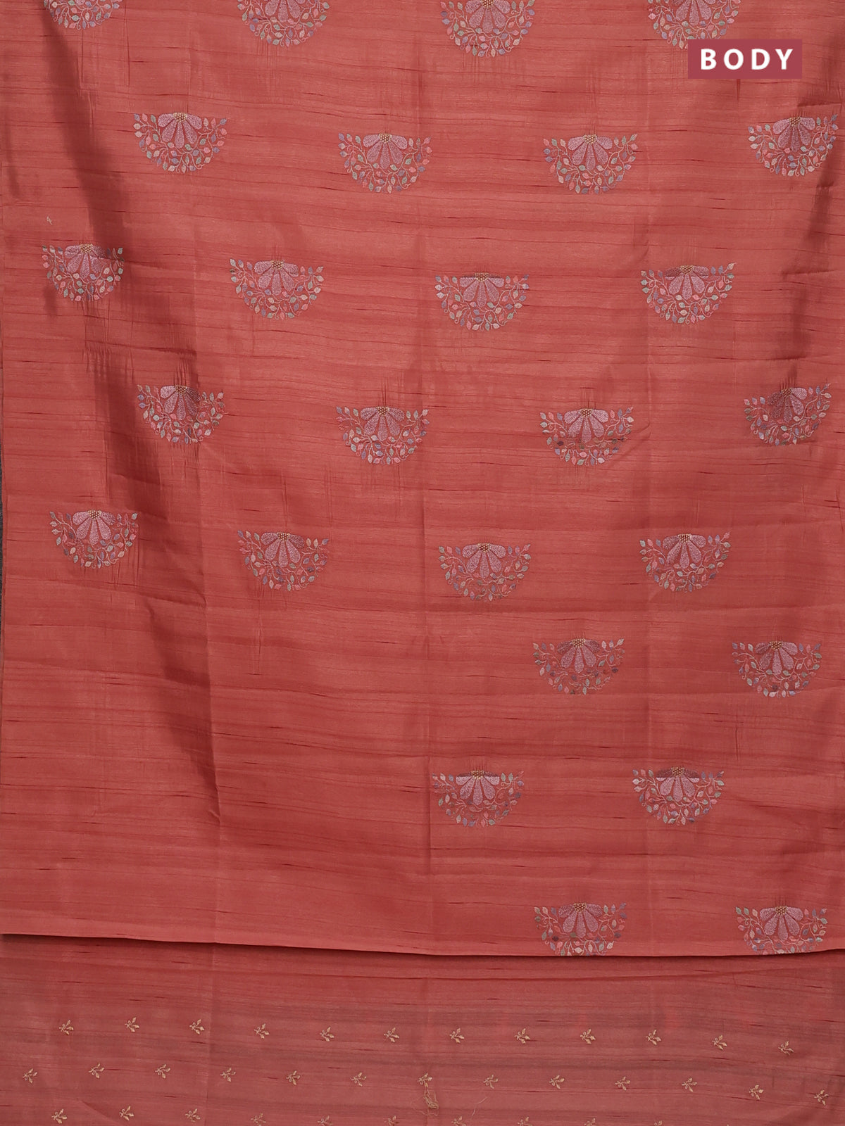 Semi raw silk saree peach orange with embroidery buttas in borderless style