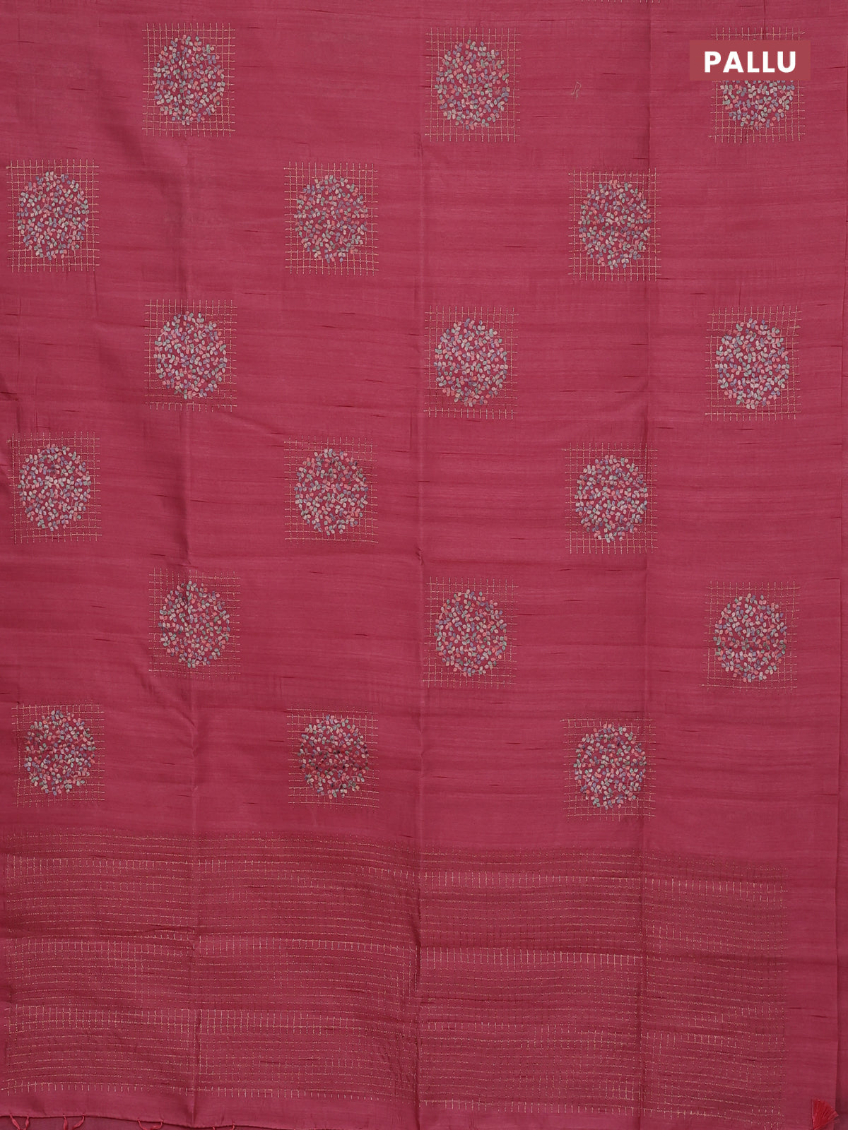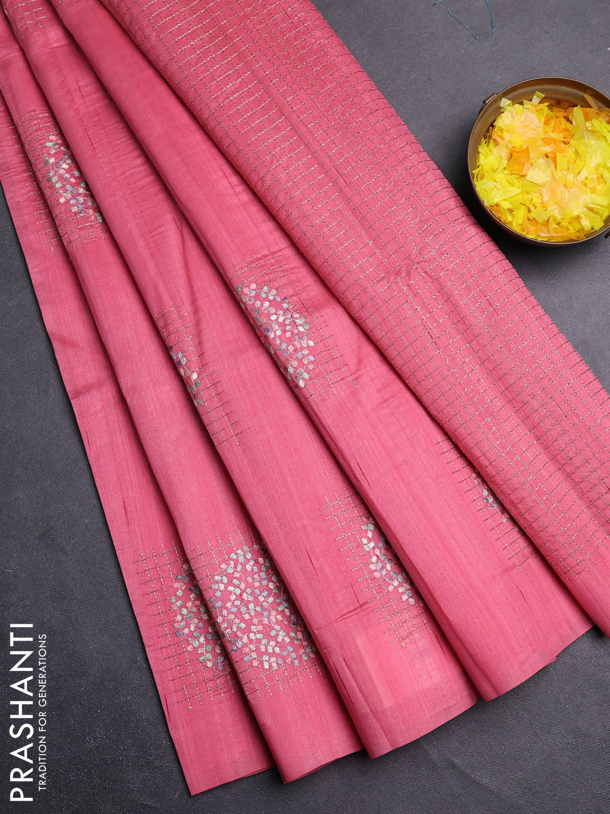 Semi raw silk saree peach pink with embroidery buttas in borderless style