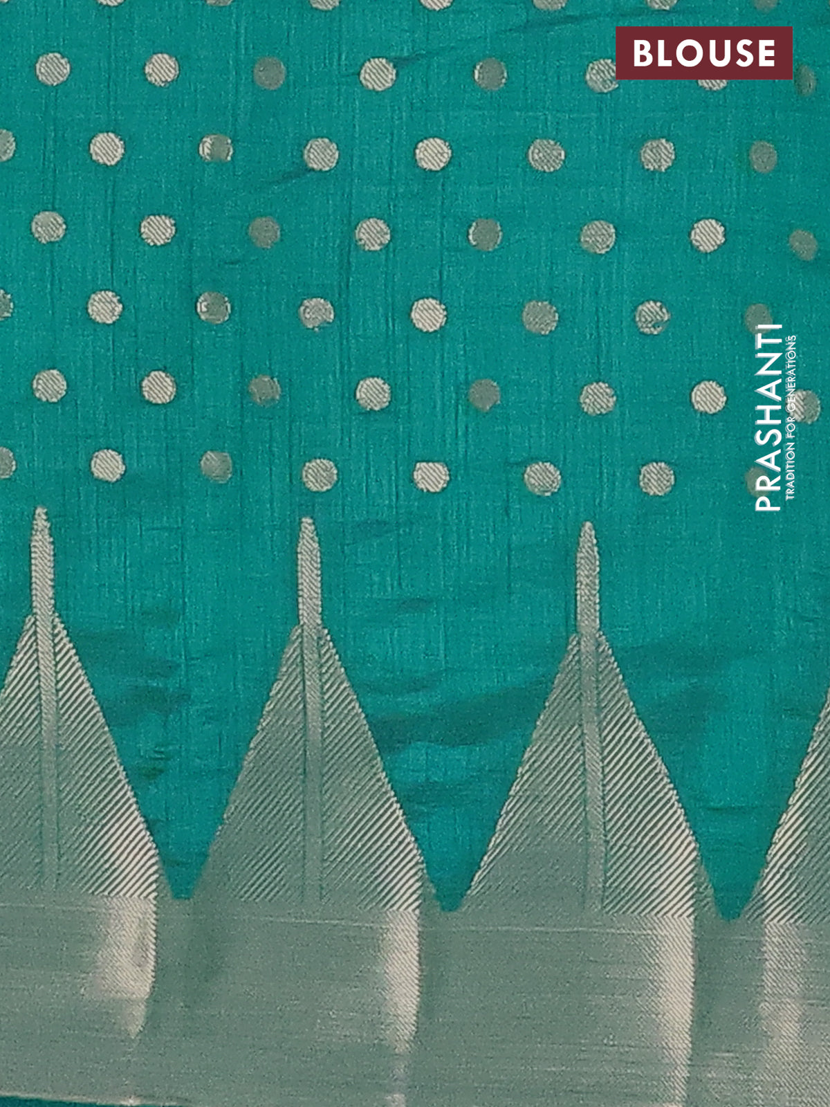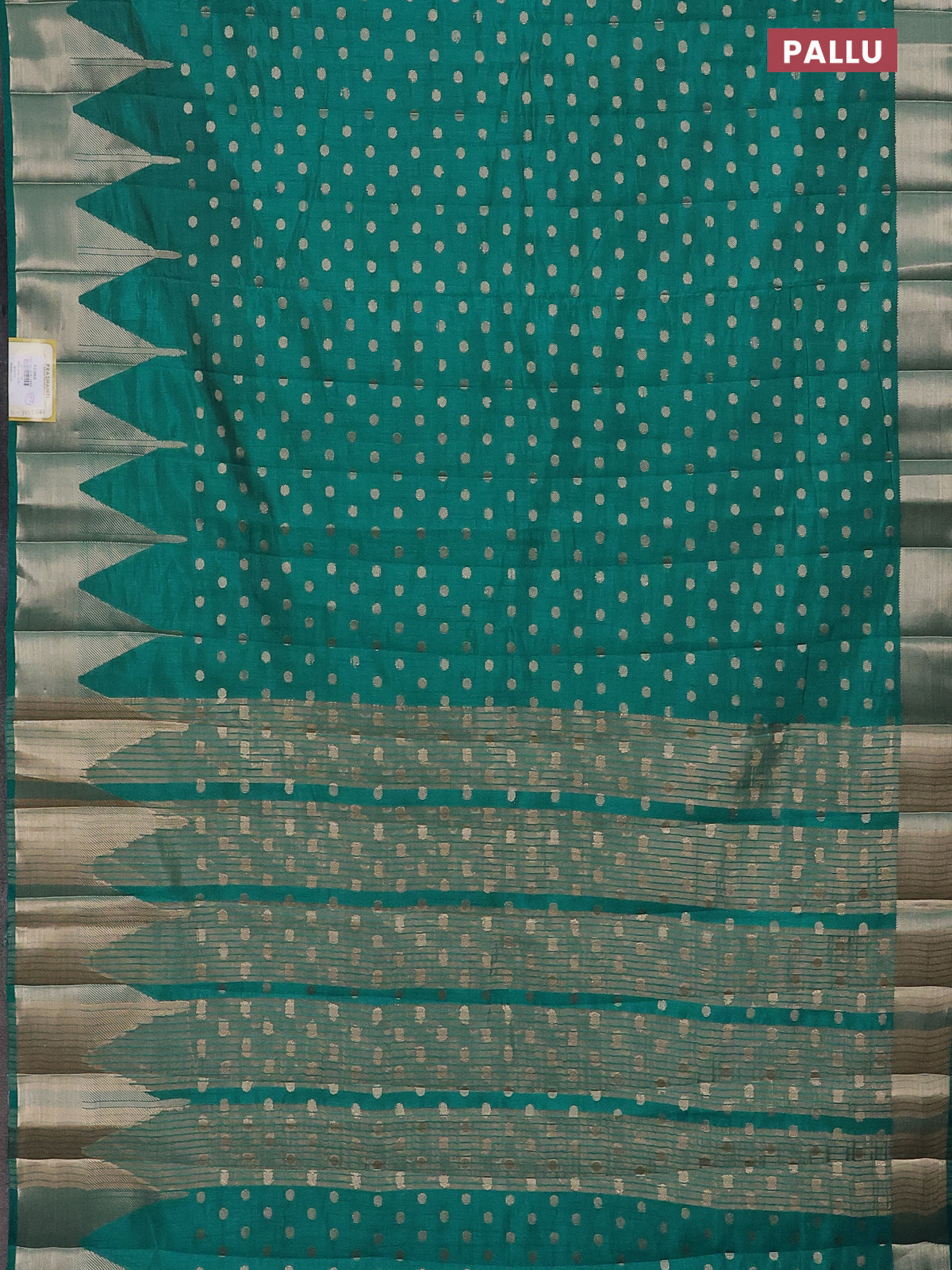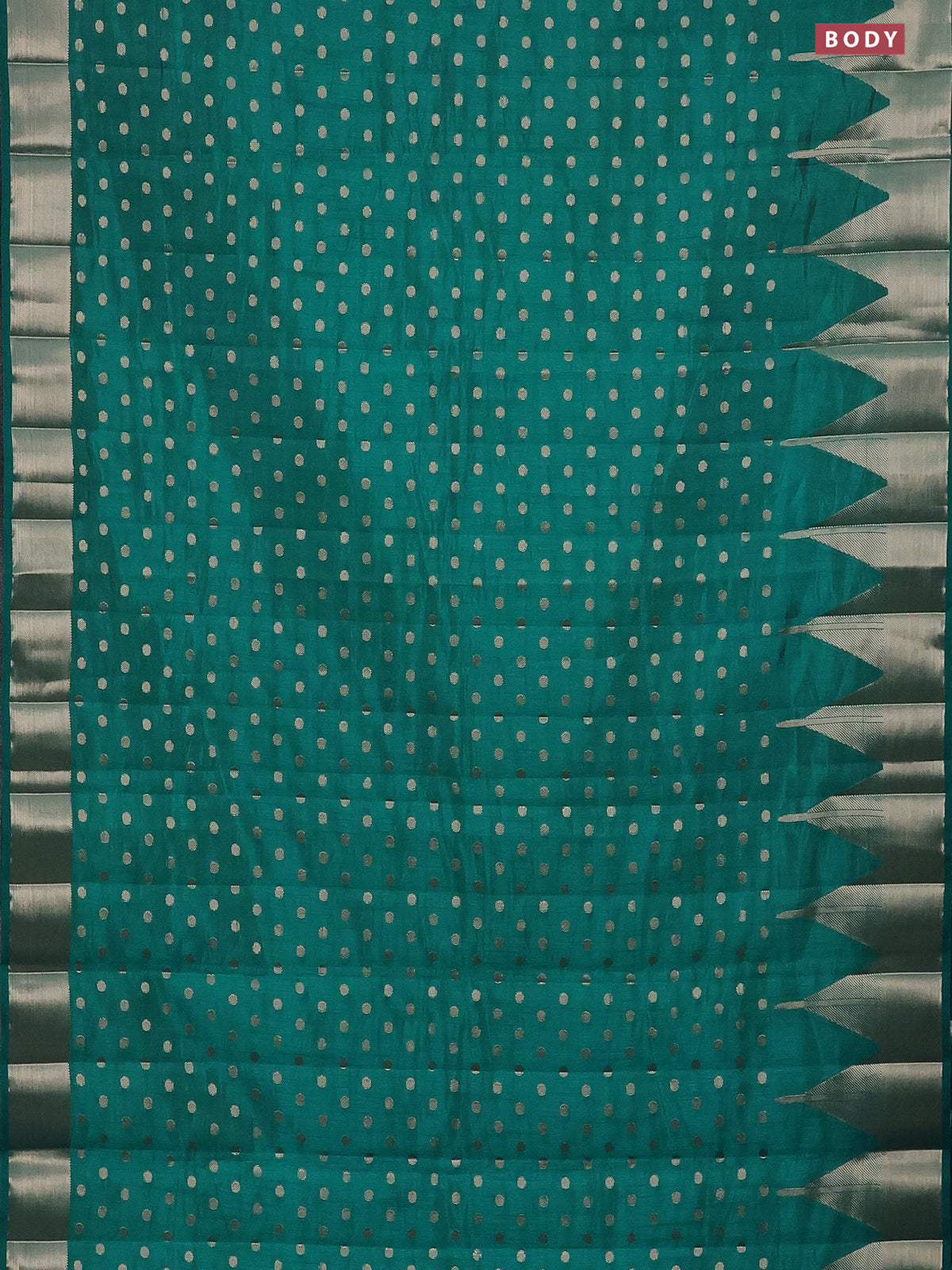 Semi raw silk saree teal blue with allover zari woven 1000 buttas and temple design zari woven border