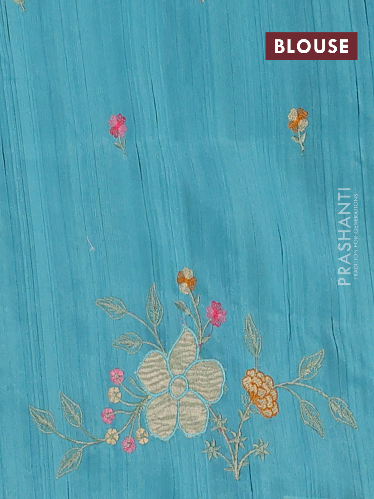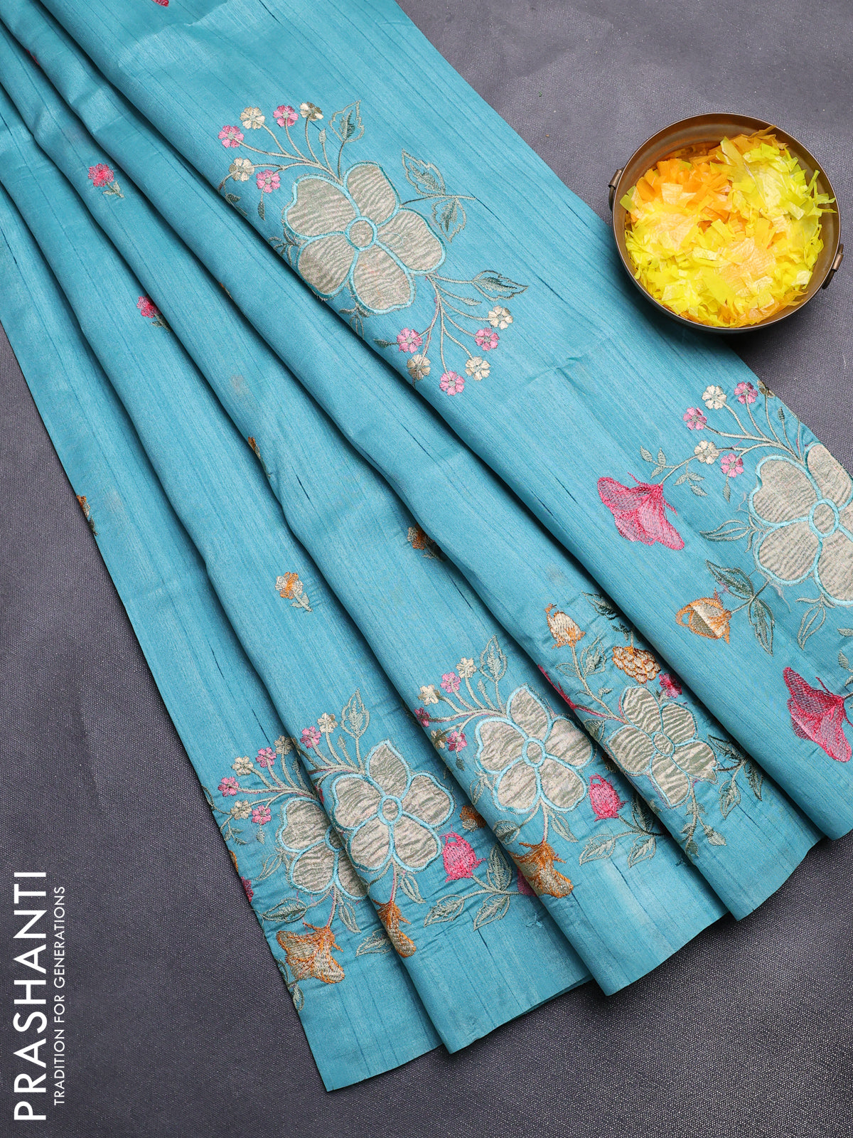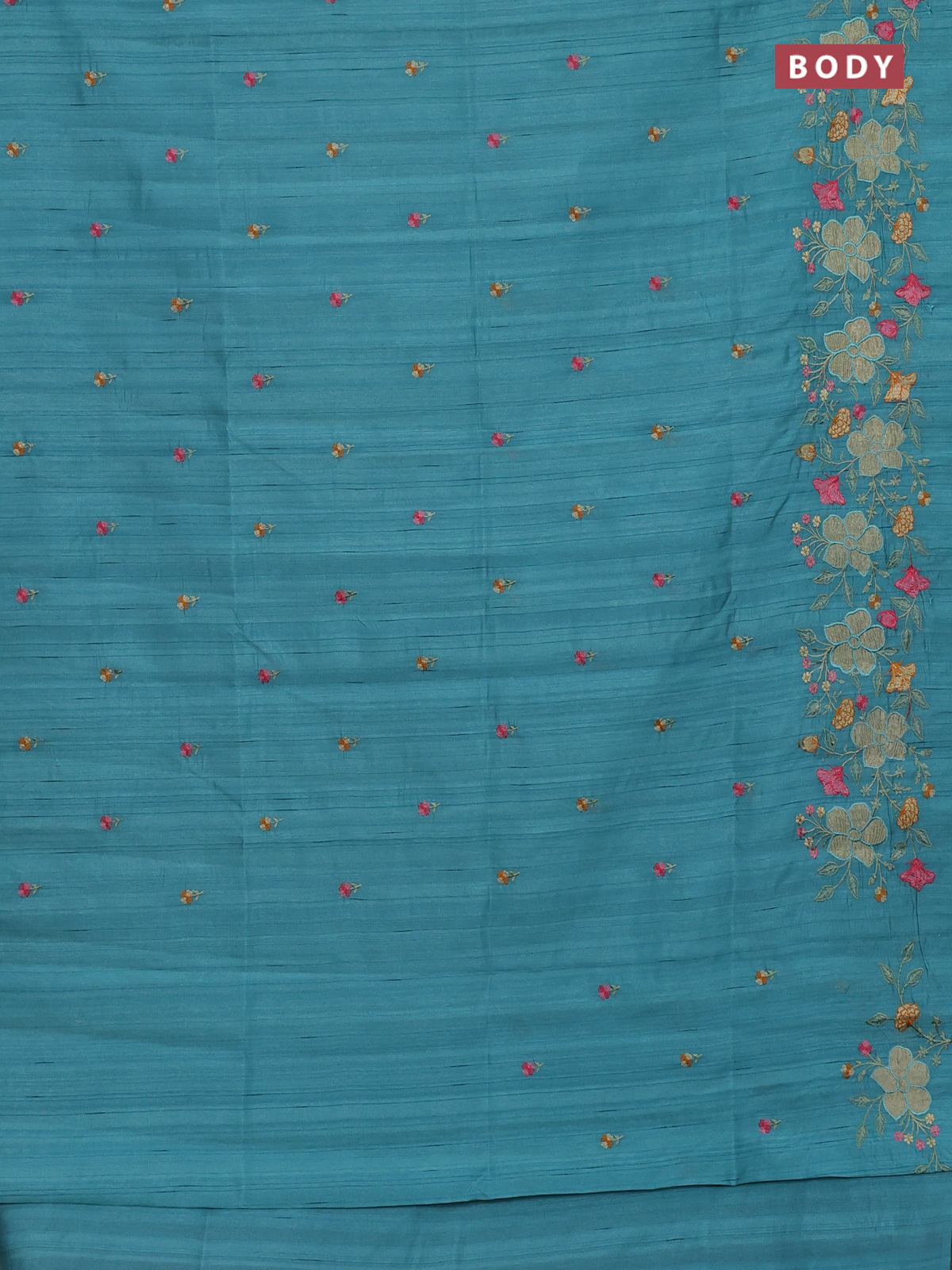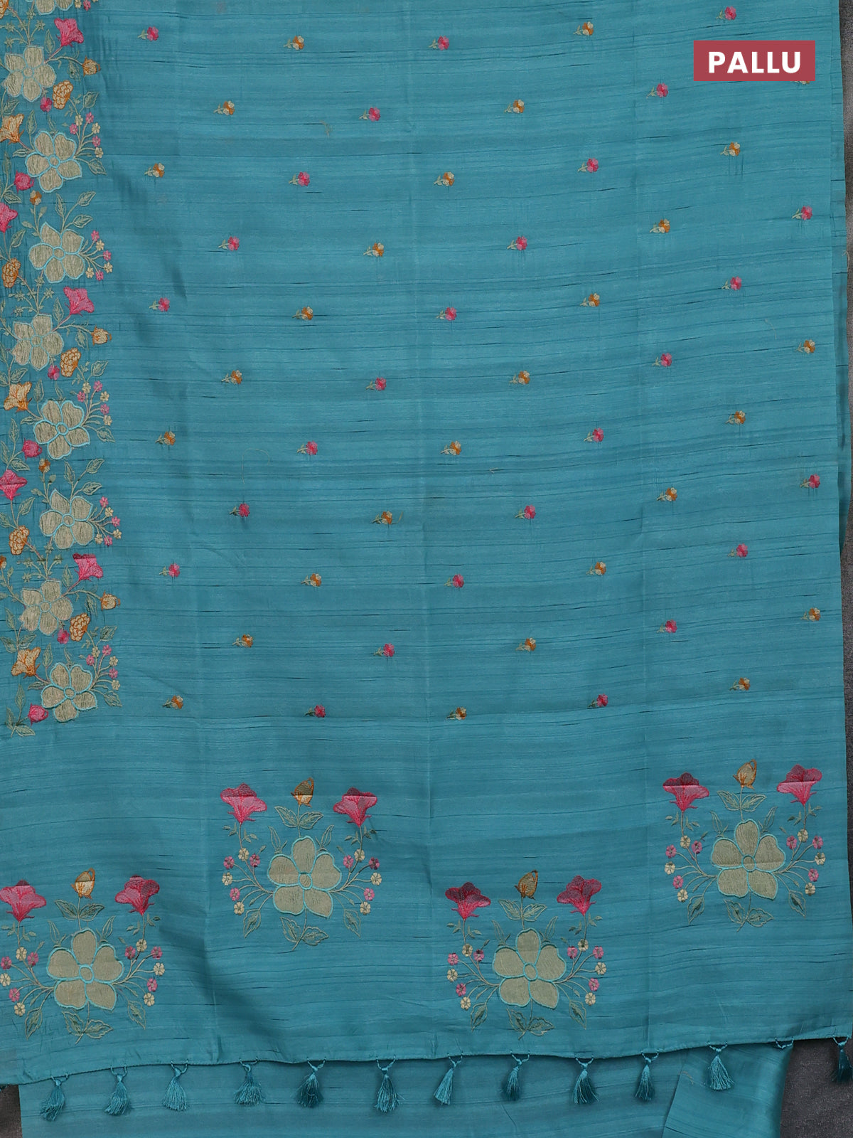 Semi raw silk saree teal blue with embroidery buttas and floral embroidery border