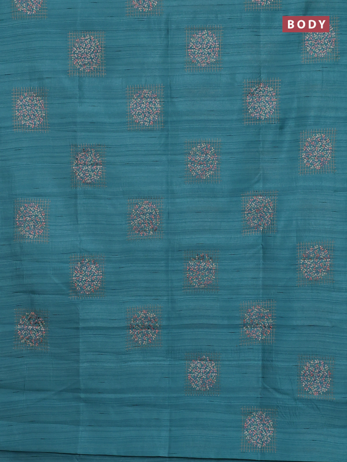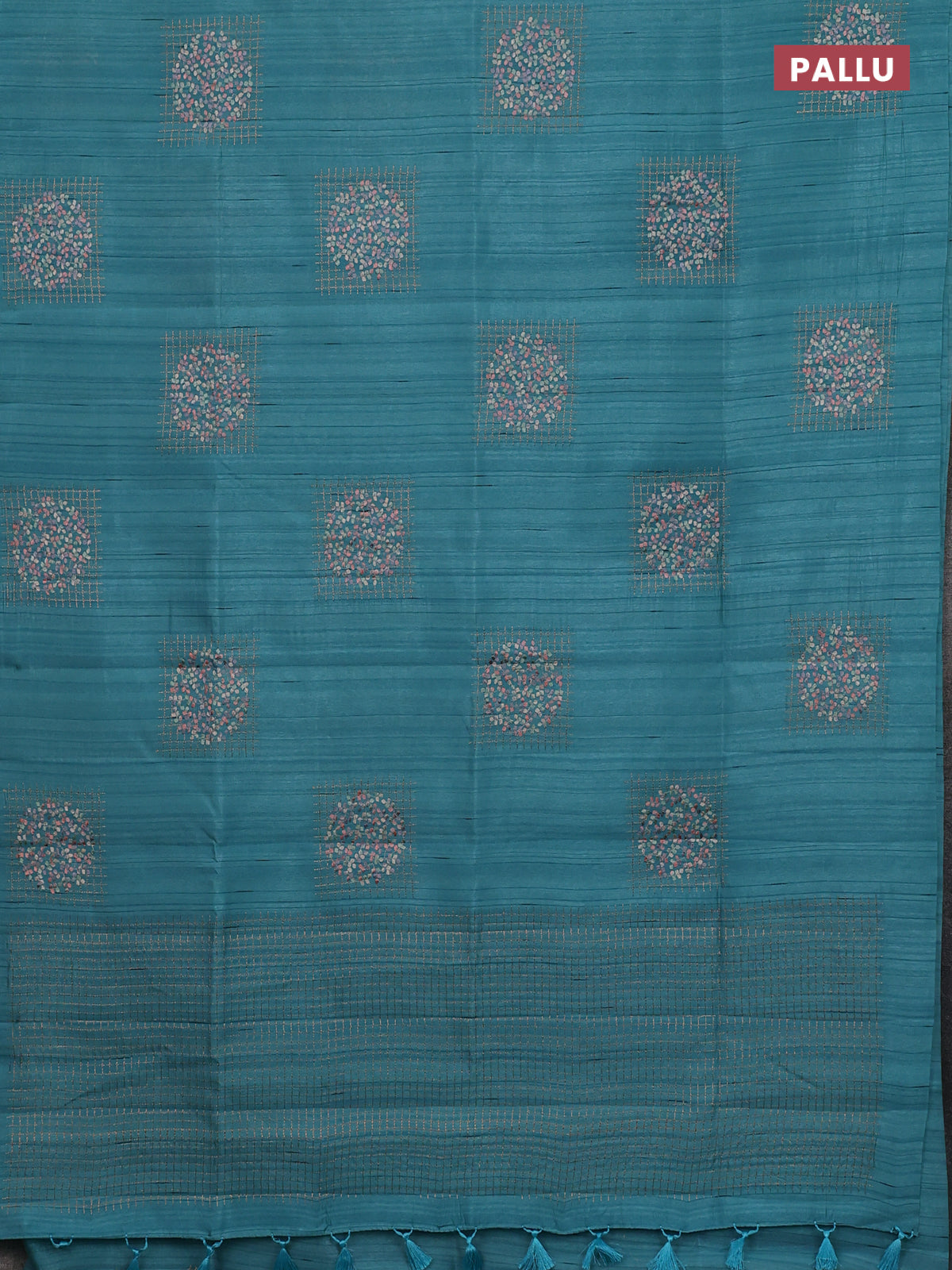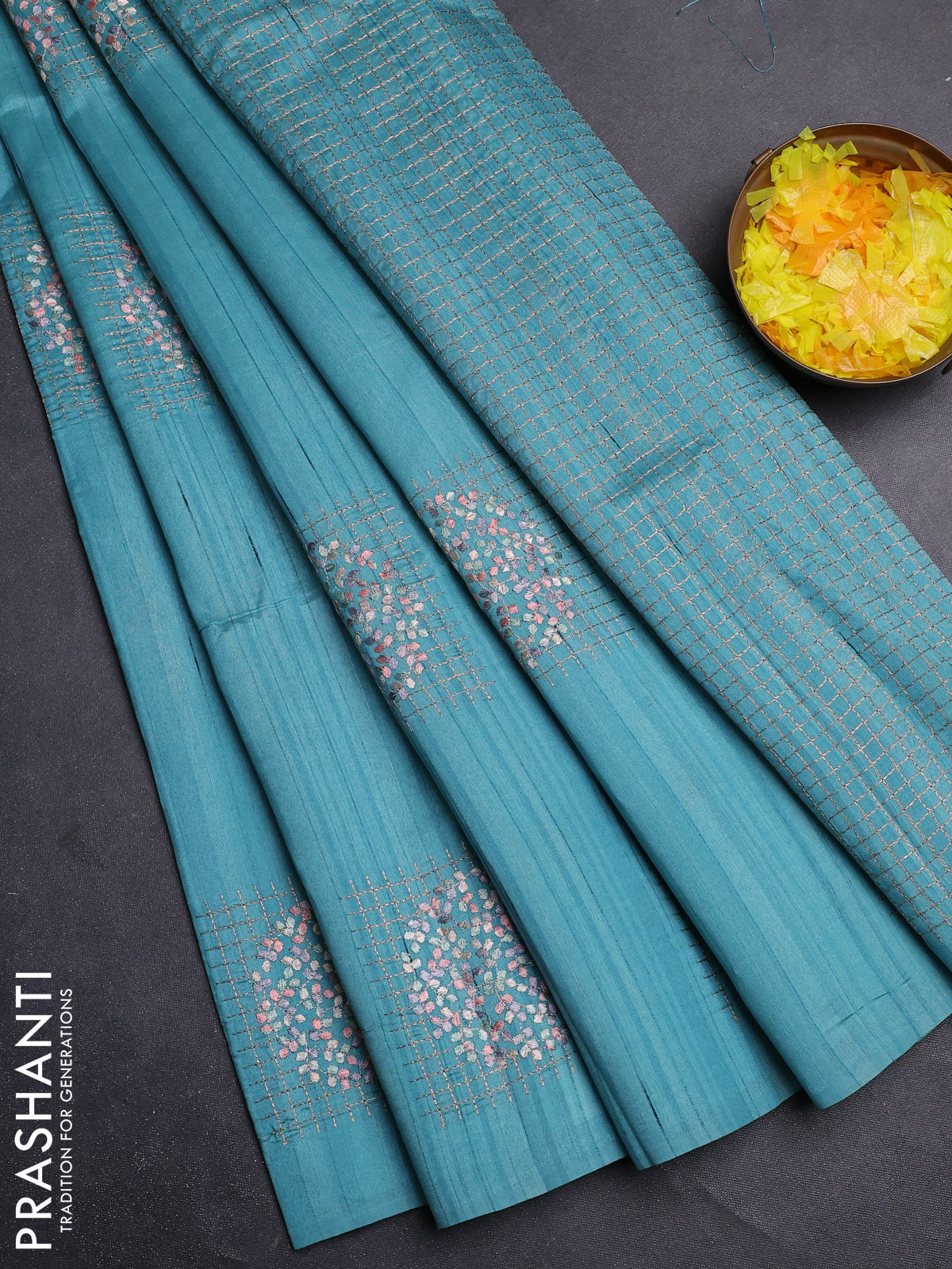 Semi raw silk saree teal blue with embroidery buttas in borderless style