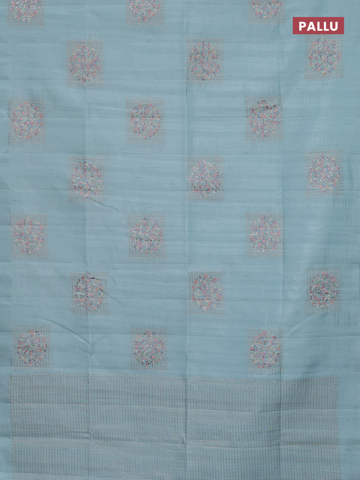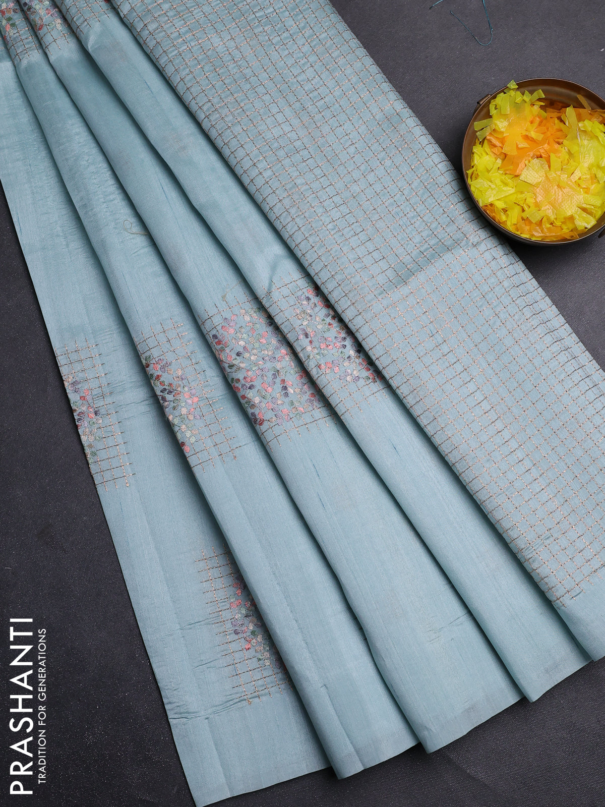 Semi raw silk saree teal blue with embroidery buttas in borderless style