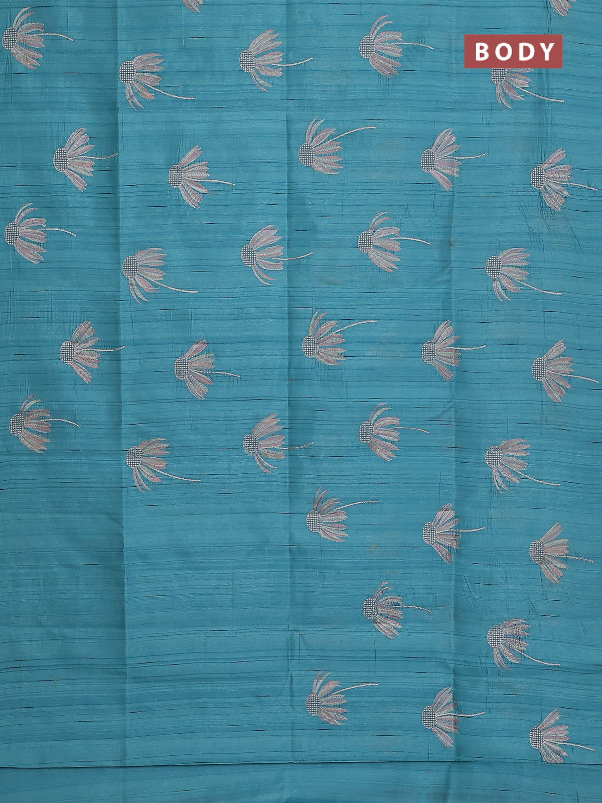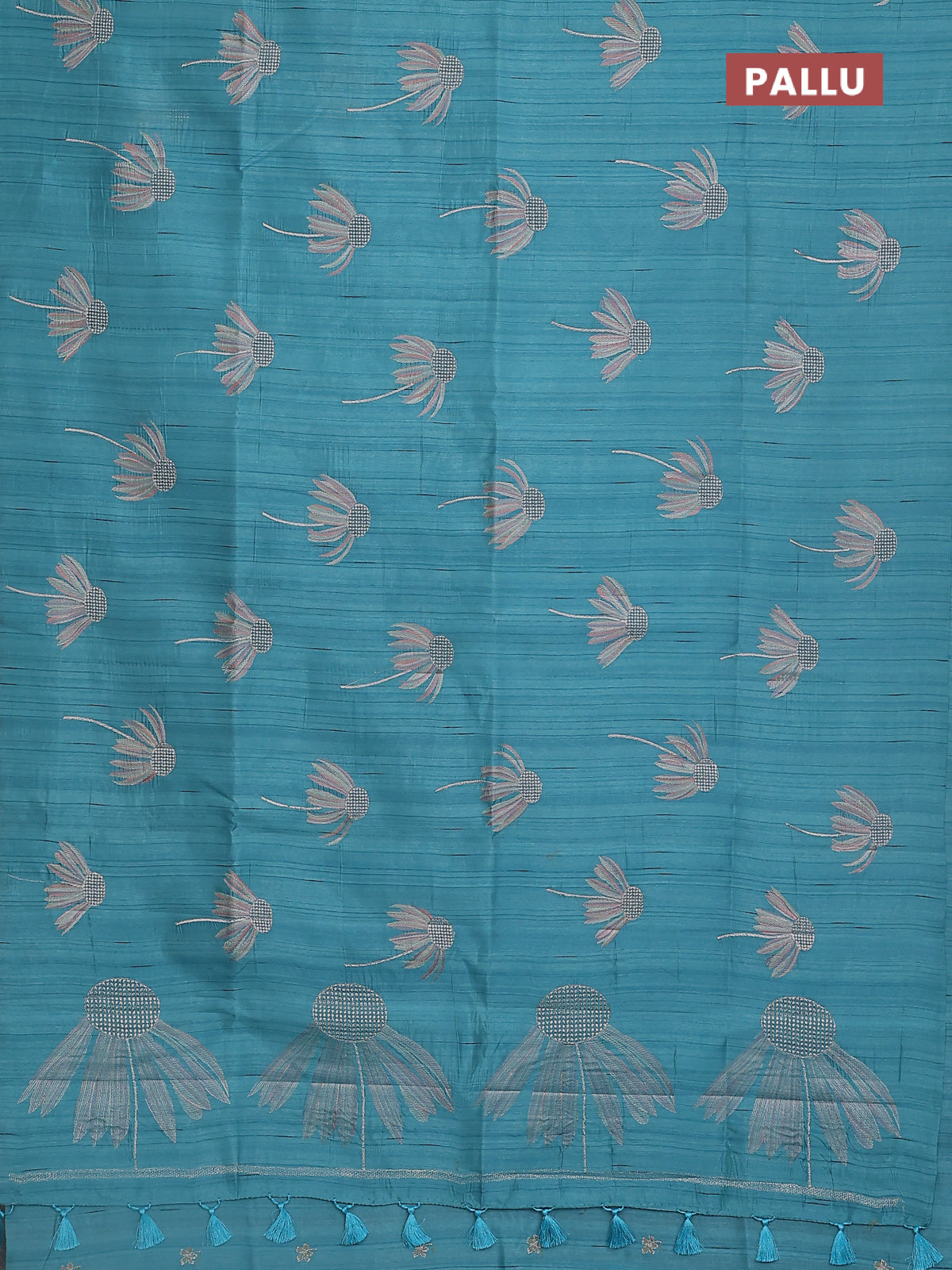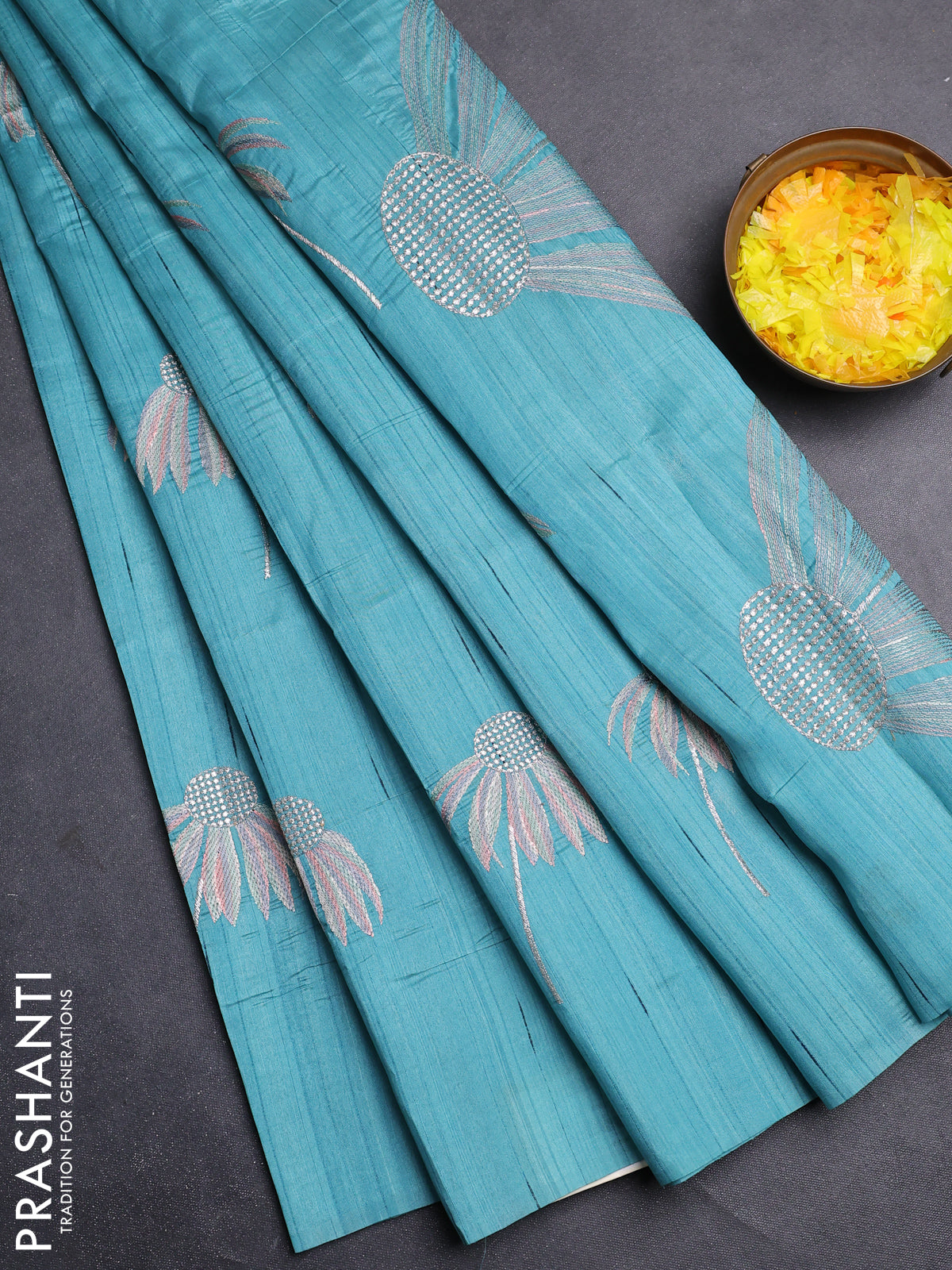 Semi raw silk saree teal blue with floral embroidery work buttas in borderless style