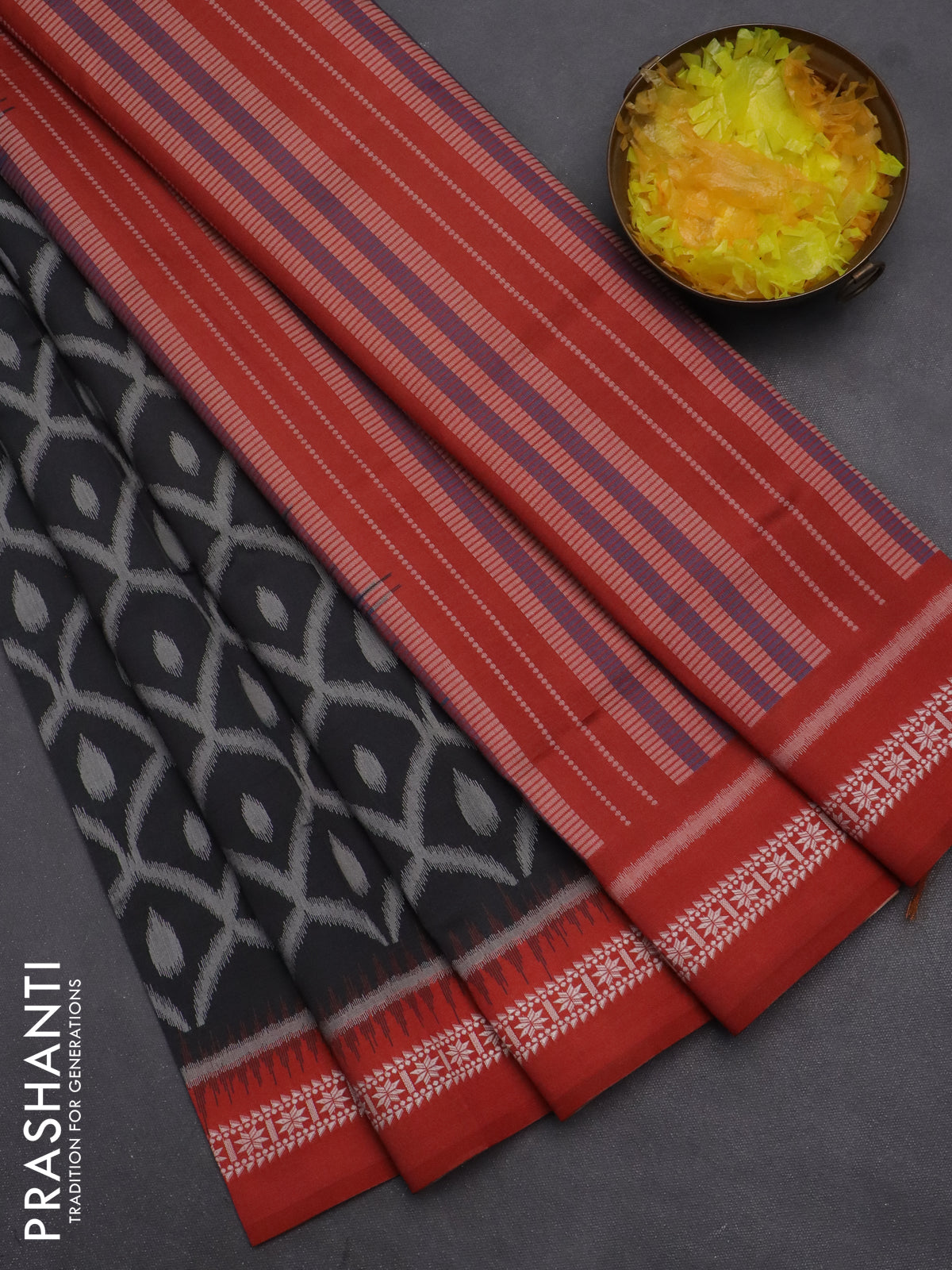 Semi sambalpuri silk saree black and rustic orange with allover ikat weaves and thread woven border