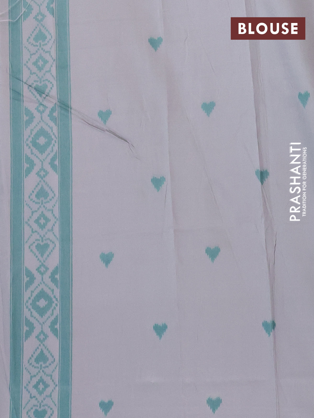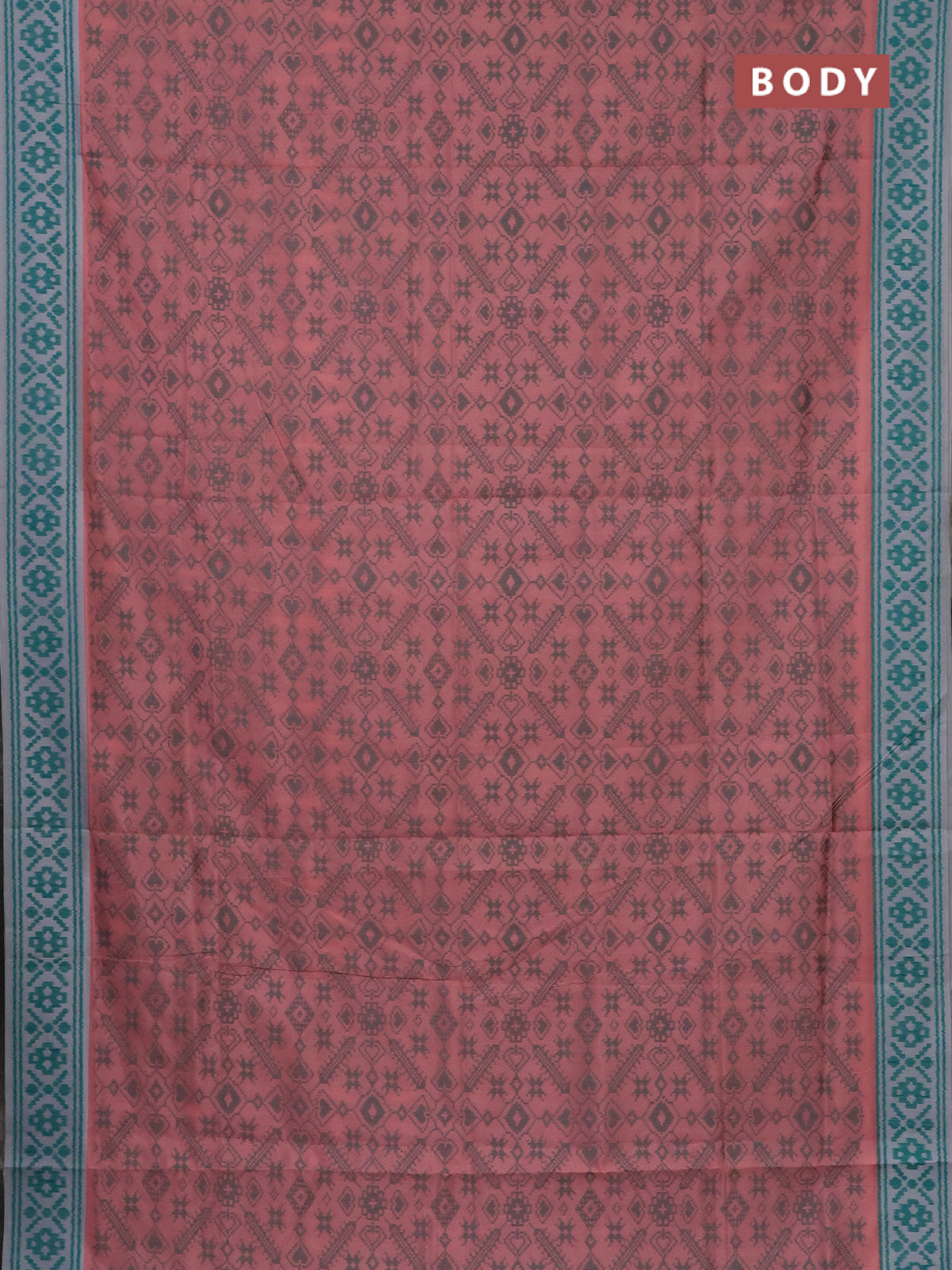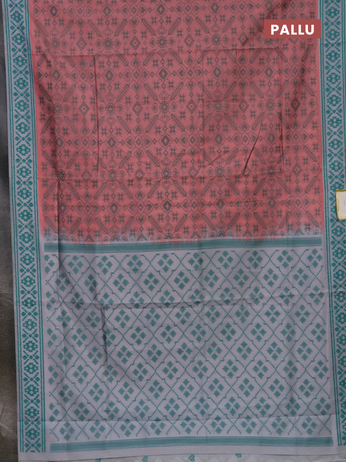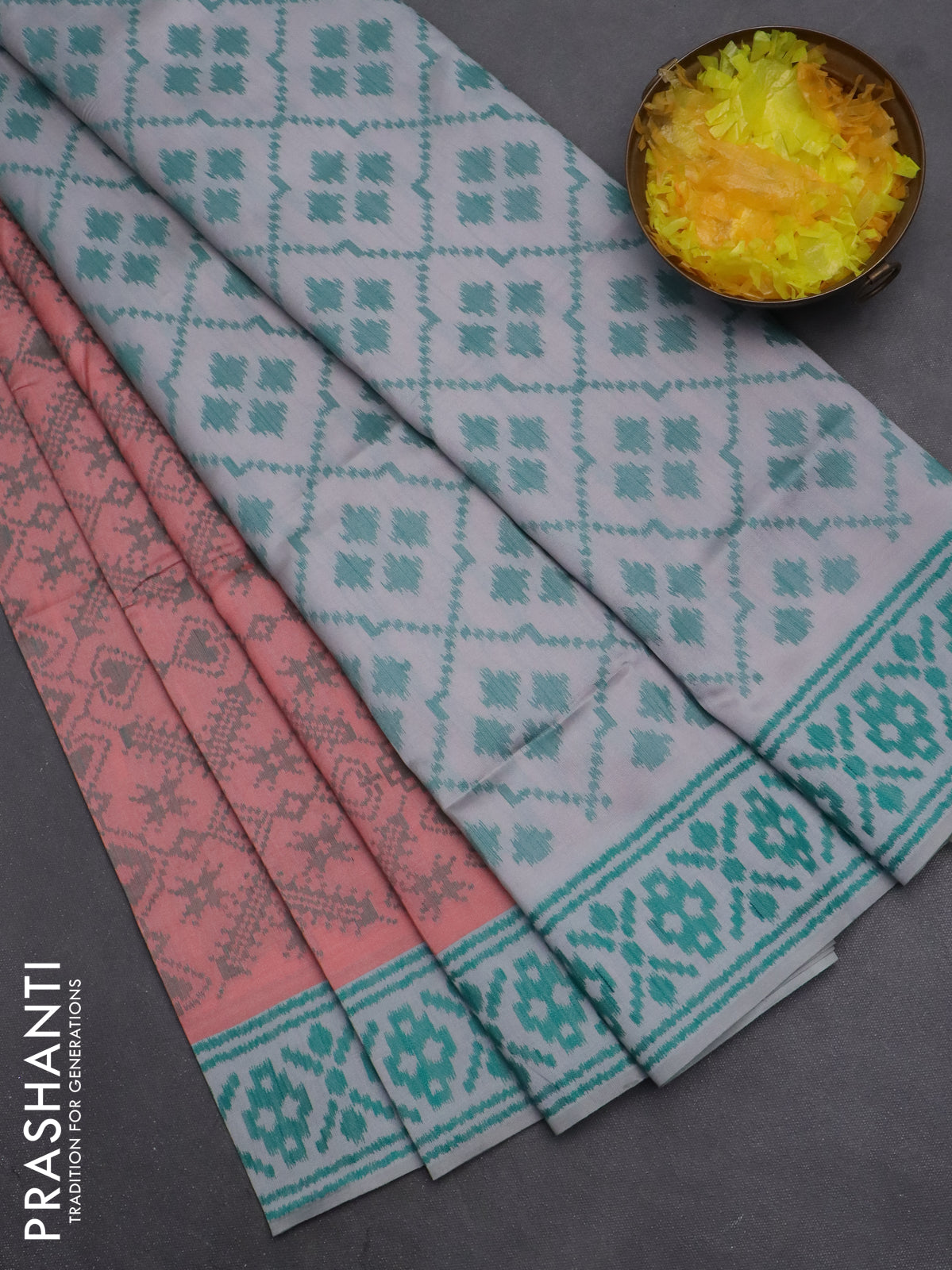 Semi sambalpuri silk saree peach shade and pastel grey teal with allover ikat weaves and thread woven border