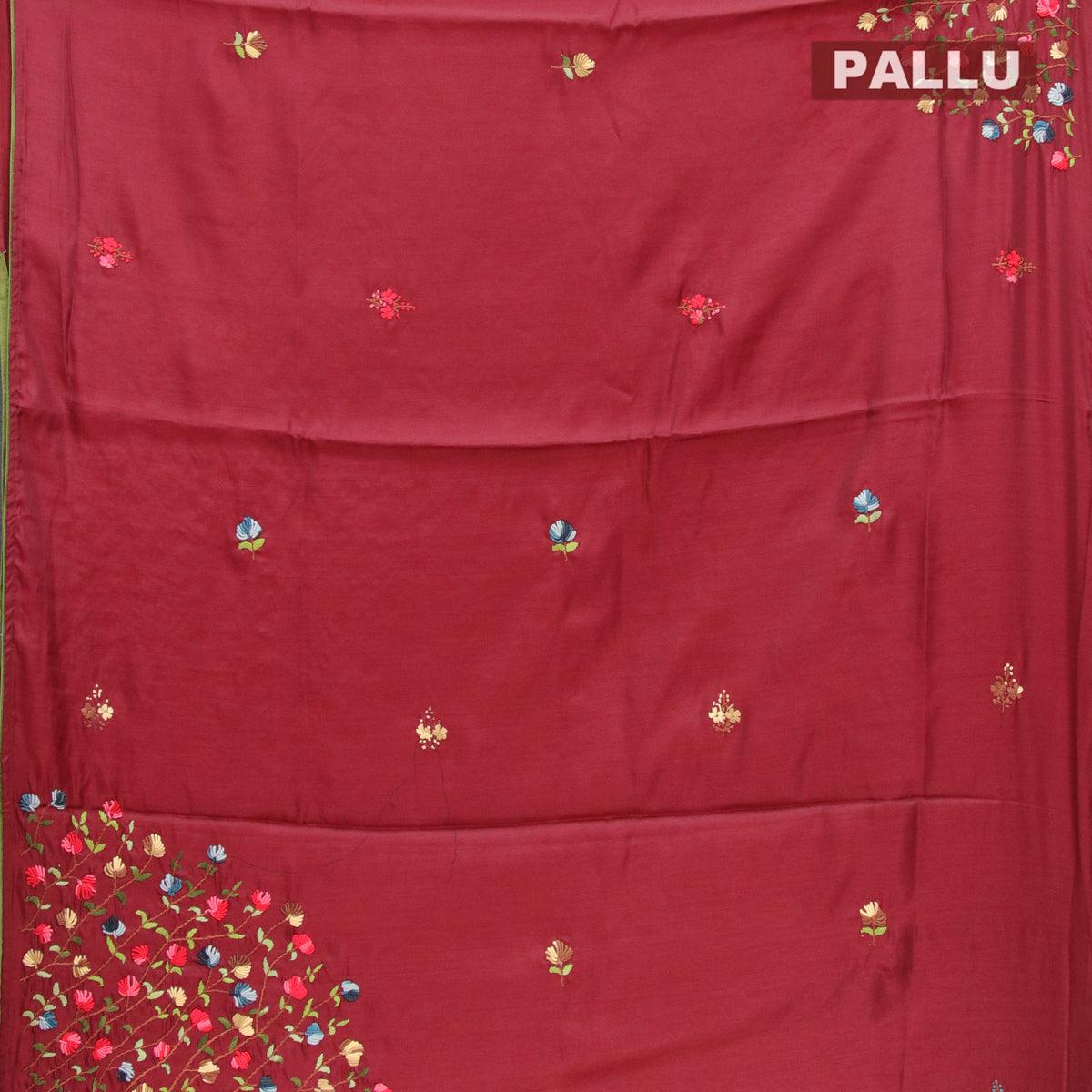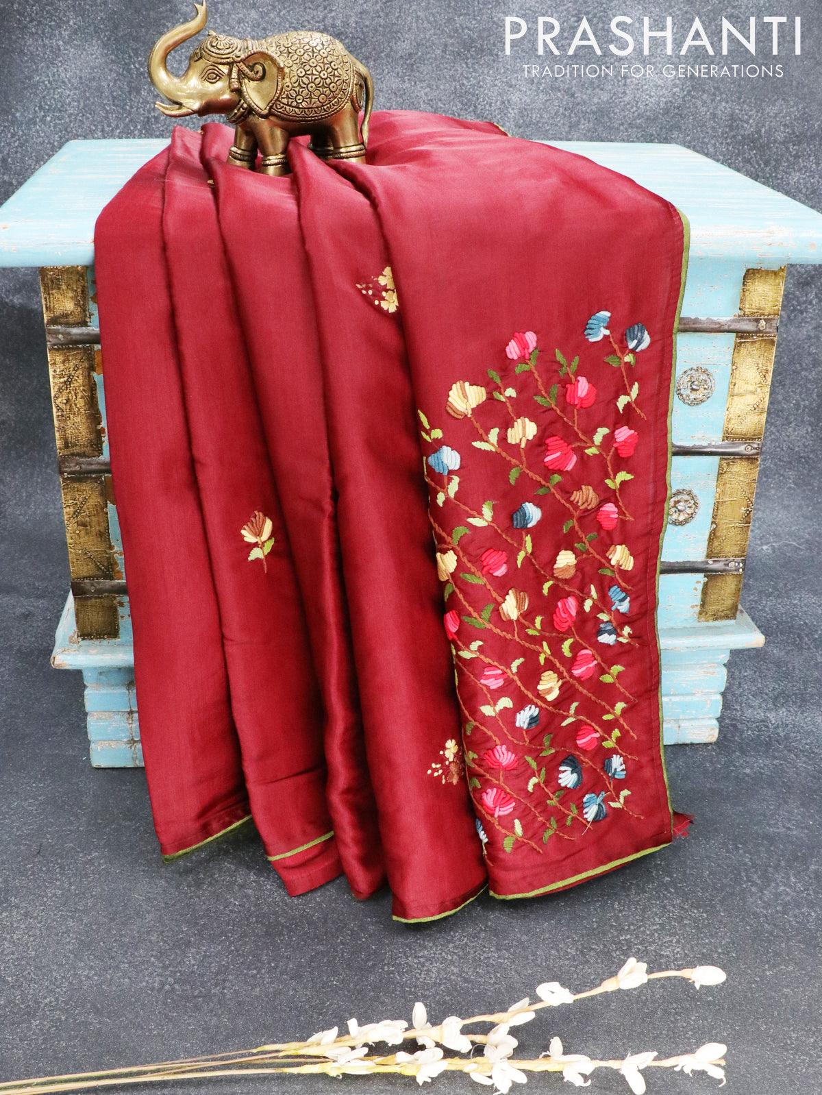 Semi satin silk saree maroon and with floral embroidery work and embroided blouse