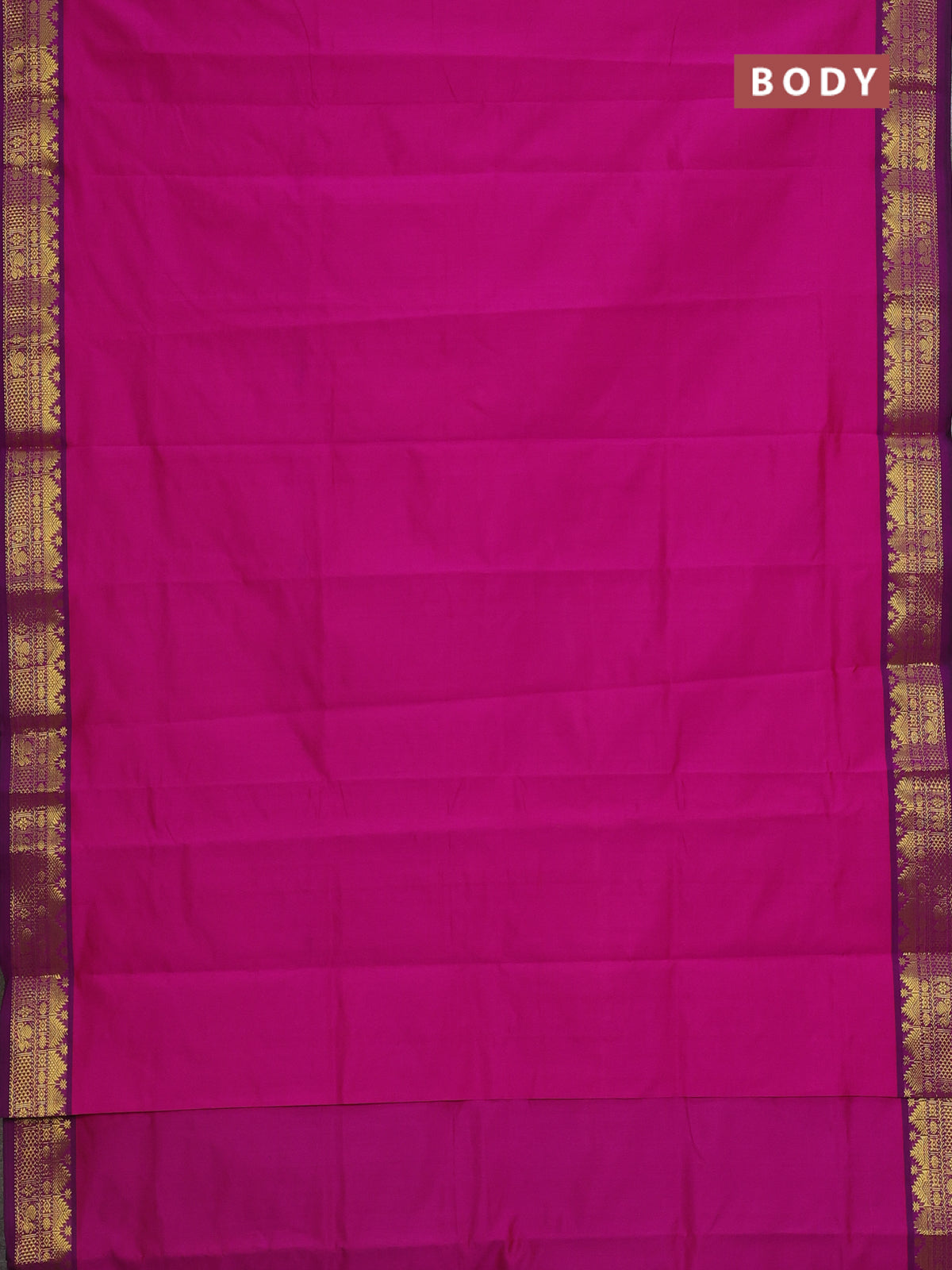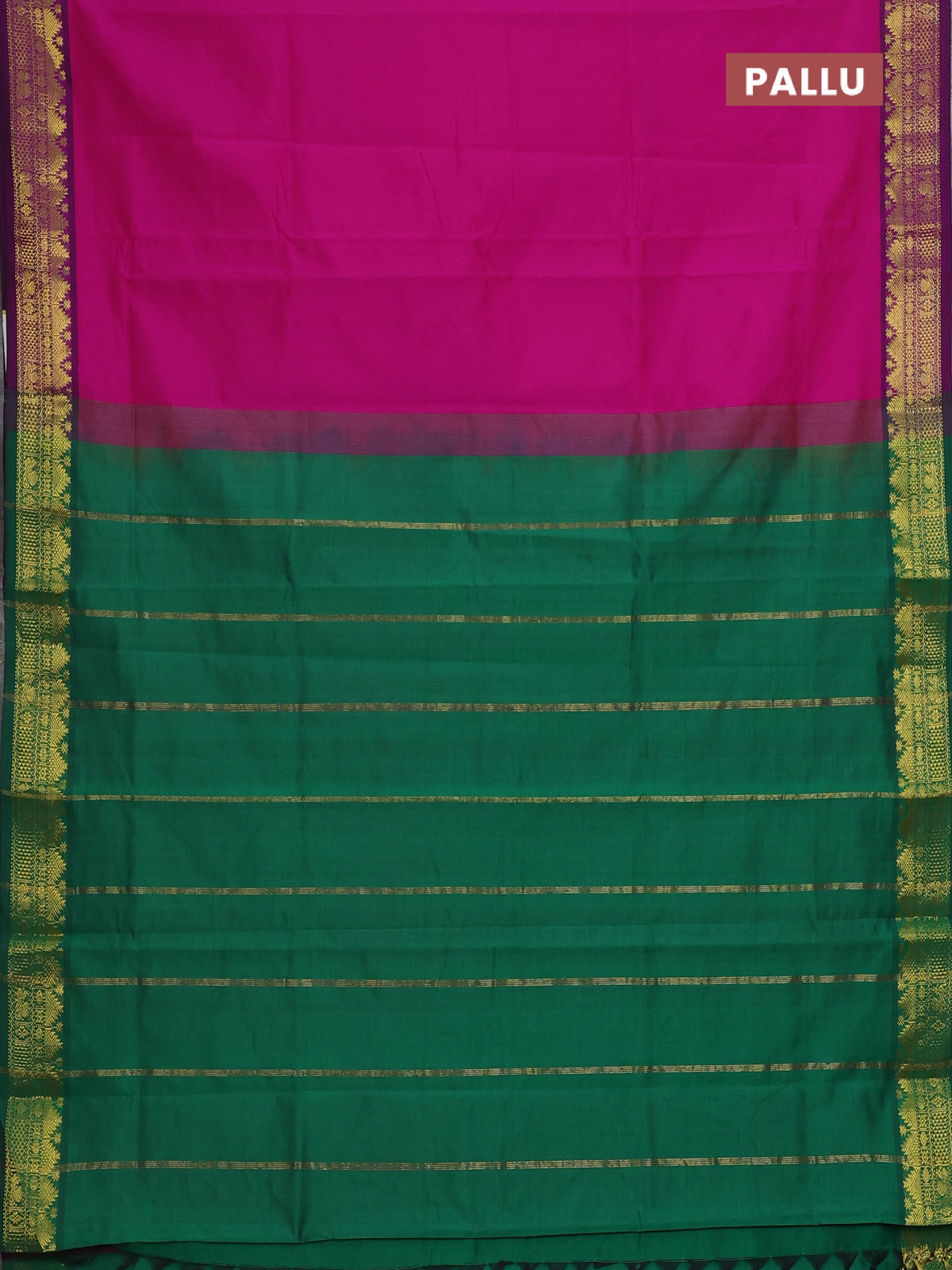 Semi silk cotton saree magenta pink and green with plain body and zari woven border