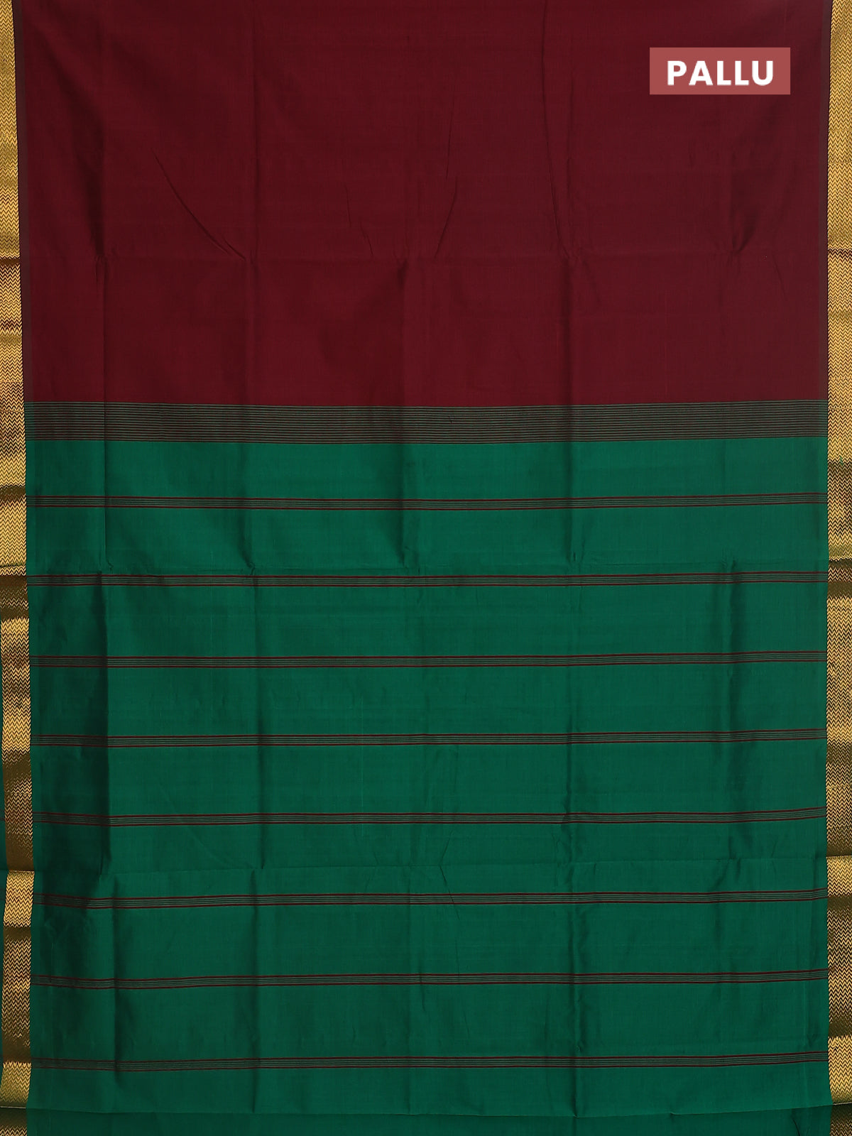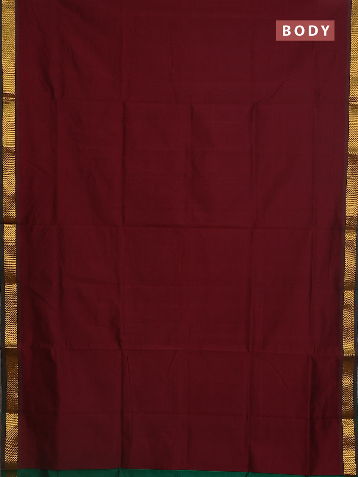 Semi silk cotton saree maroon and green with plain body and zari woven border