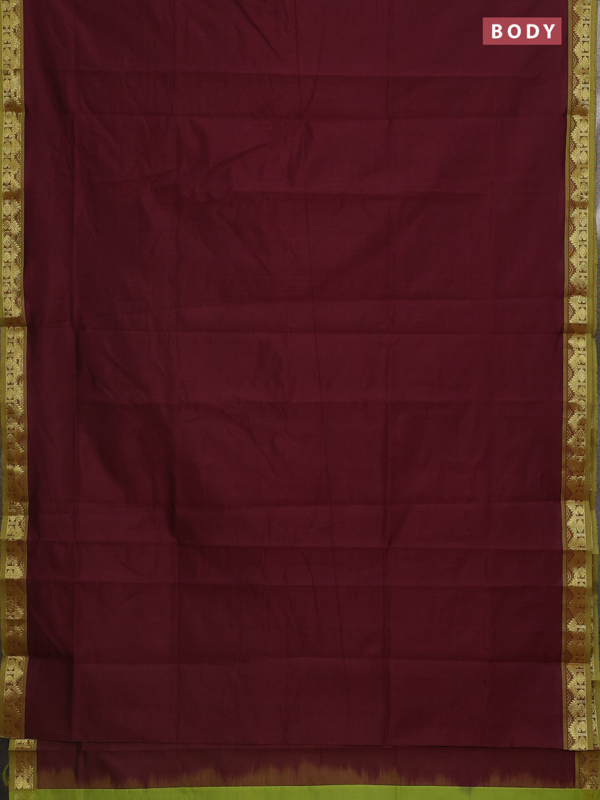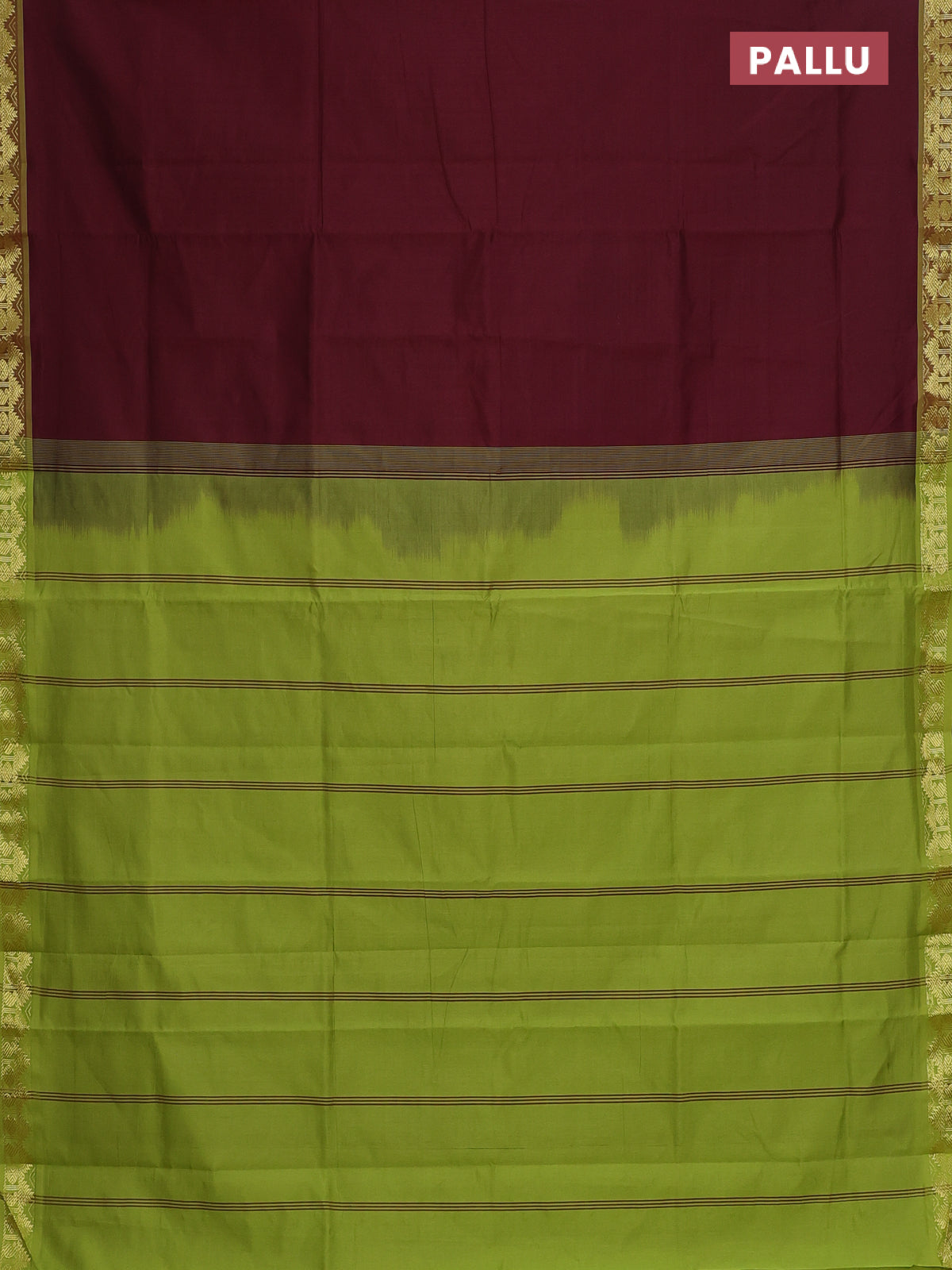 Semi silk cotton saree maroon and light green with plain body and zari woven border