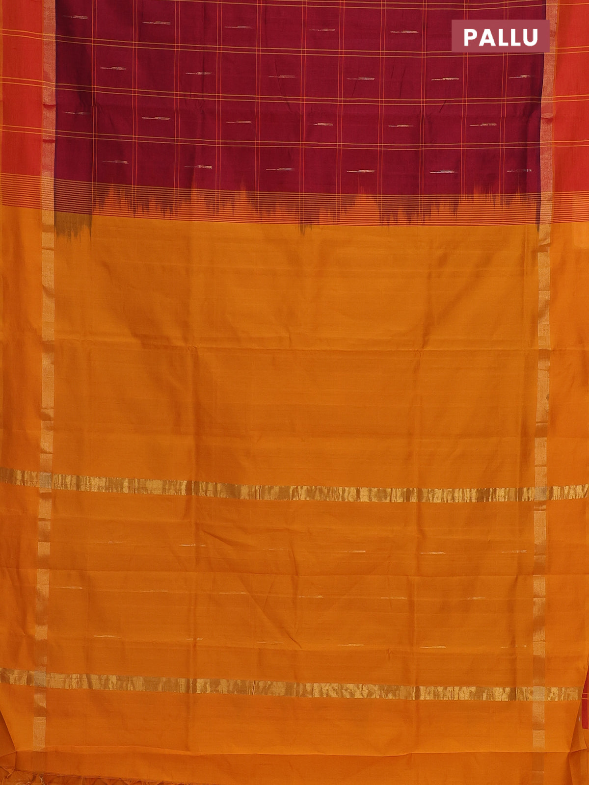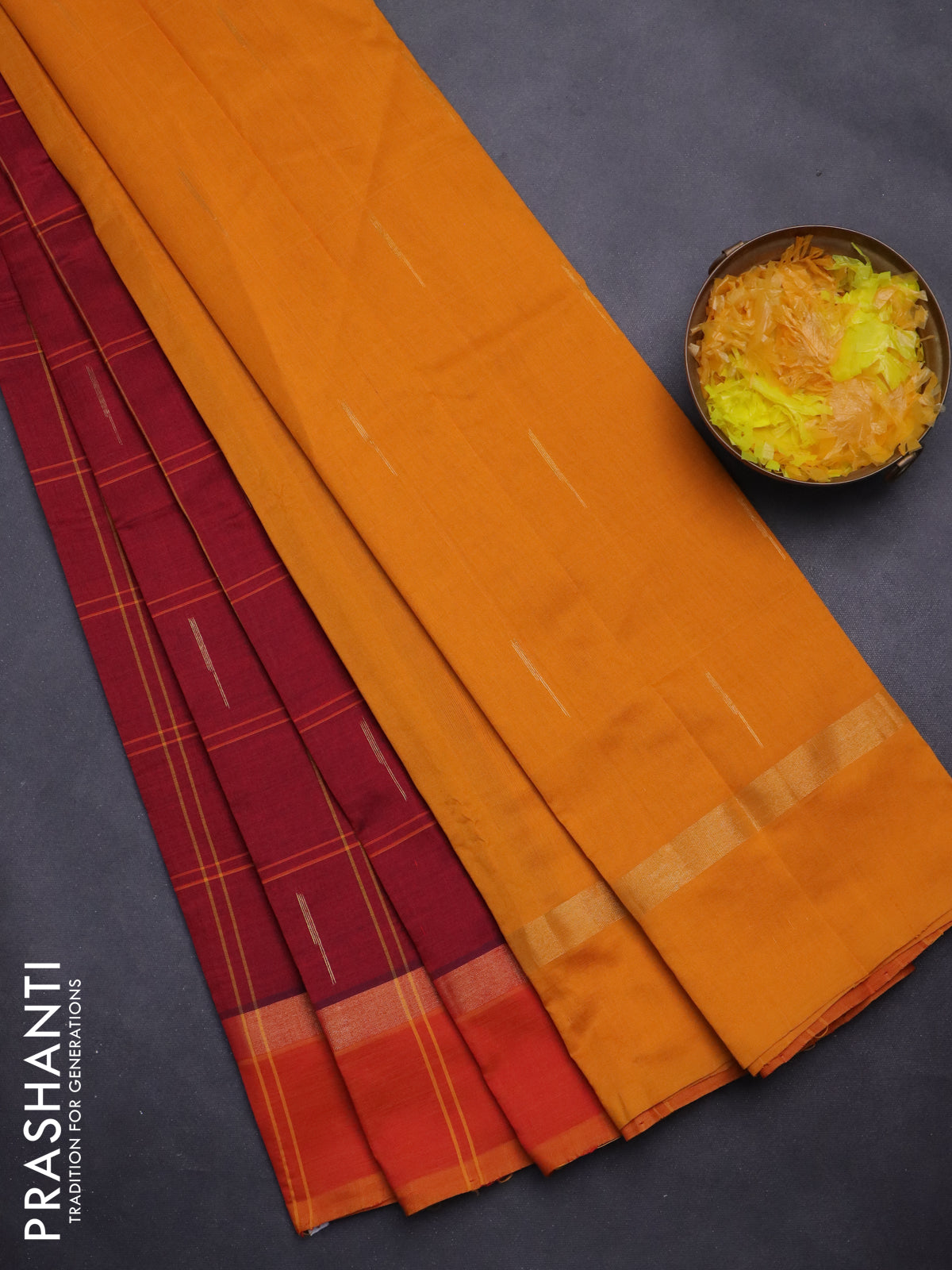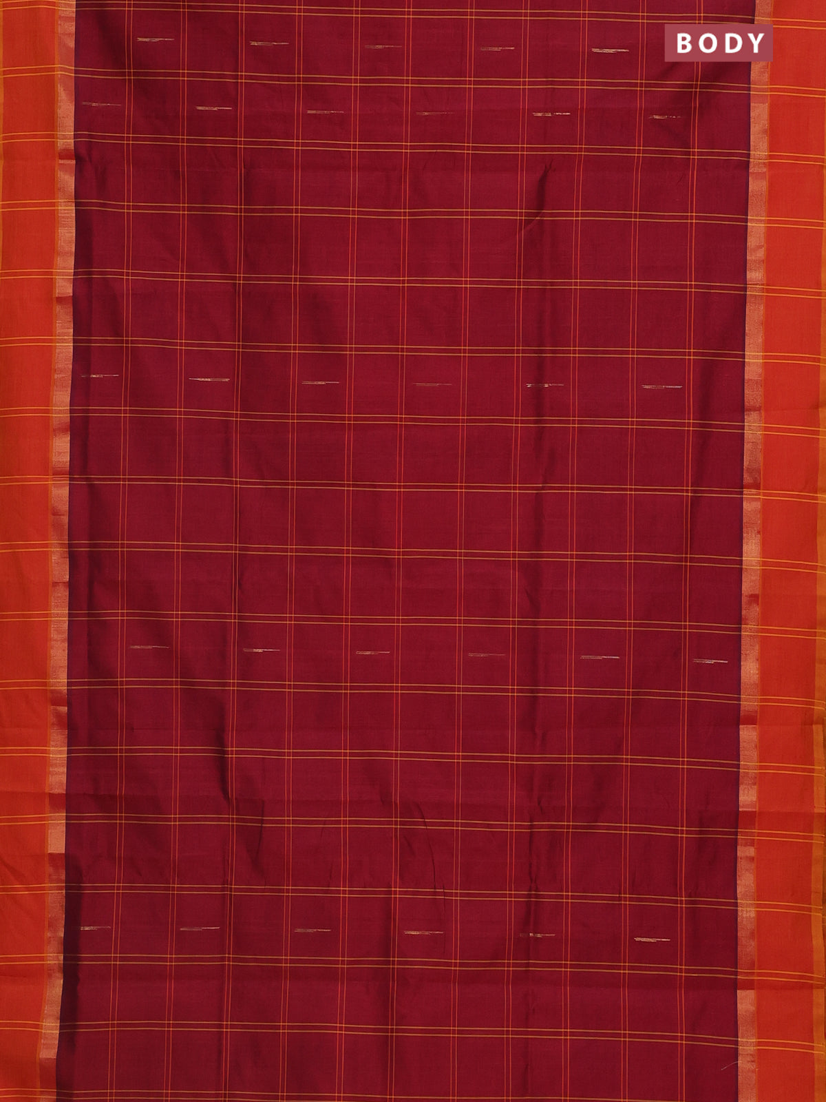 Semi silk cotton saree maroon and mustard yellow with allover checks & zari buttas and zari woven simple border
