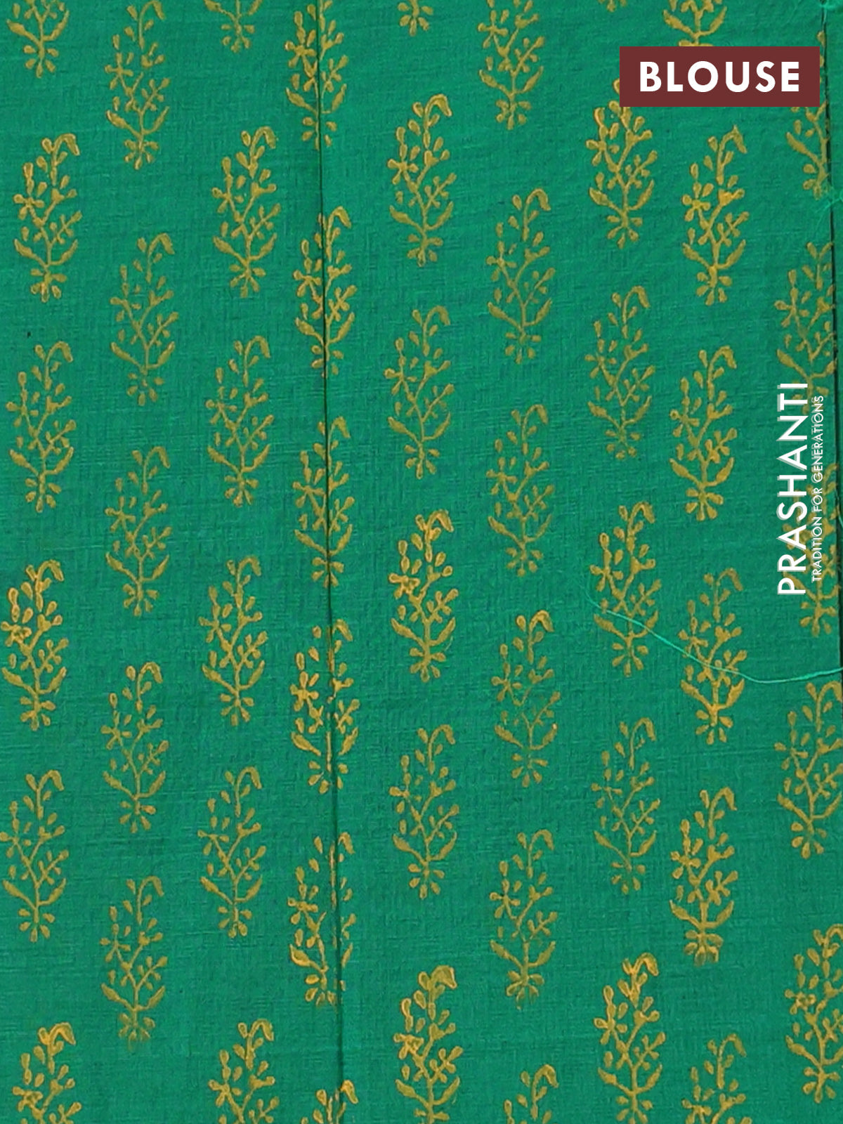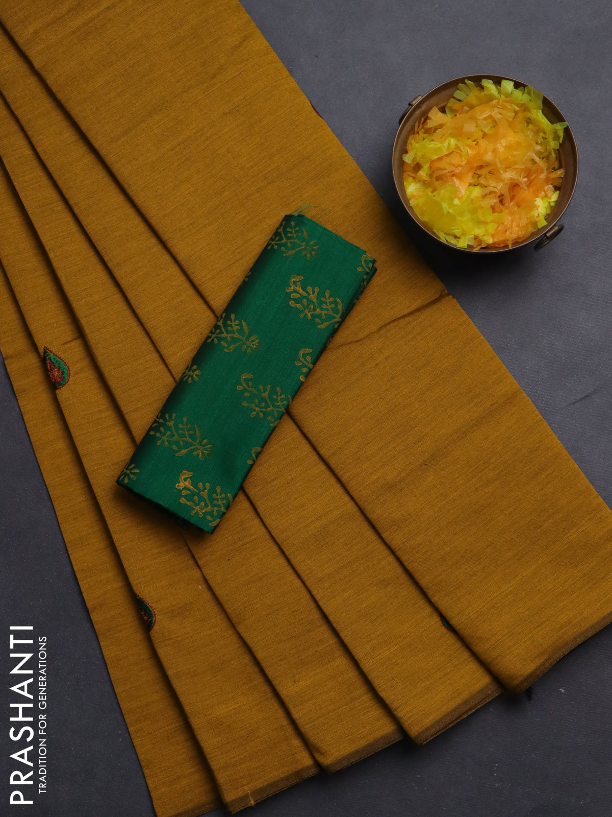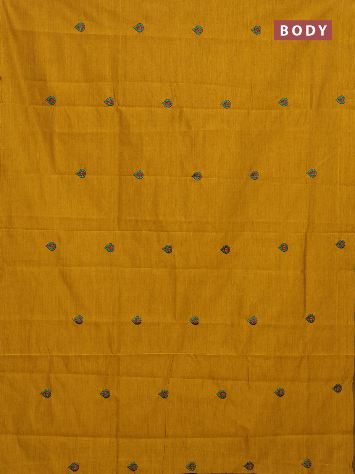 Semi silk cotton saree mustard yellow and green with embroided buttas in borderless style