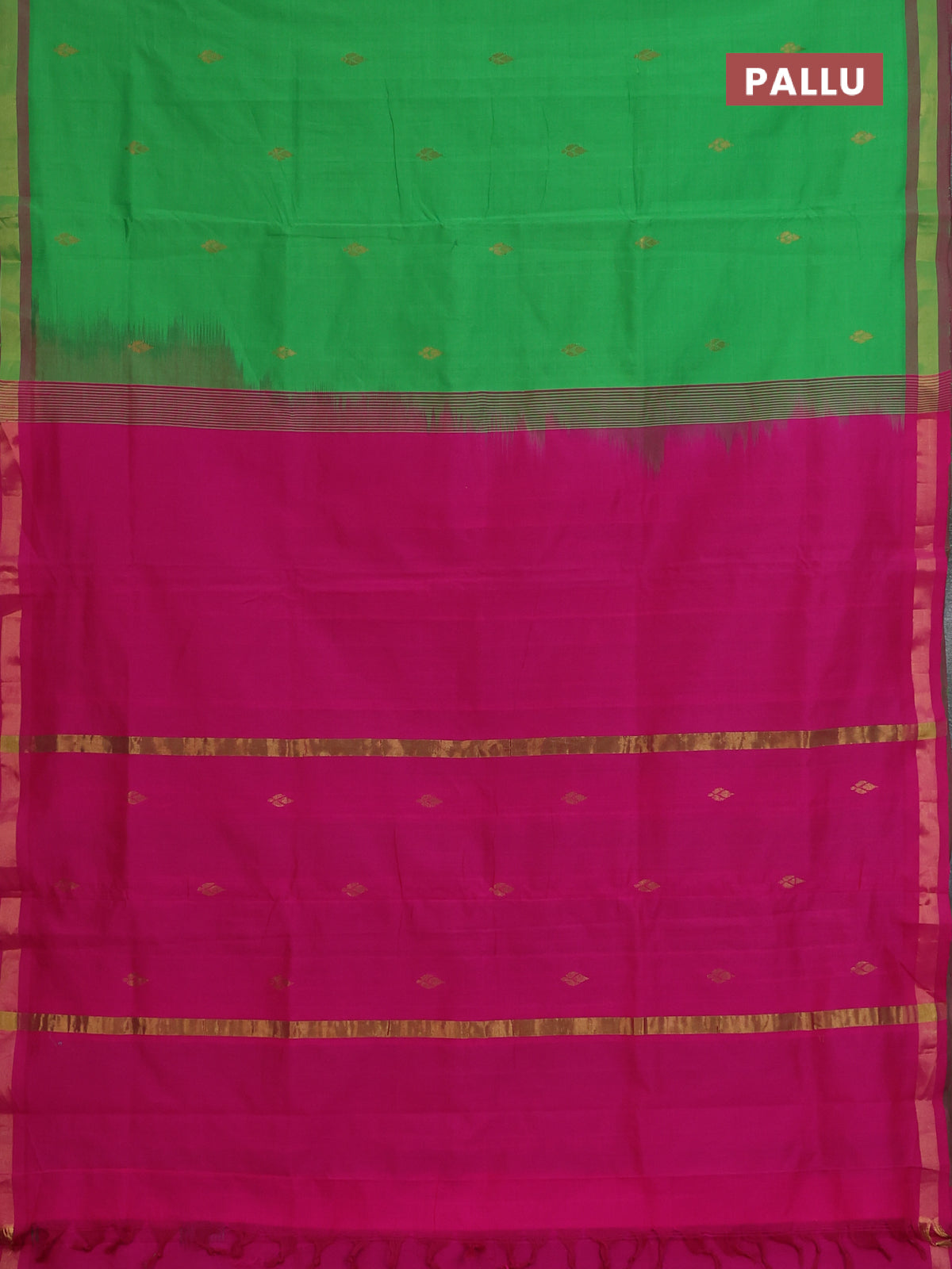 Semi silk cotton saree parrot green and pink and zari woven buttas and zari woven border