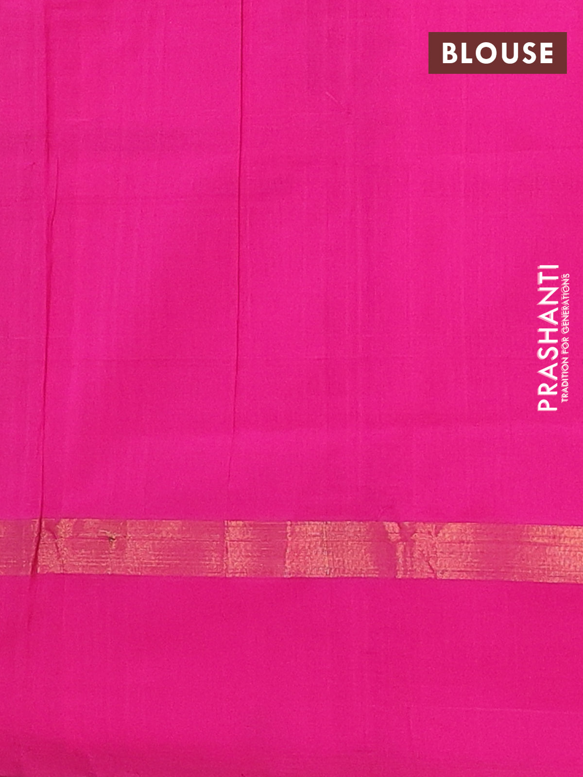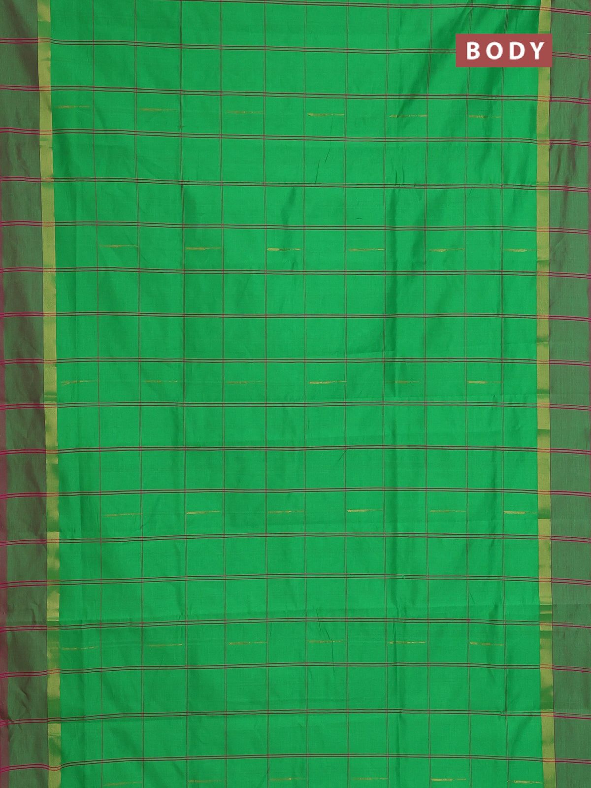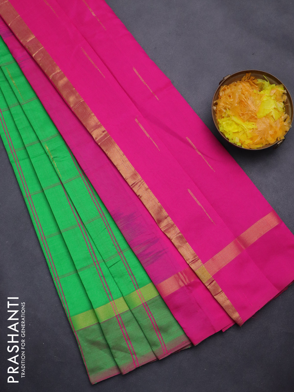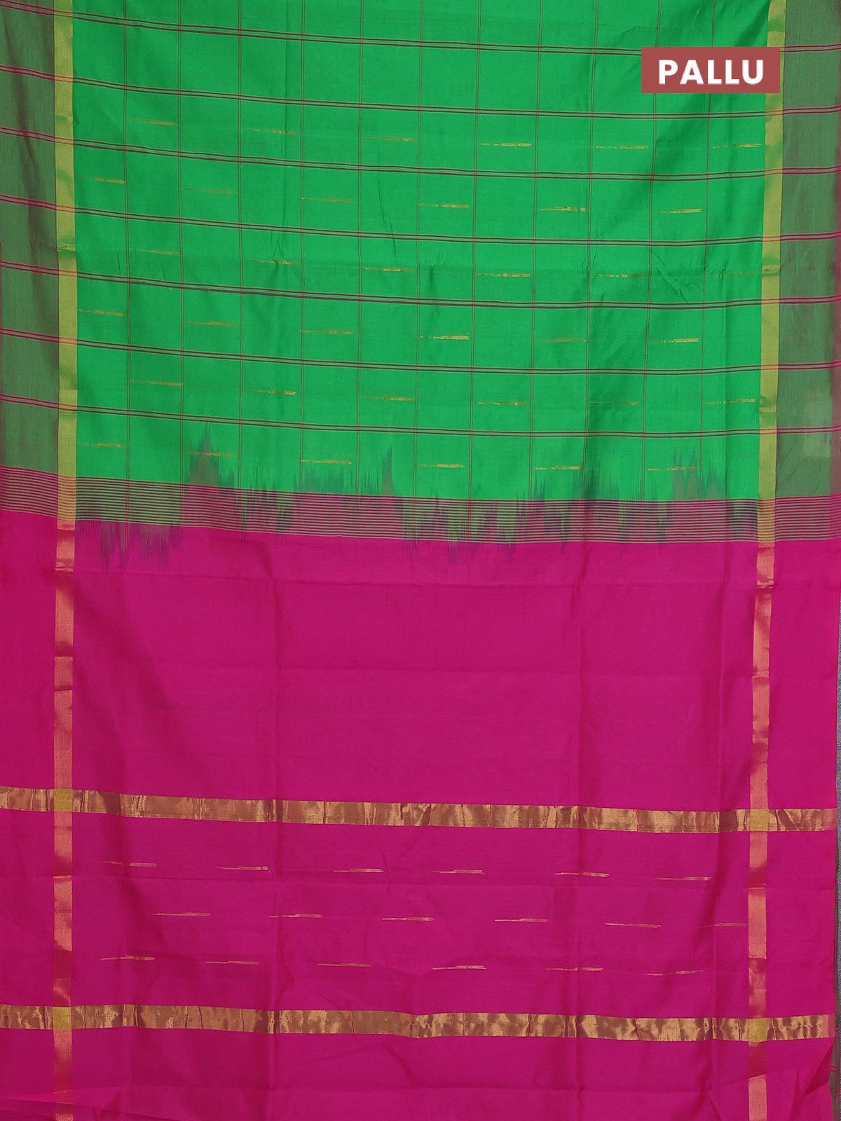 Semi silk cotton saree parrot green and pink with allover checks & zari buttas and zari woven simple border