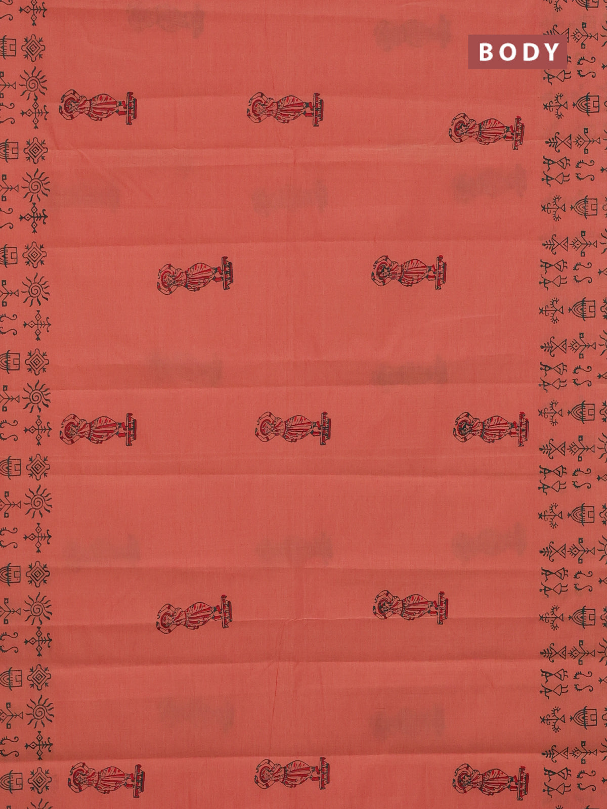 Semi silk cotton saree peach shade and green with butta prints and printed border
