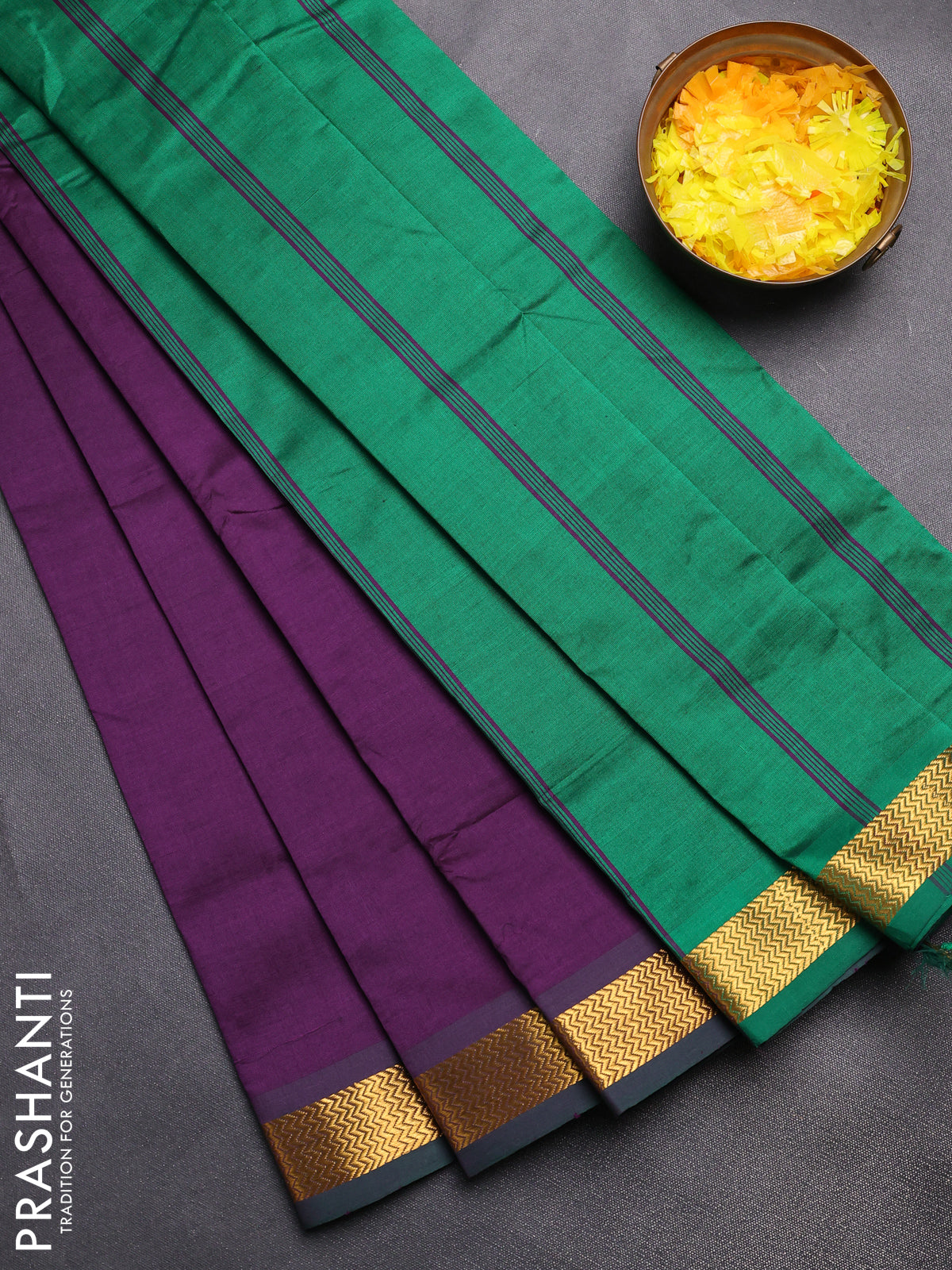 Semi silk cotton saree purple and green with plain body and zari woven border