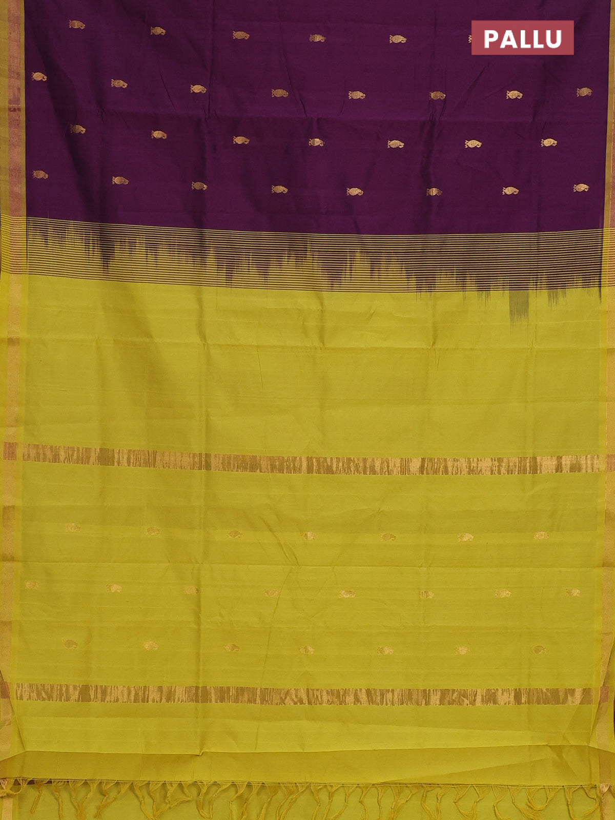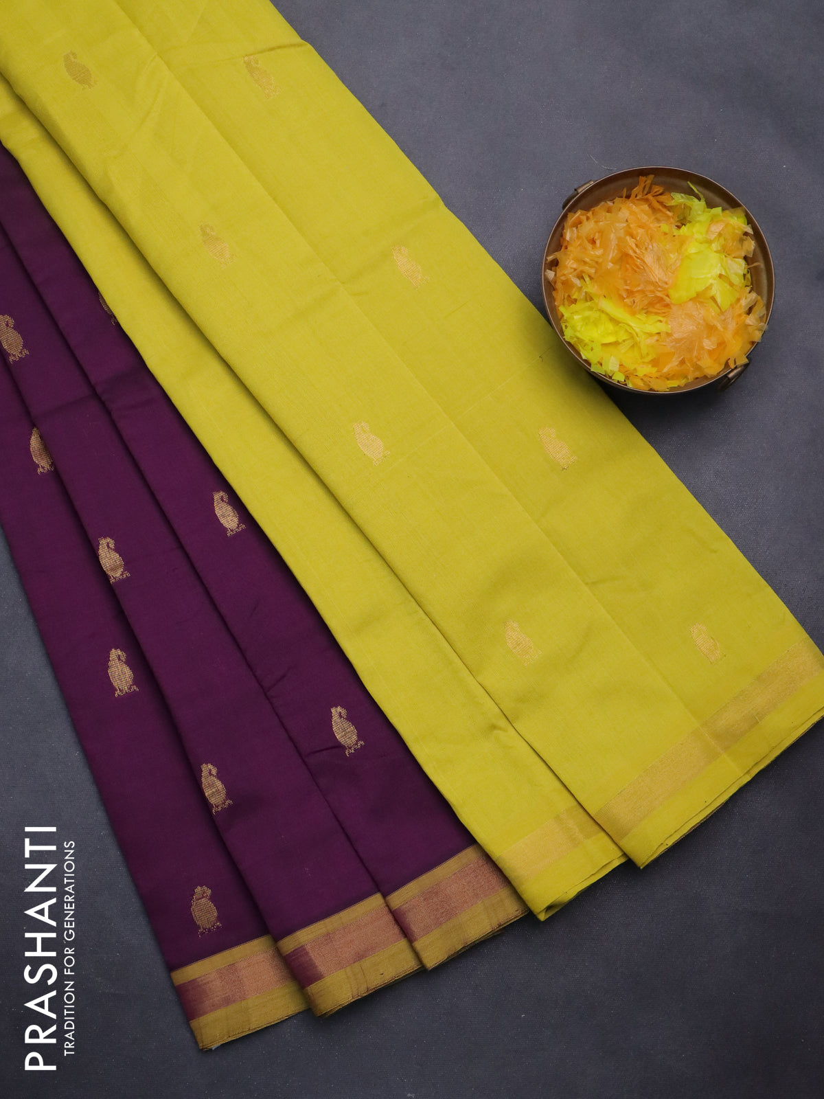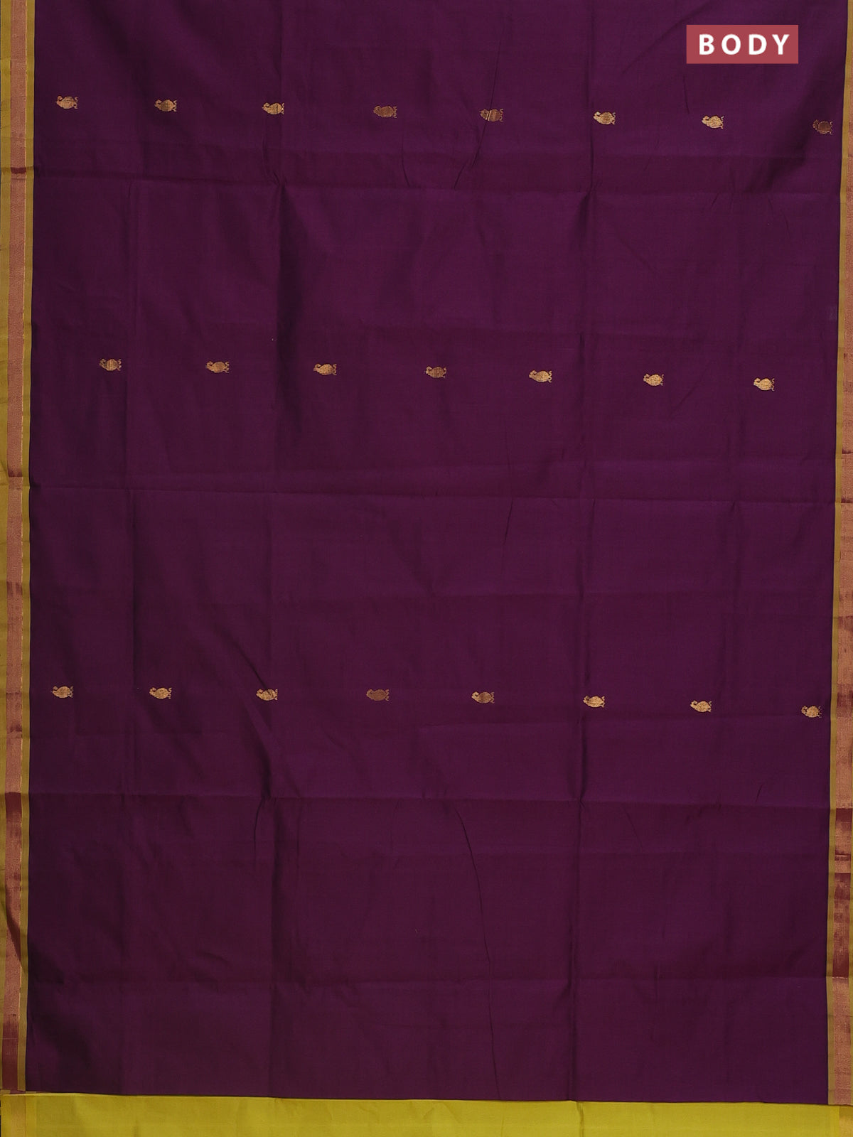 Semi silk cotton saree purple and yellow with zari woven buttas and zari woven border