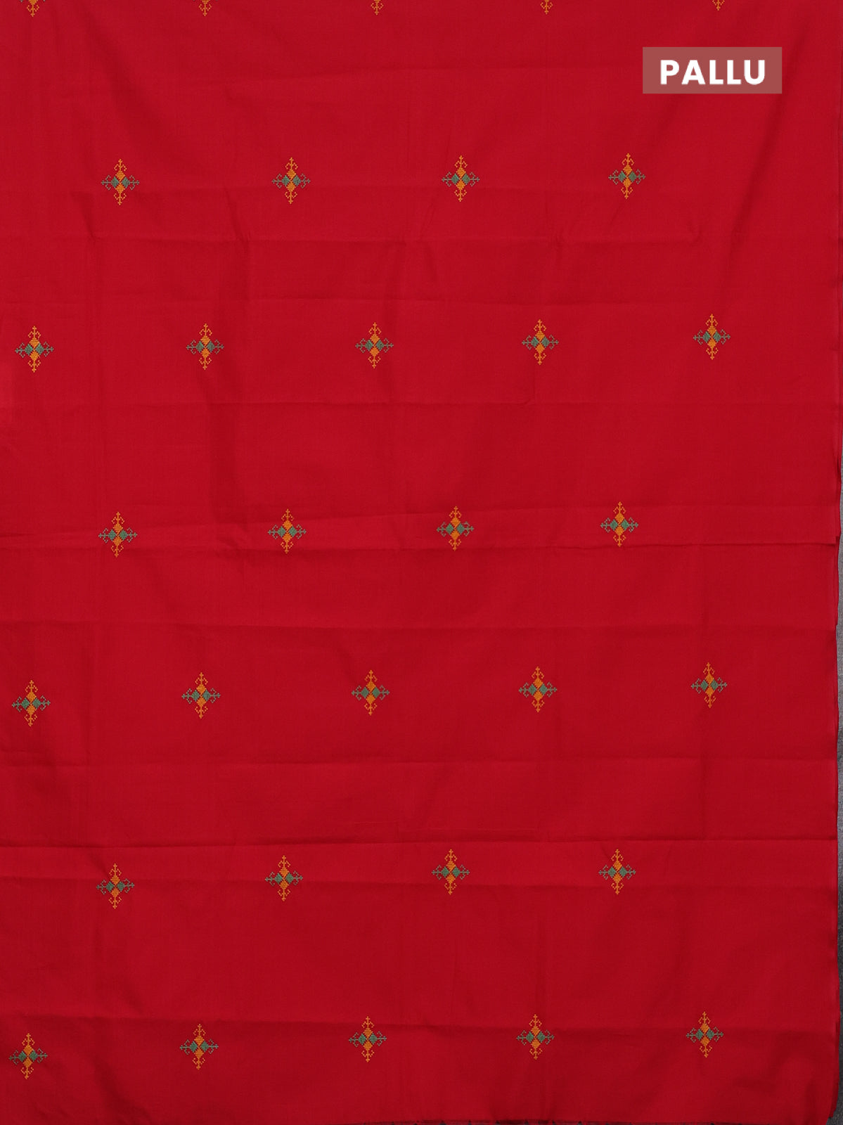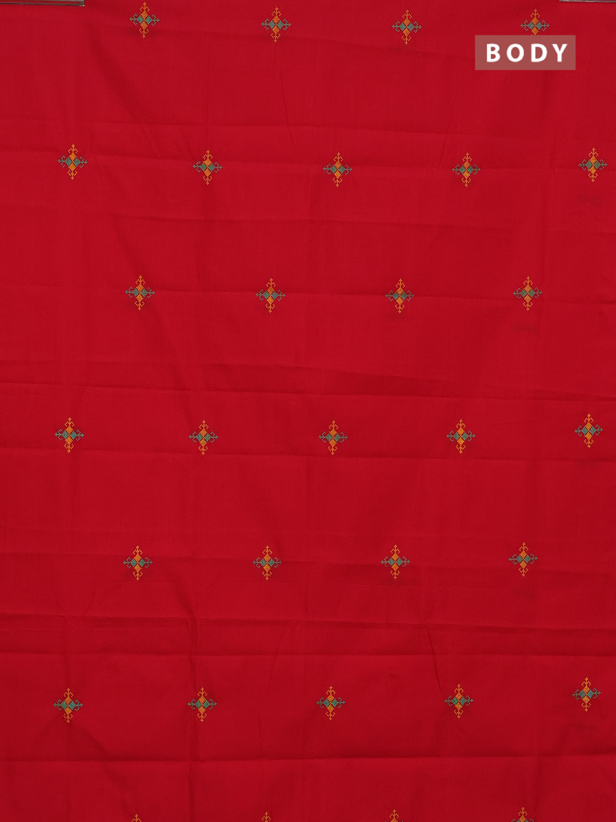 Semi silk cotton saree red and teal green with embroided buttas in borderless style