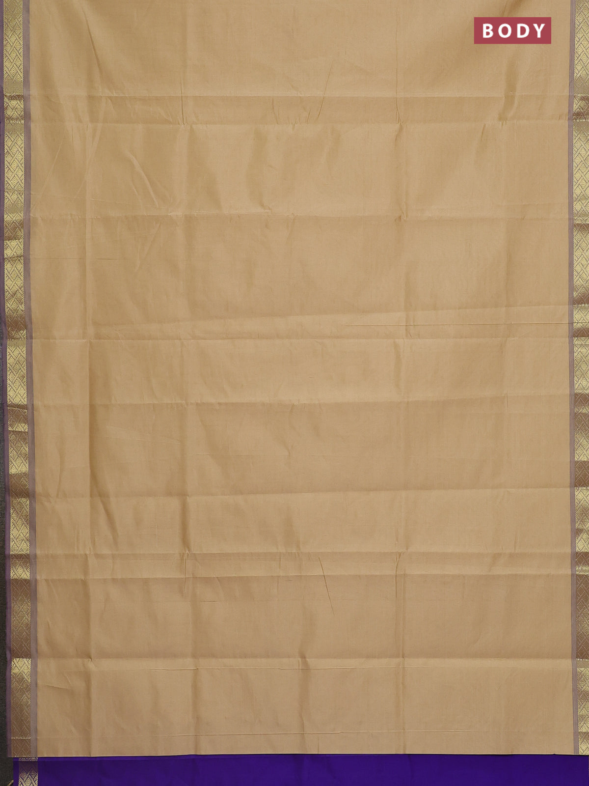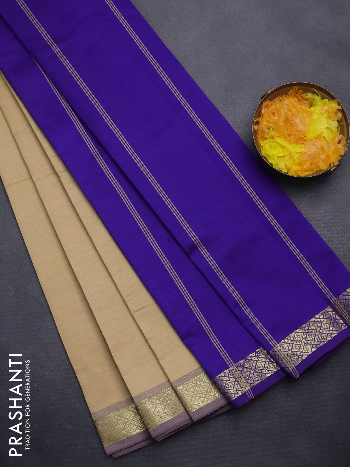 Semi silk cotton saree sandal and violet with plain body and zari woven border
