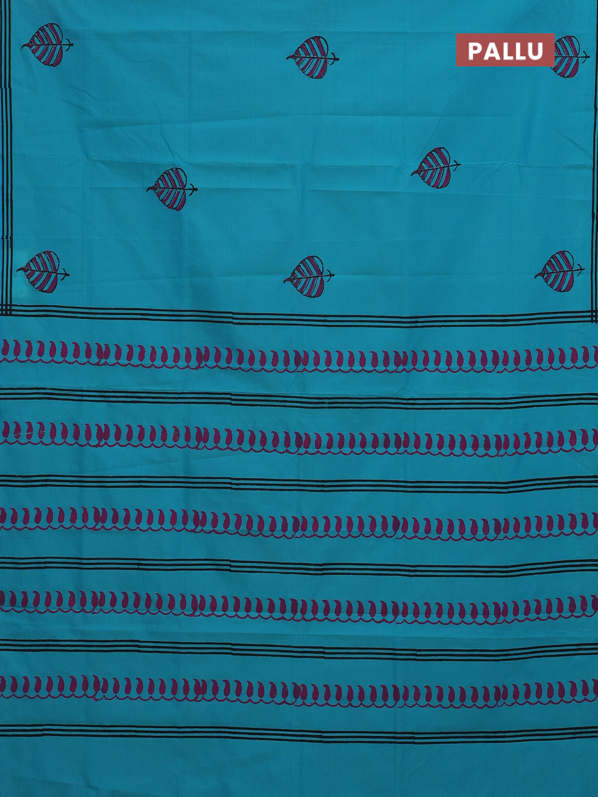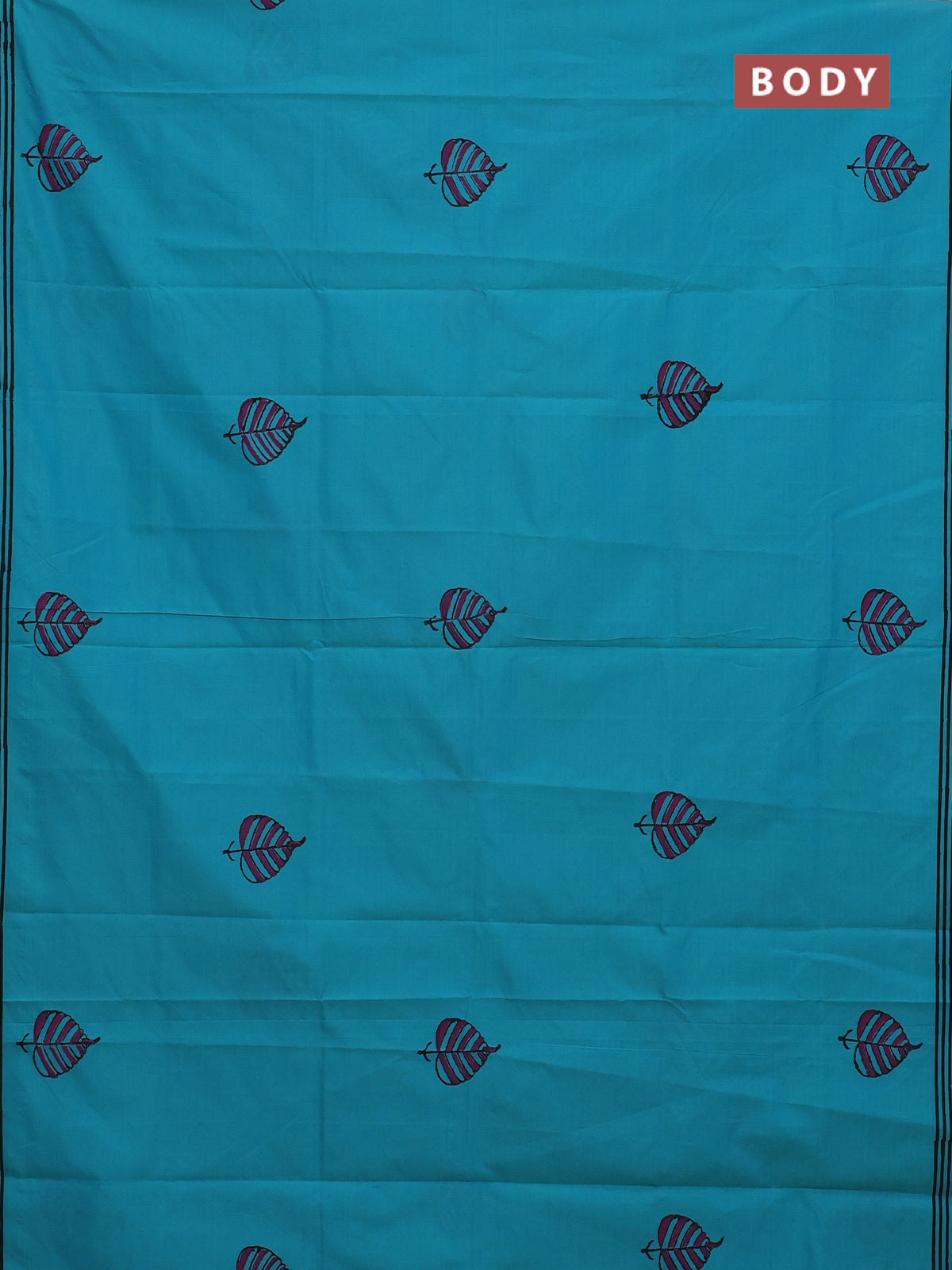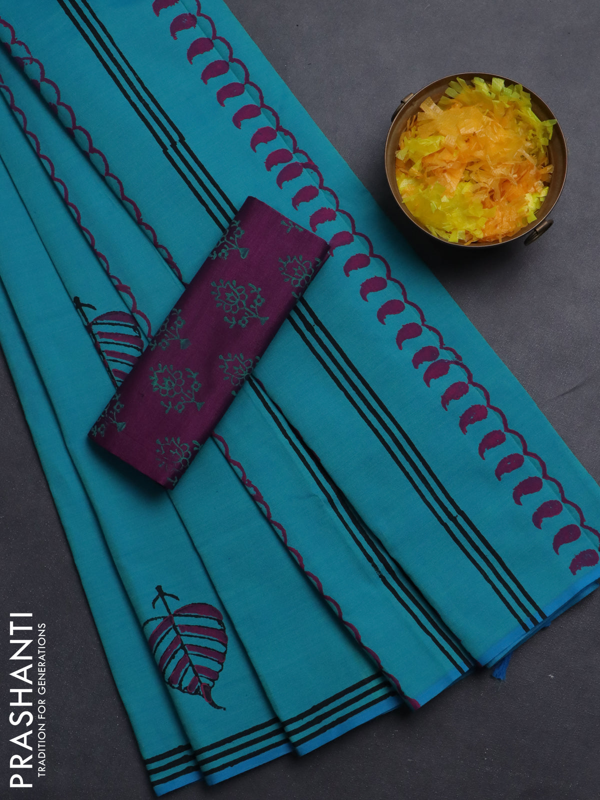 Semi silk cotton saree teal blue and wine shade with leaf butta prints and printed border