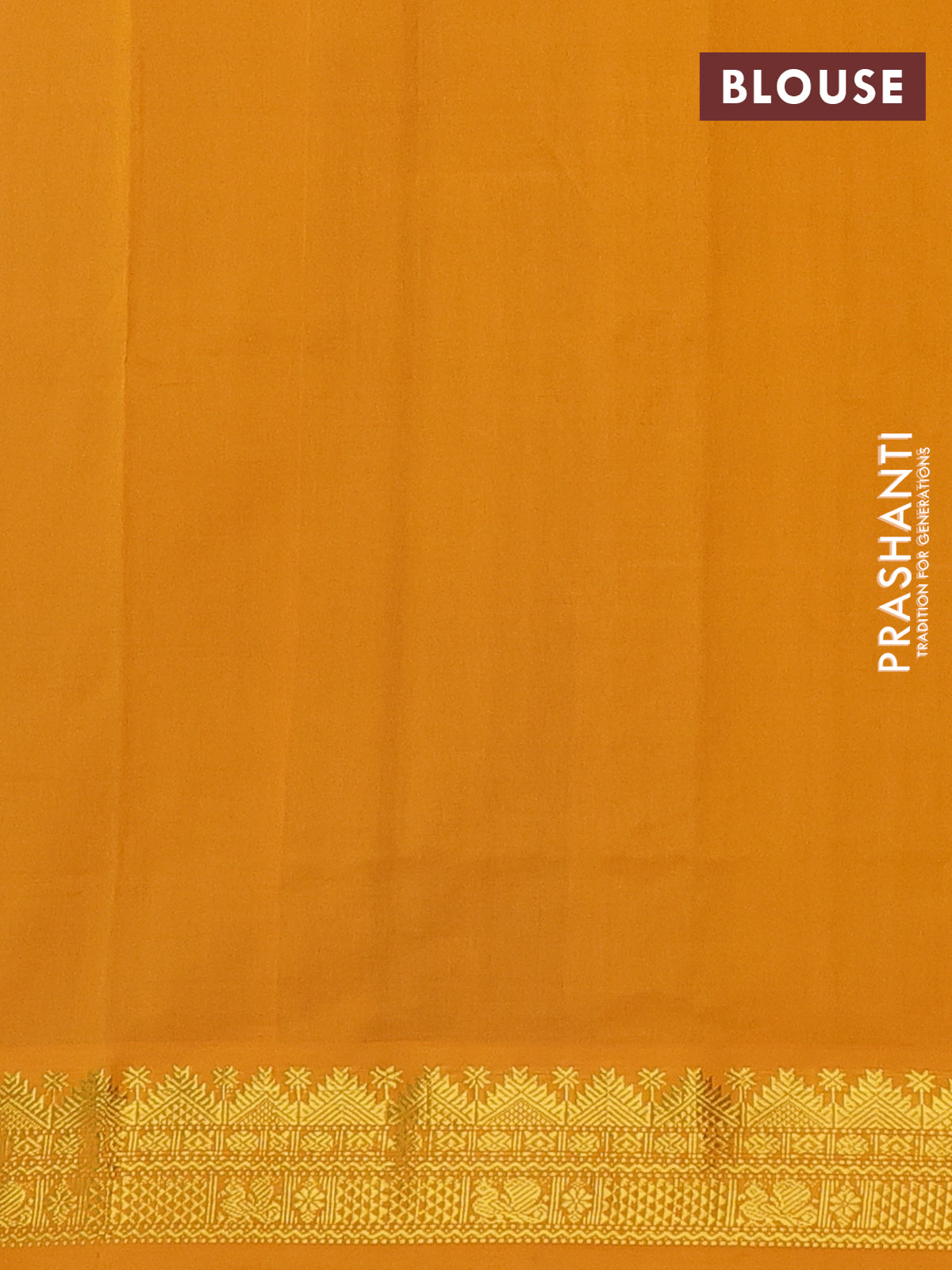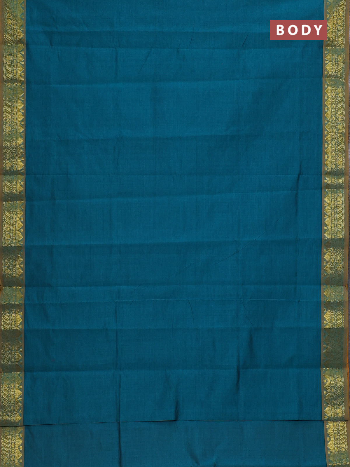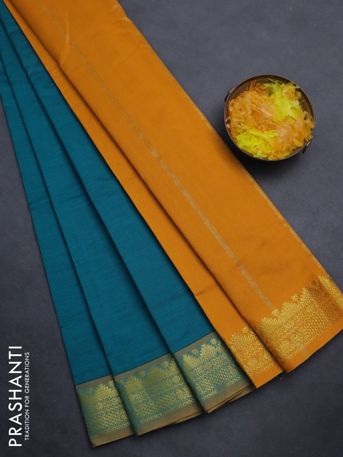 Semi silk cotton saree teal green and mango yellow with plain body and zari woven border