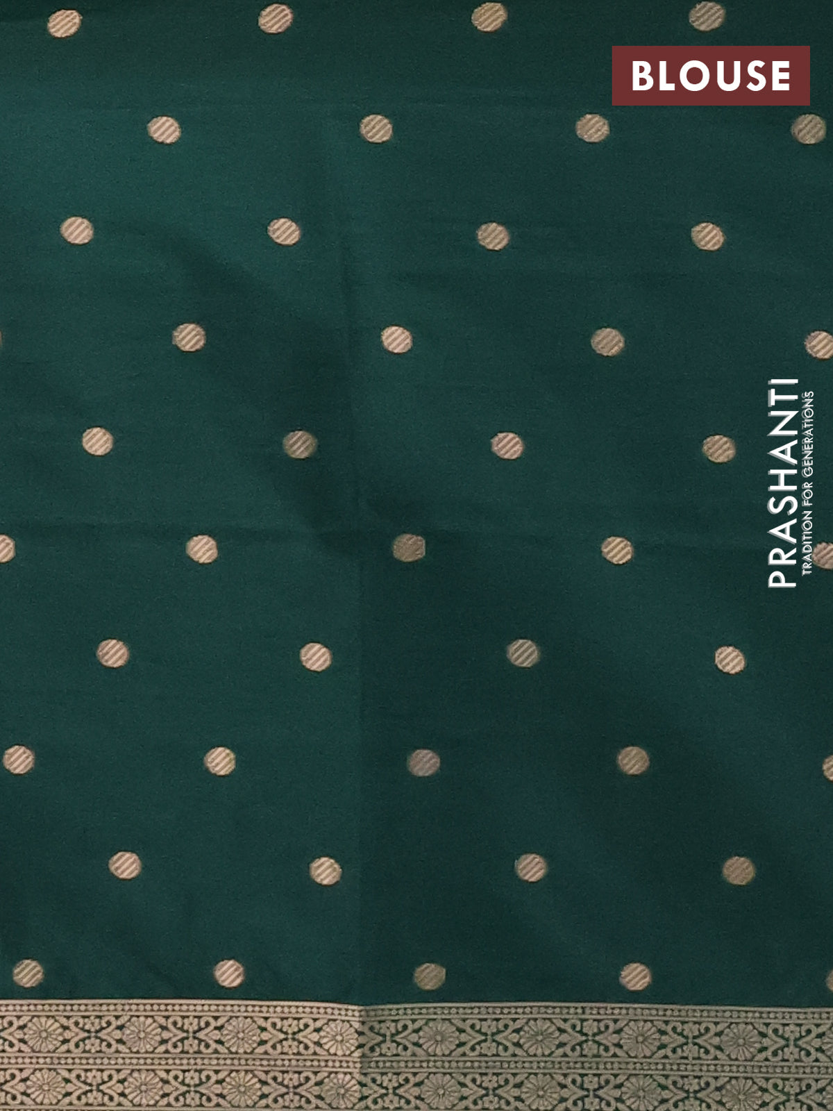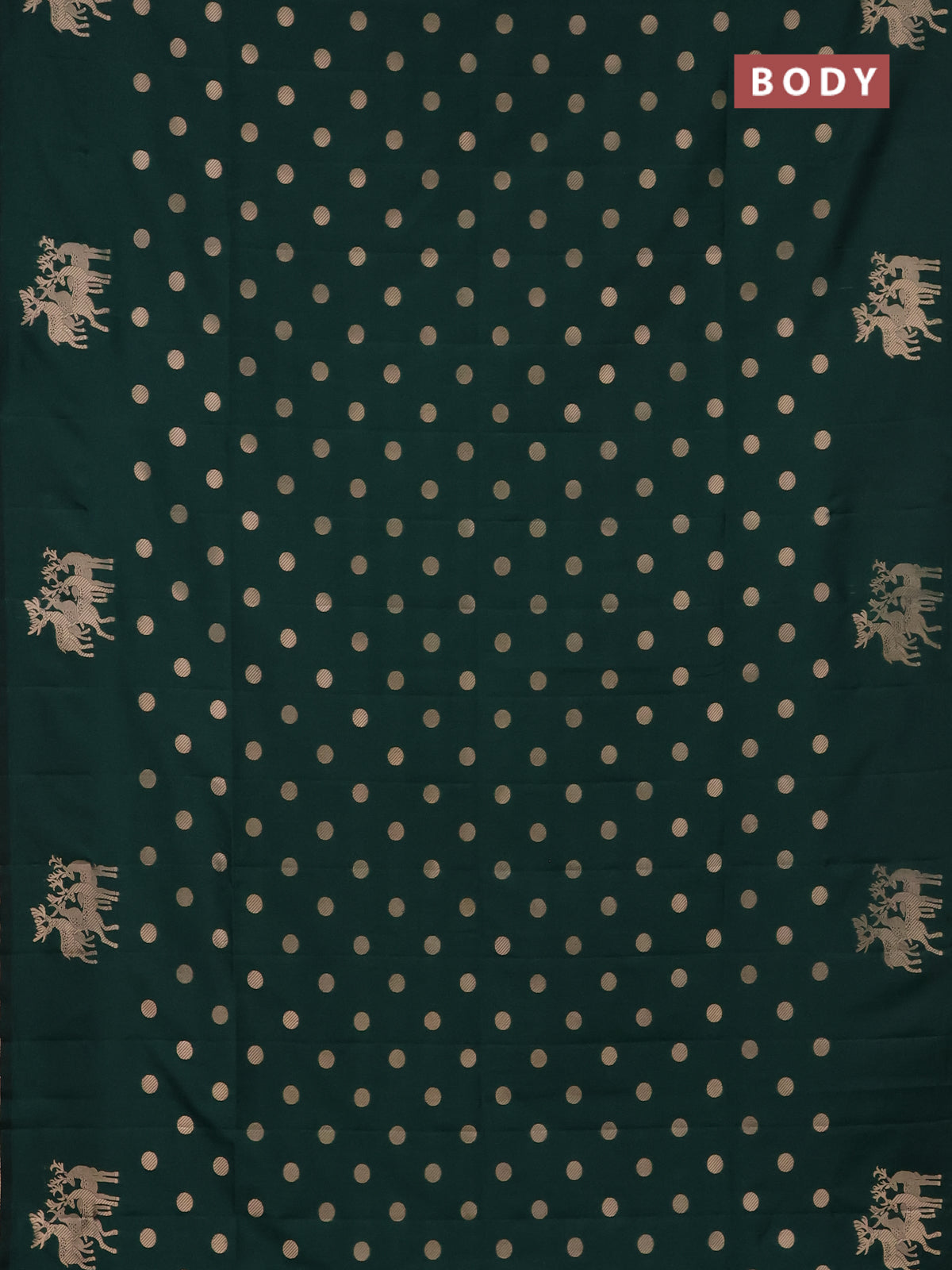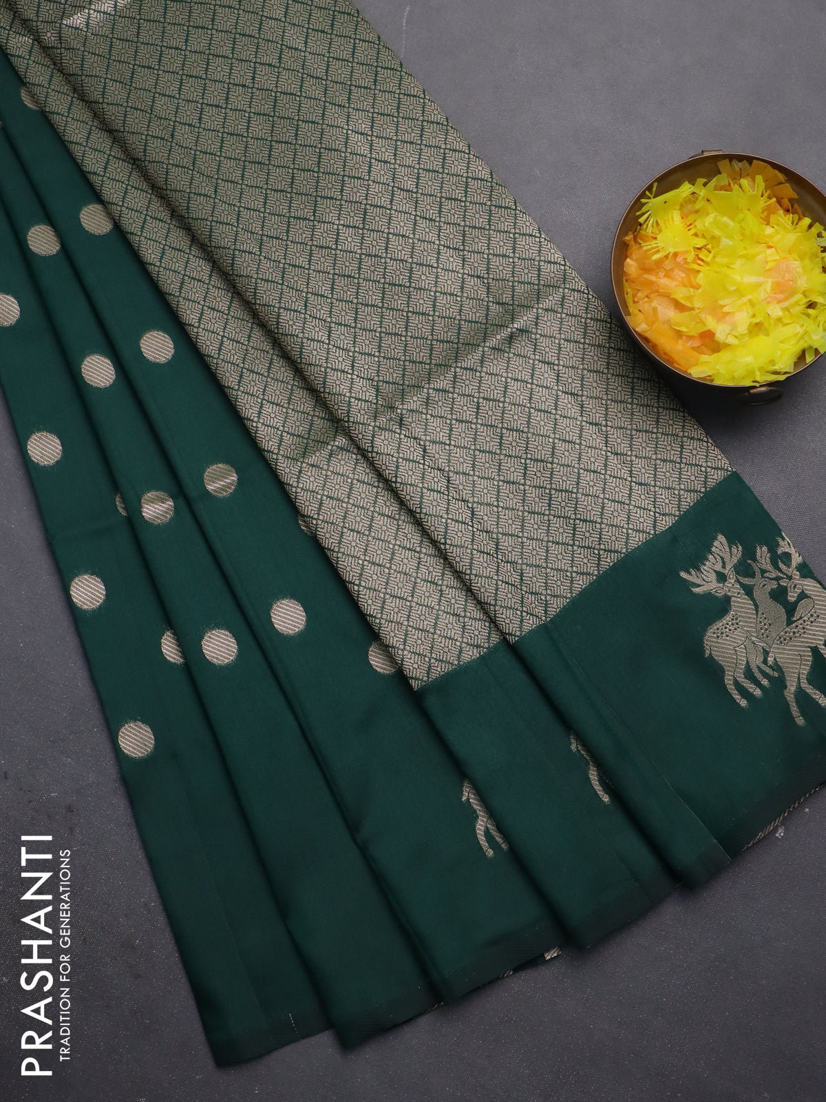 Semi soft silk saree dark green with zari woven coin buttas and zari woven deer butta border