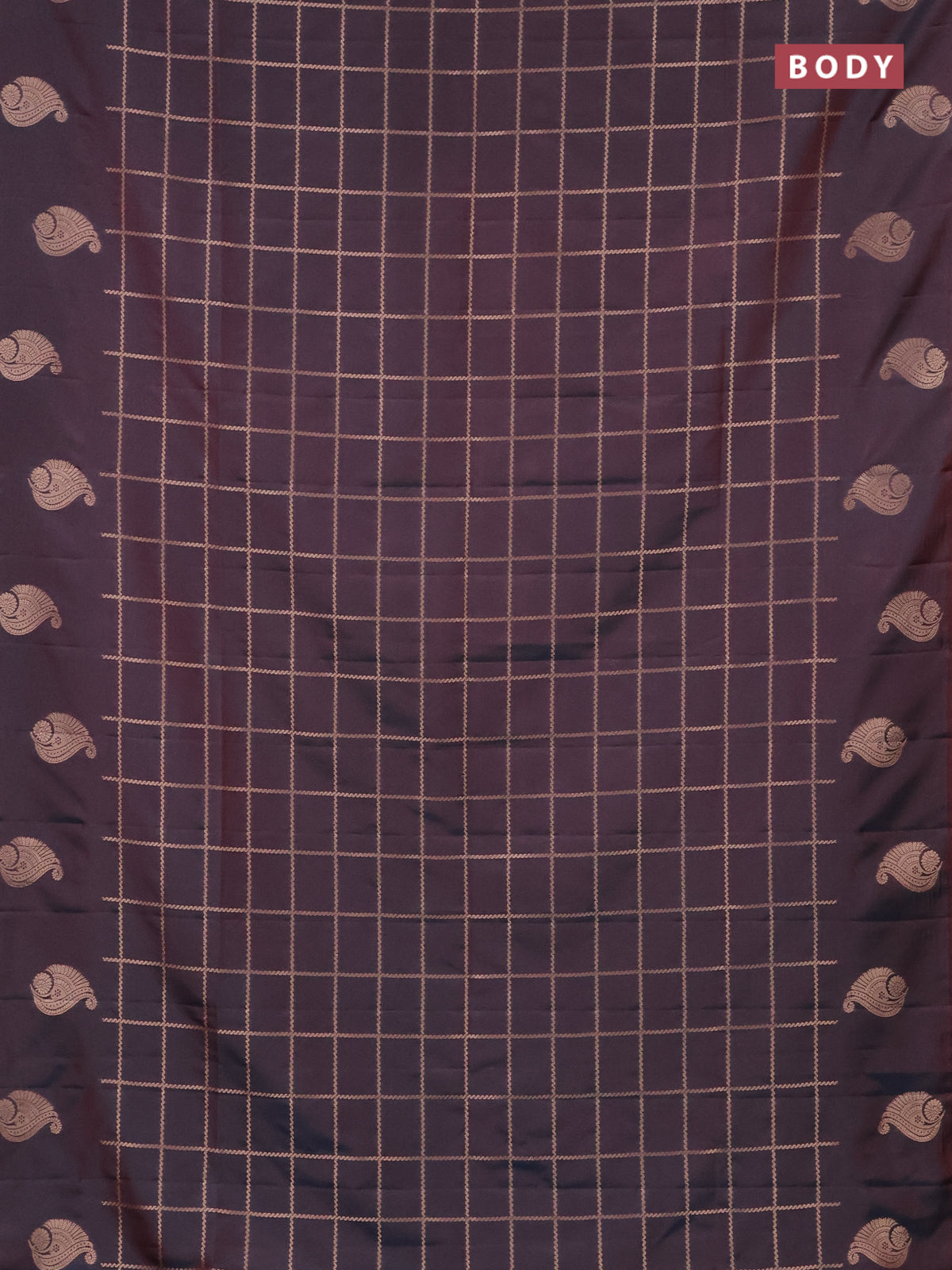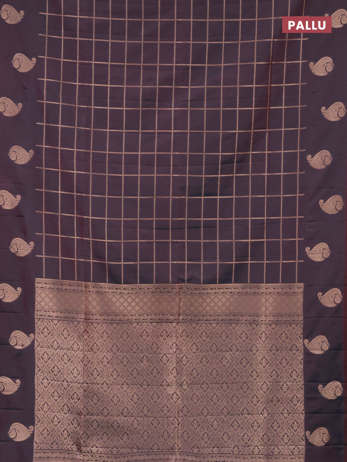 Semi soft silk saree dual shade of bluish maroon with allover zari woven checked pattern and zari woven butta border
