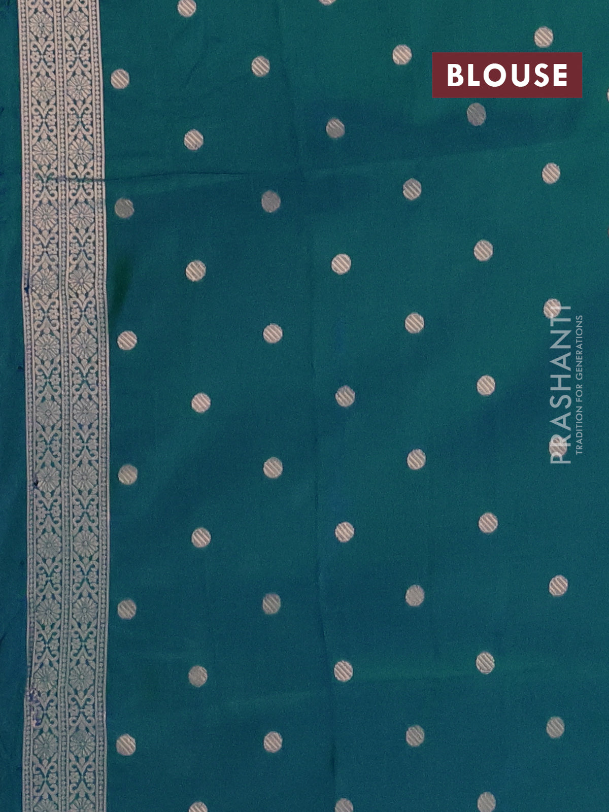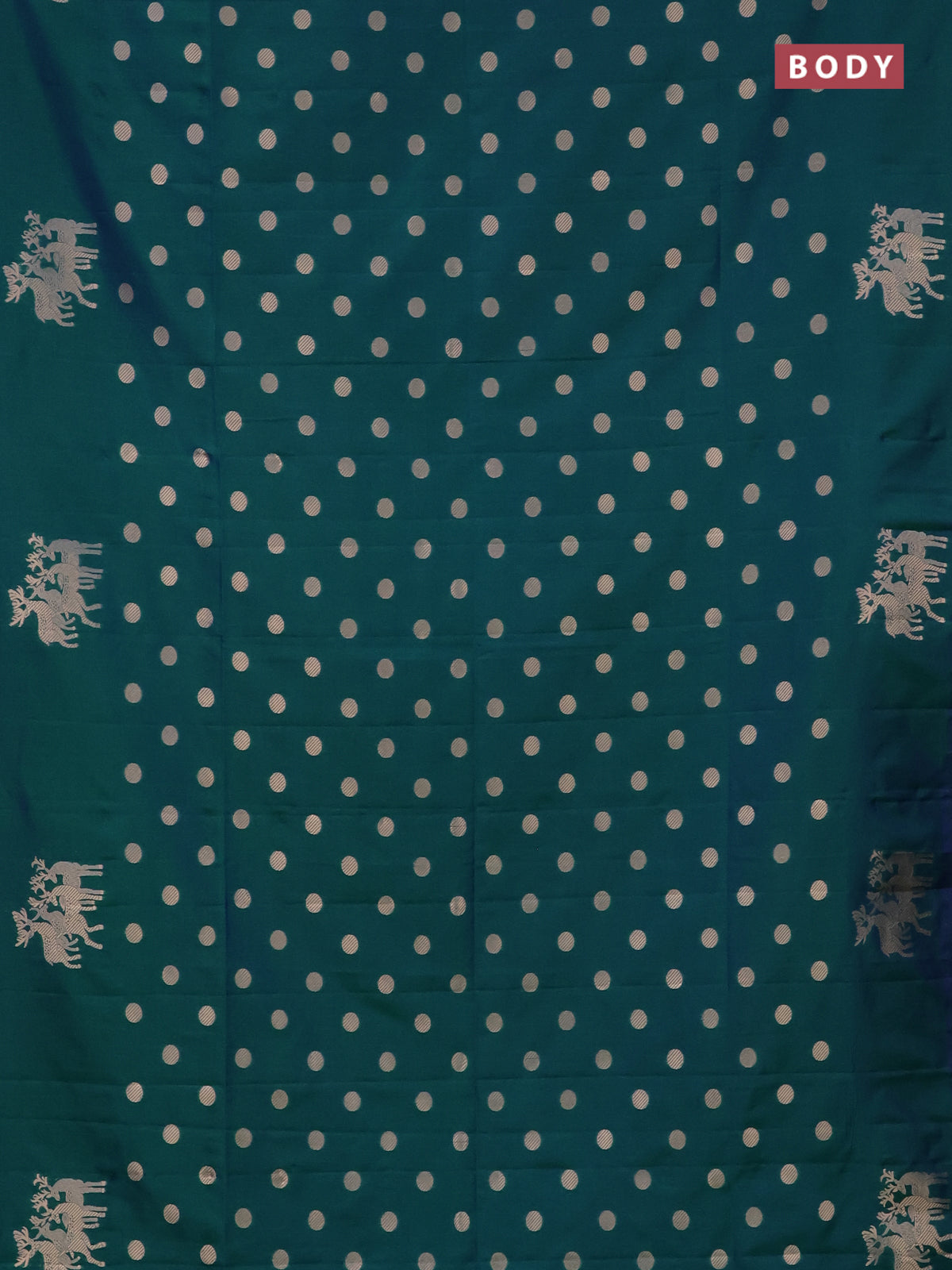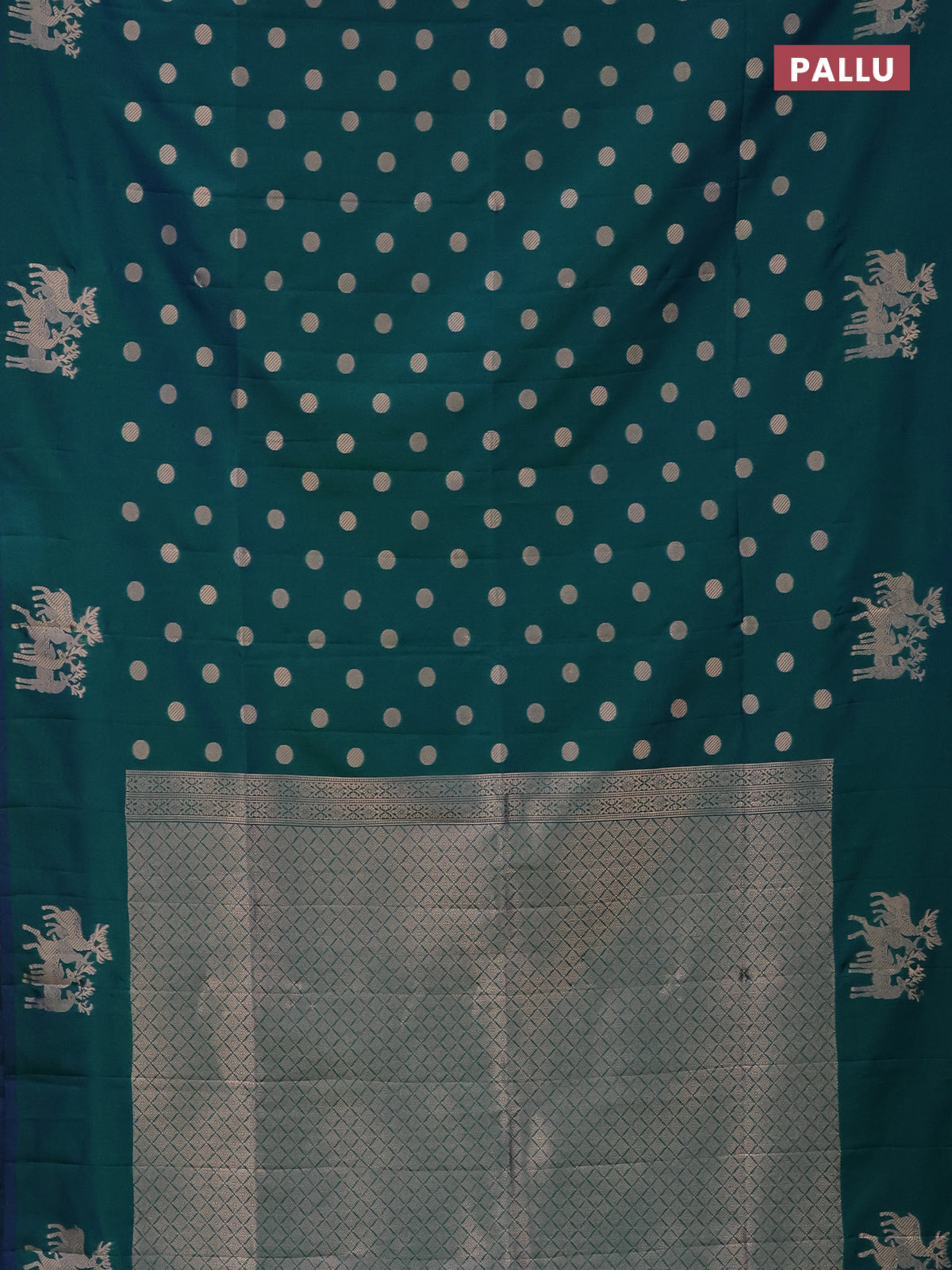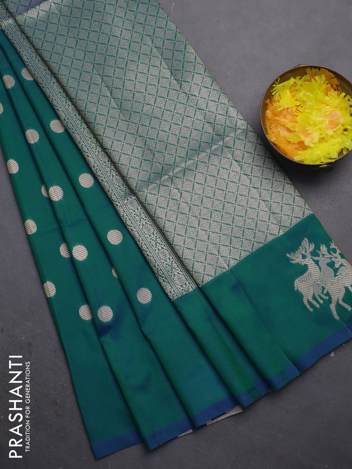 Semi soft silk saree dual shade of greenish blue with zari woven coin buttas and zari woven deer butta border