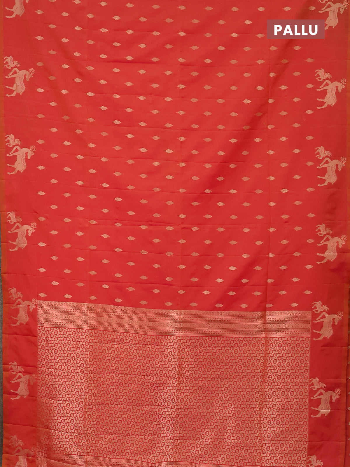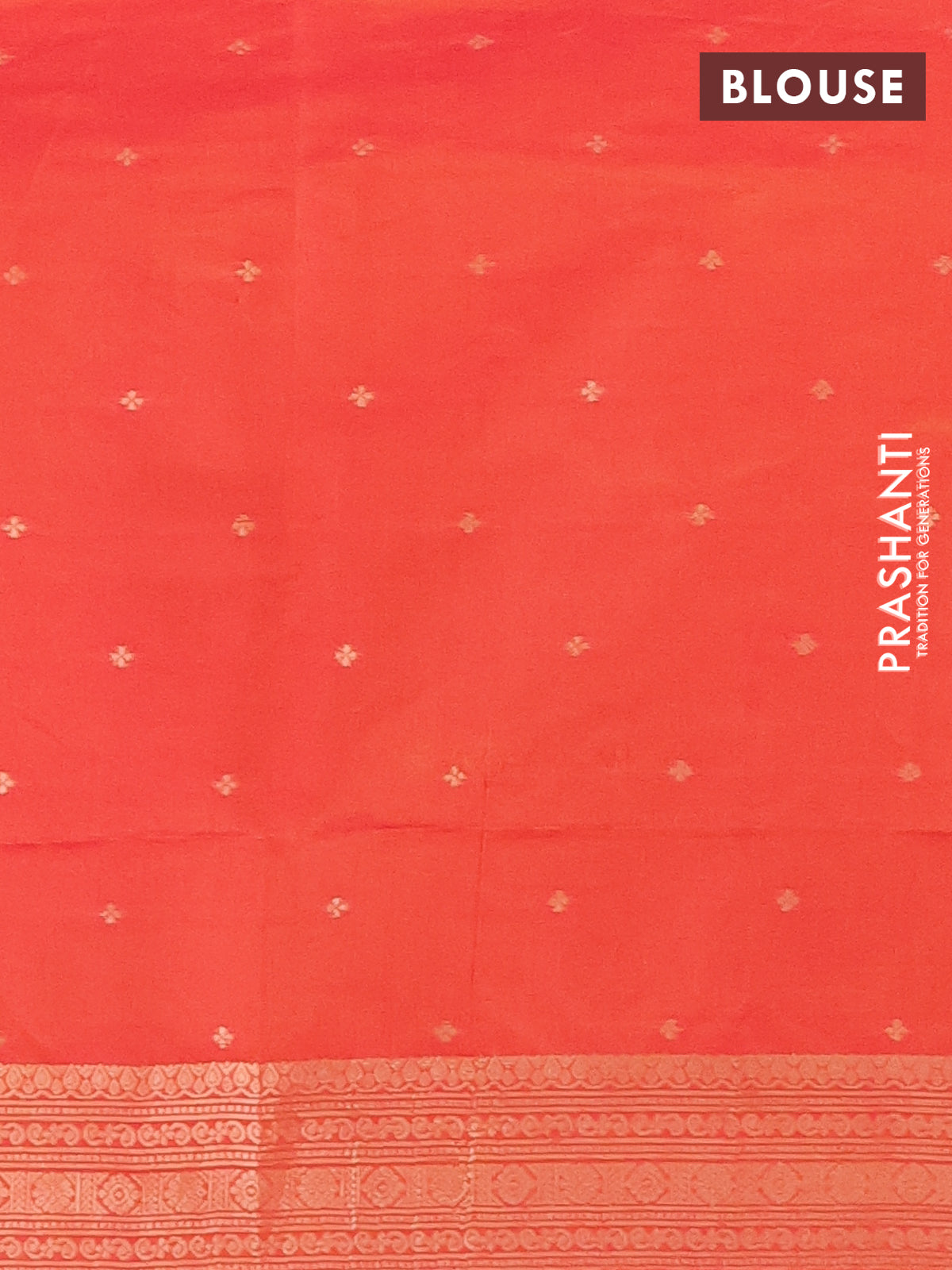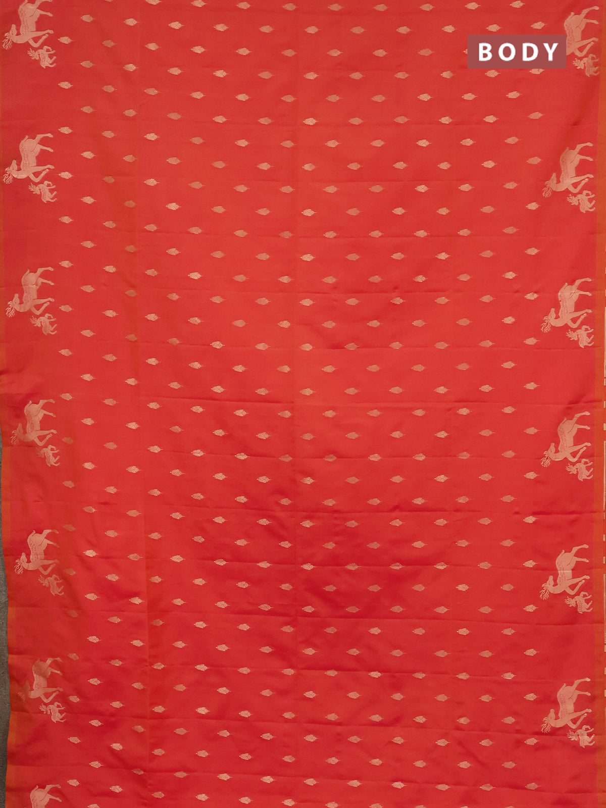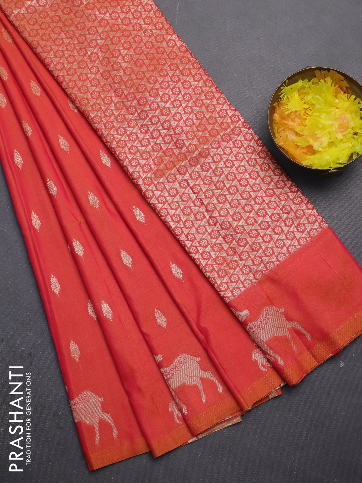 Semi soft silk saree dual shade of pinkish orange with allover zari woven buttas and zari woven deer butta border
