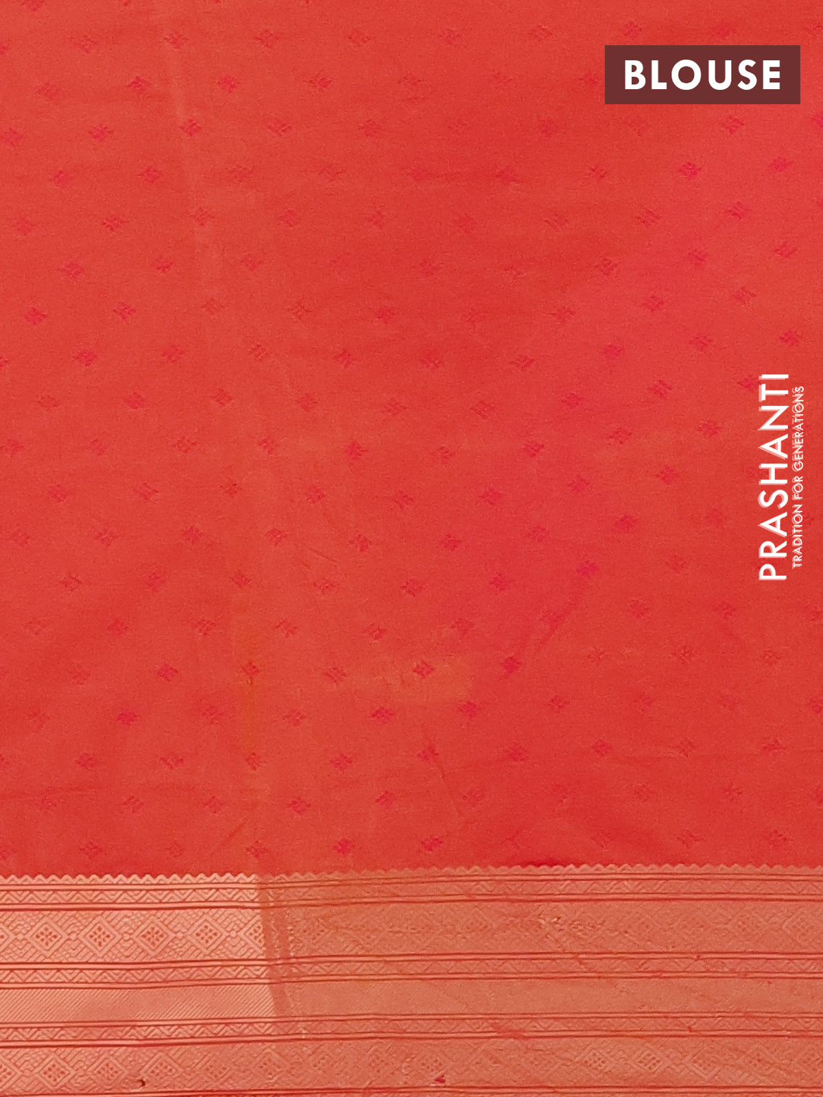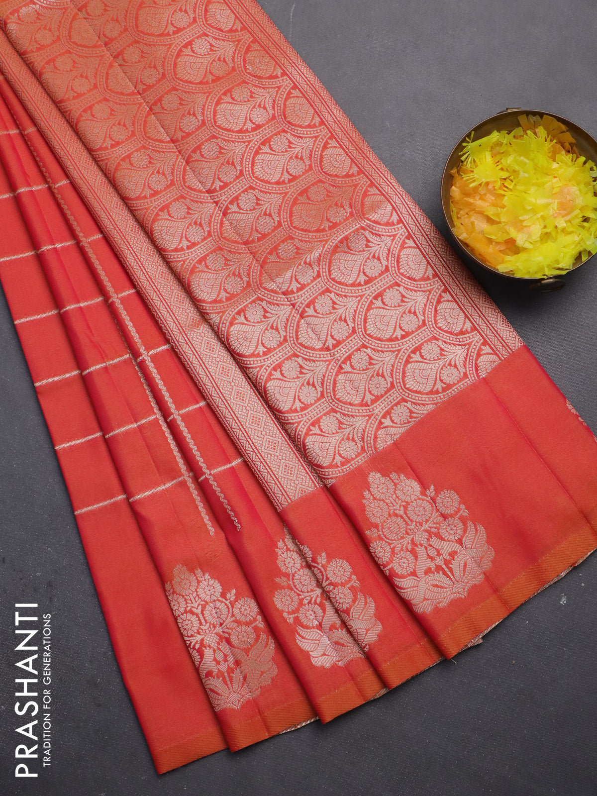 Semi soft silk saree dual shade of pinkish orange with allover zari woven checked pattern with zari woven butta border