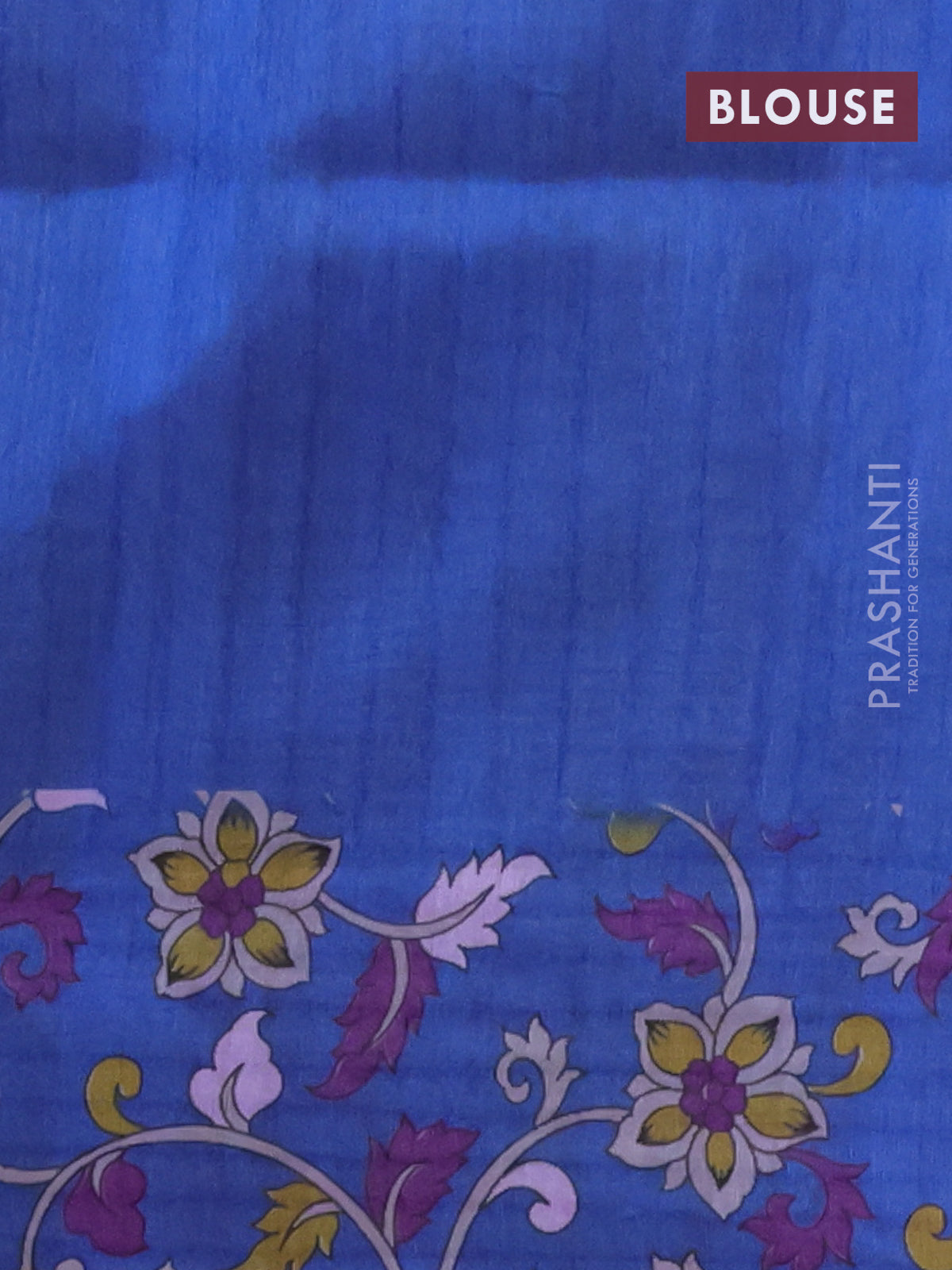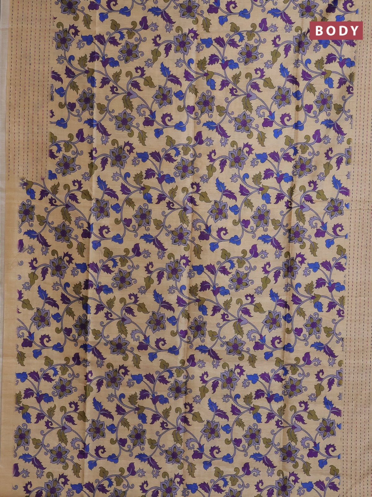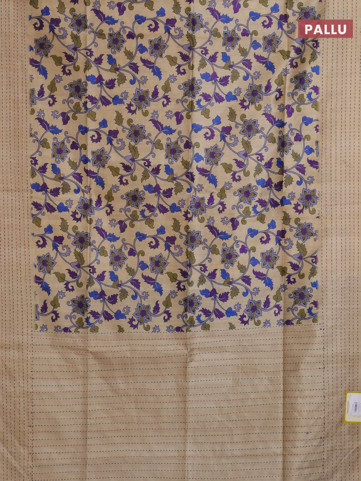 Semi tussar saree beige and blue with allover kalamkari prints and katha stitch work pallu & border