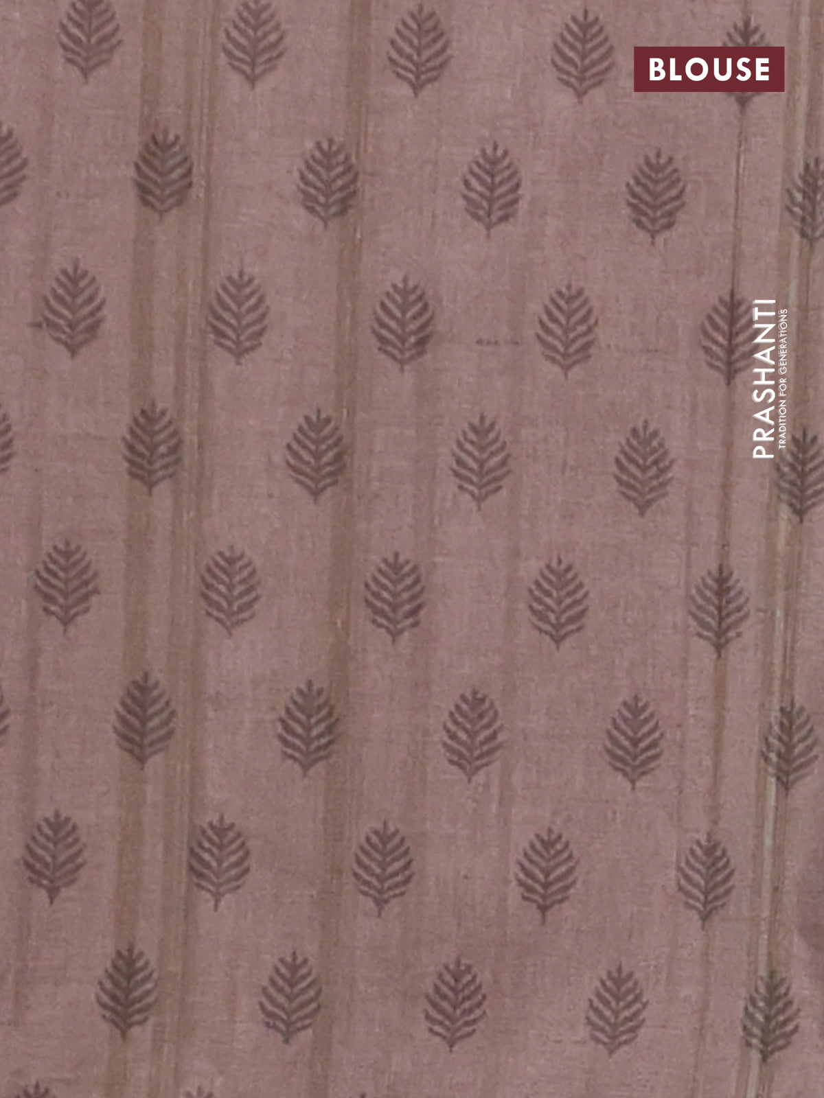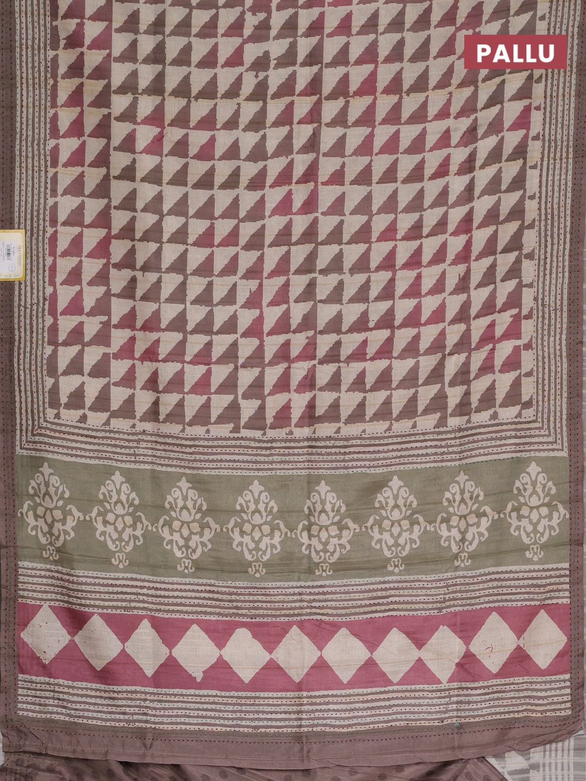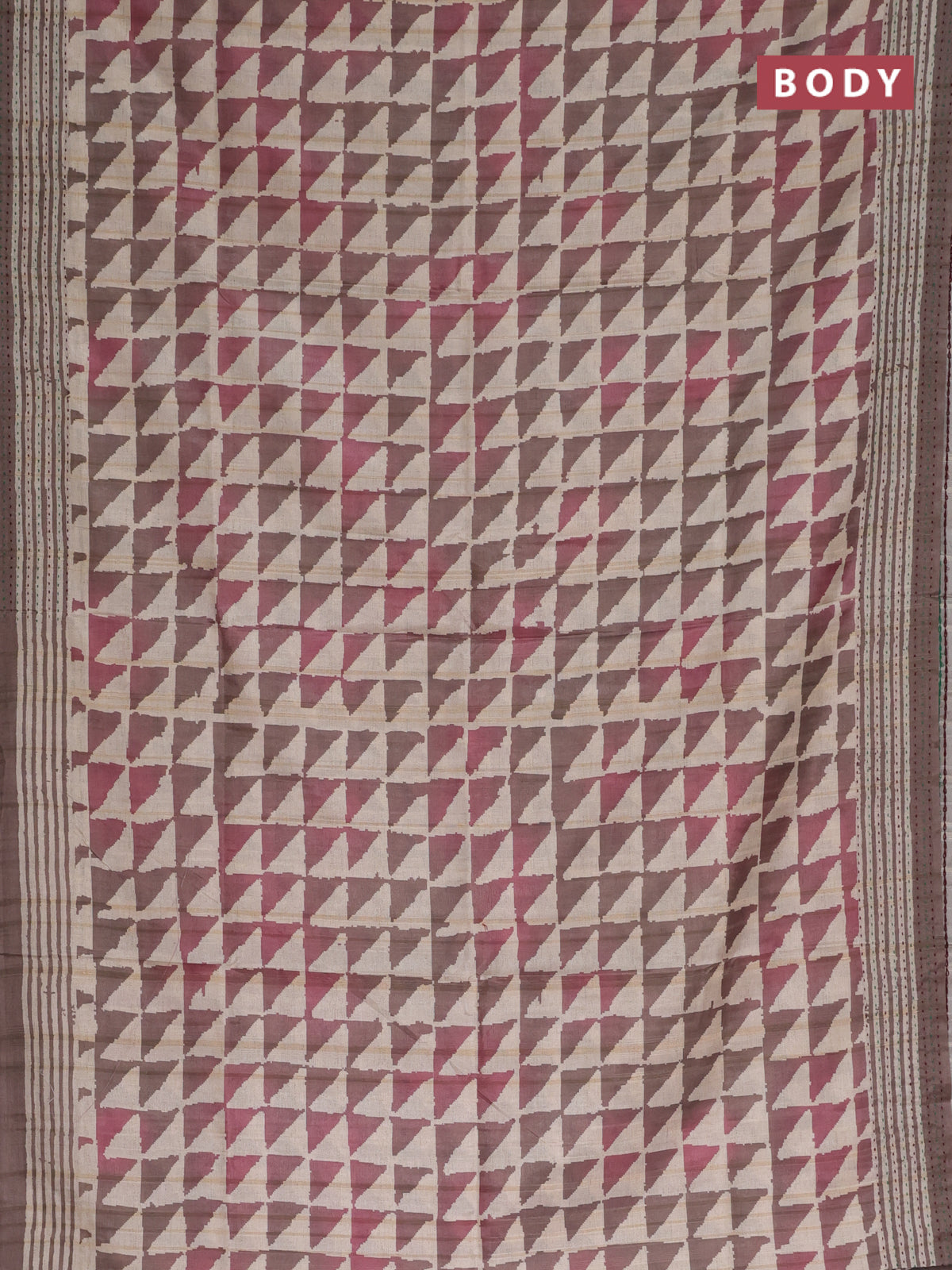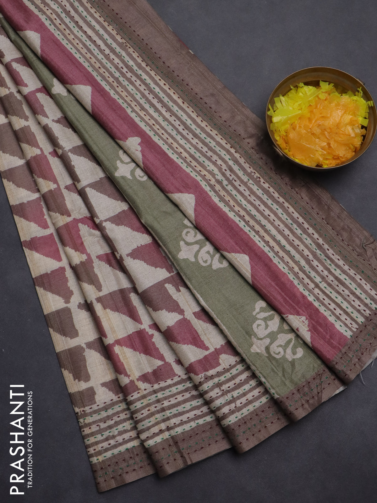 Semi tussar saree beige and brown with allover geometric prints and kantha stitch work border