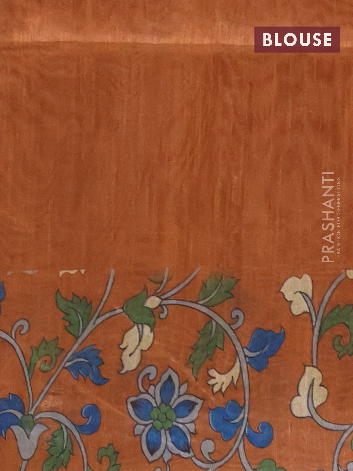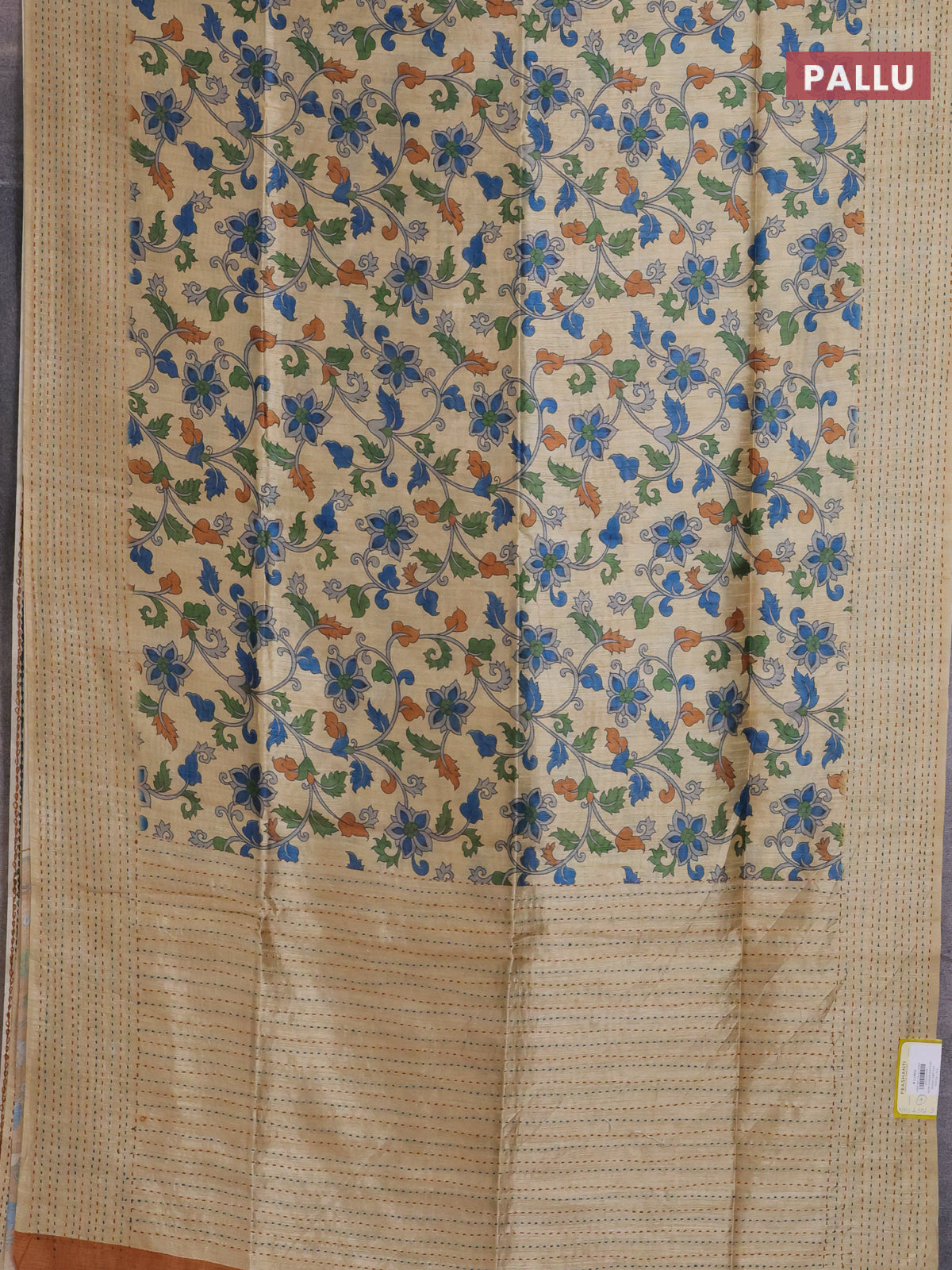 Semi tussar saree beige and brown with allover kalamkari prints and katha stitch work pallu & border