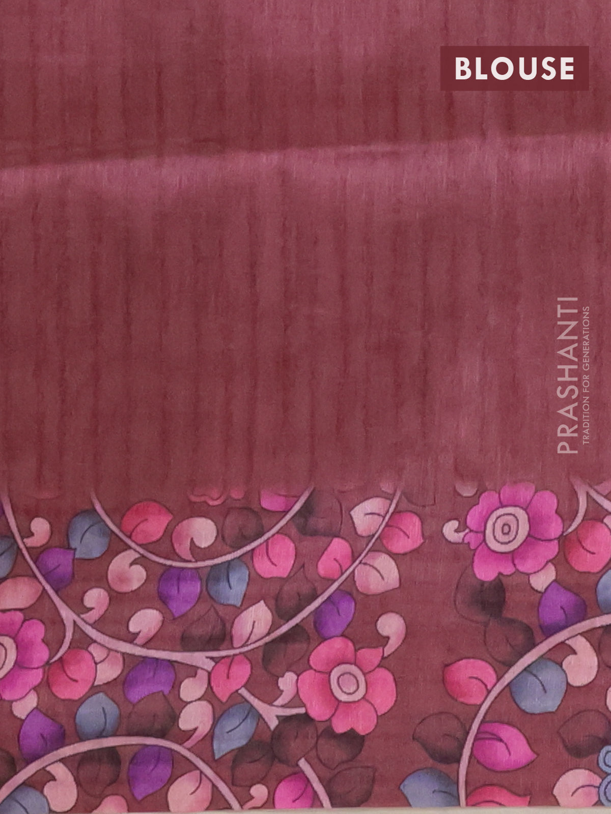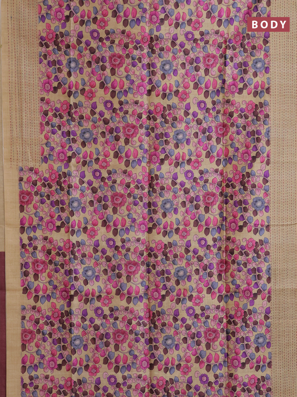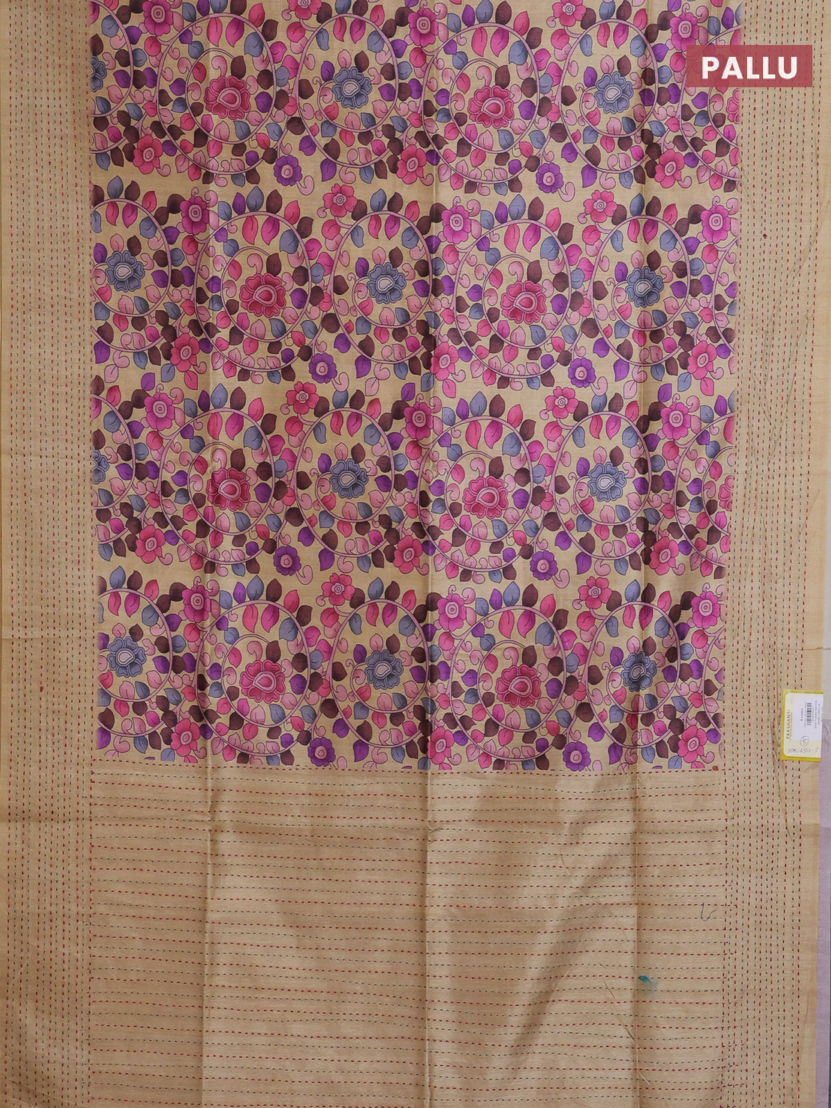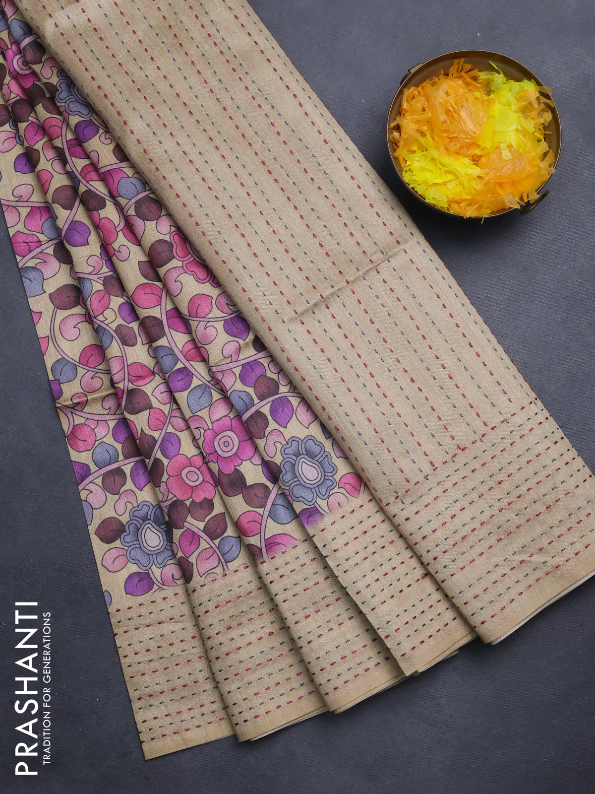 Semi tussar saree beige and coffee brown with allover kalamkari prints and katha stitch work pallu & border