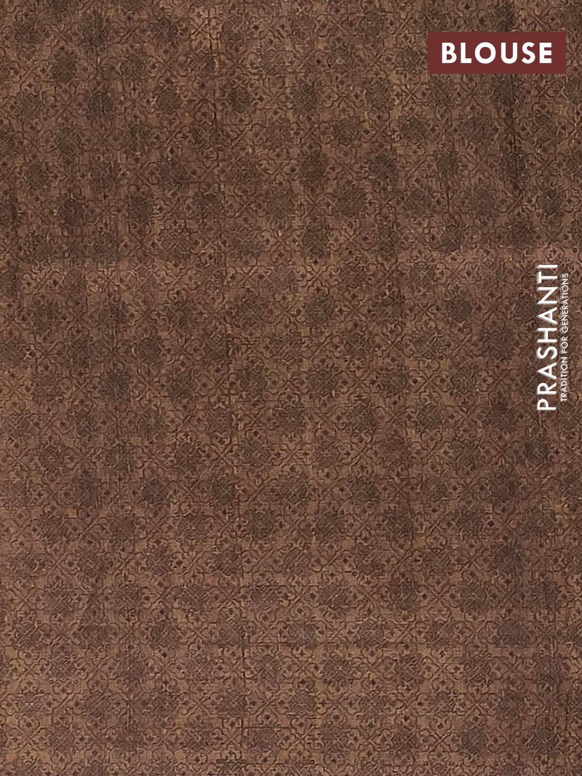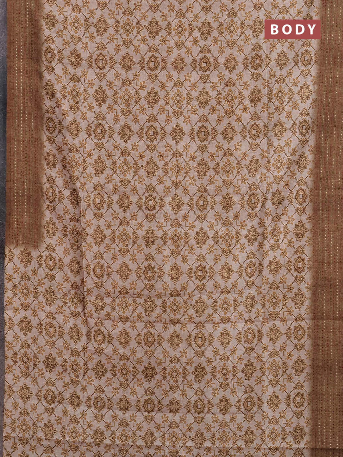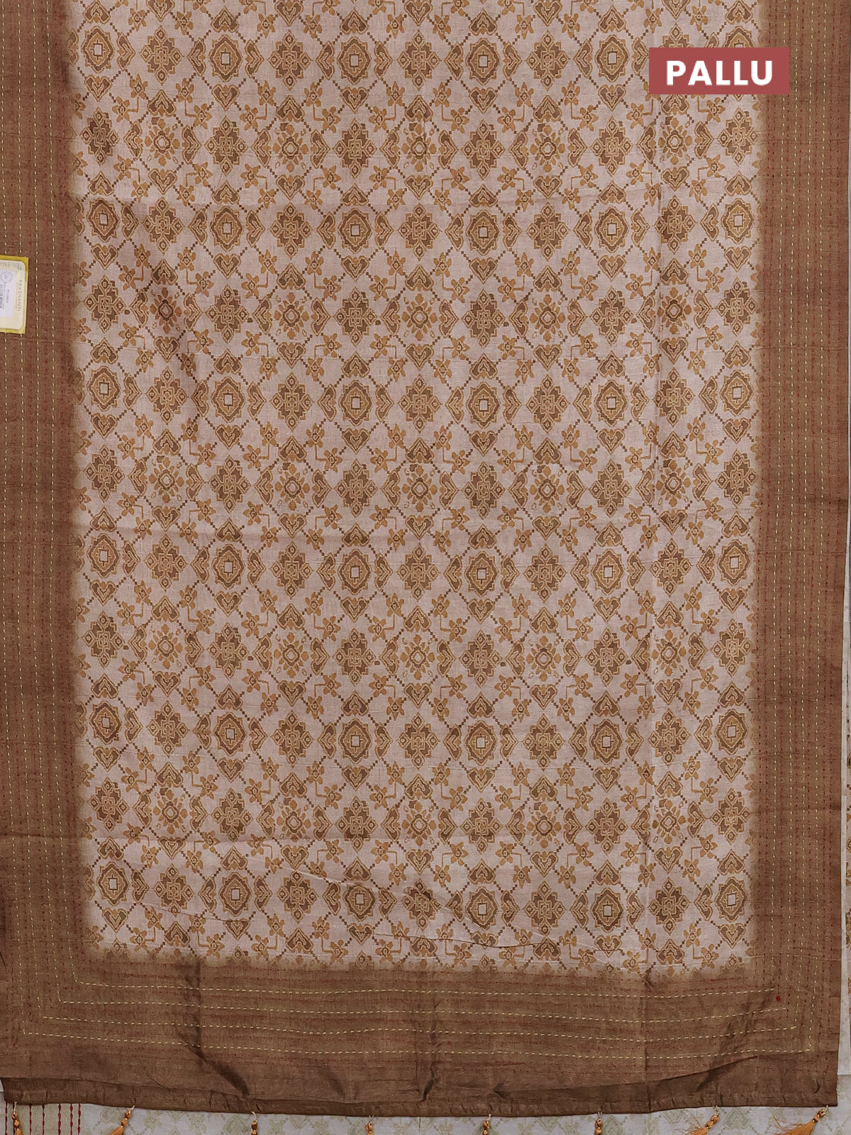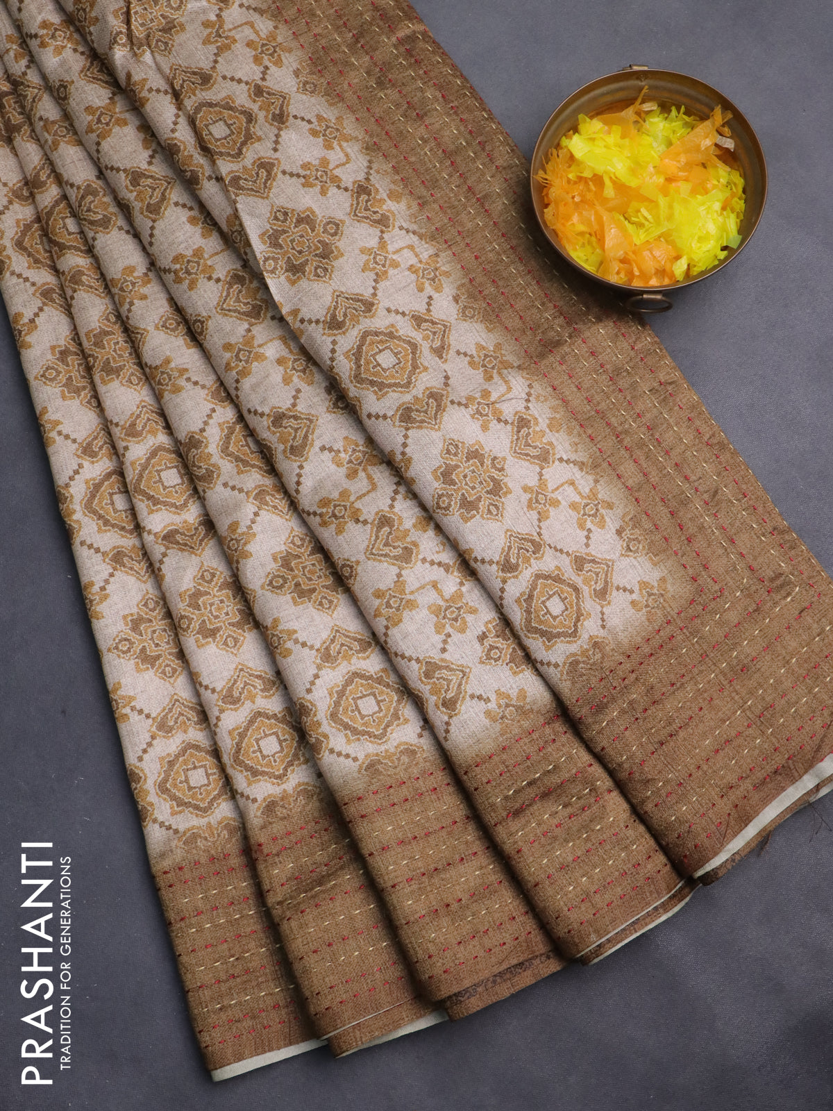 Semi tussar saree beige and dark sandal with allover ikat prints and kantha stitch work border