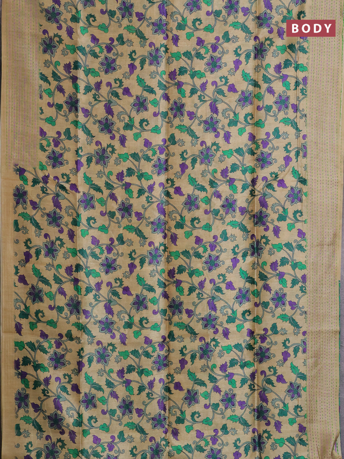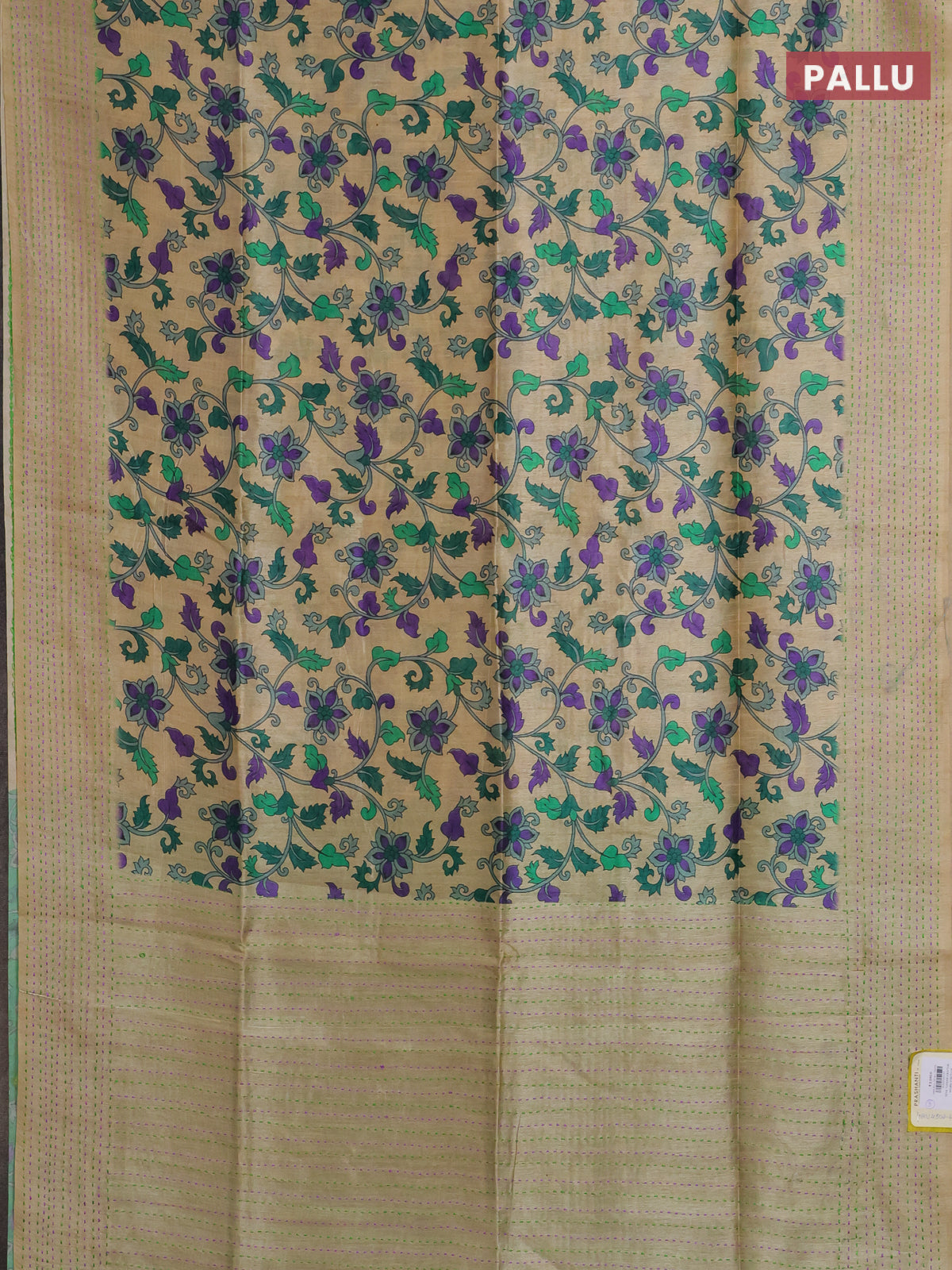 Semi tussar saree beige and green with allover kalamkari prints and katha stitch work pallu & border