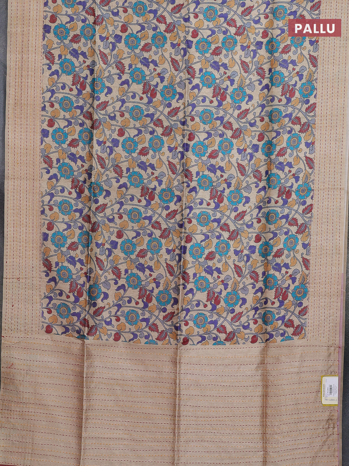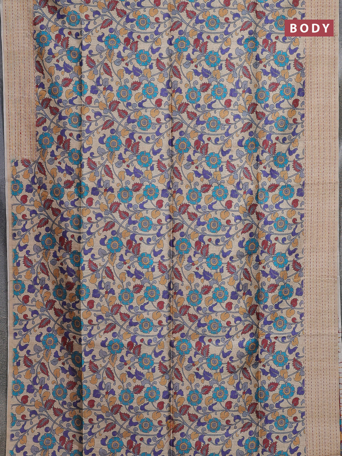 Semi tussar saree beige and maroon with allover kalamkari prints and katha stitch work pallu & border