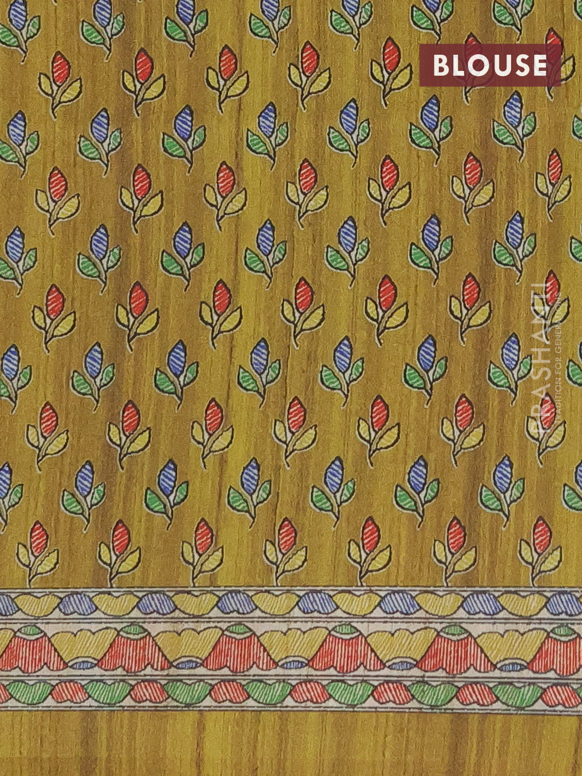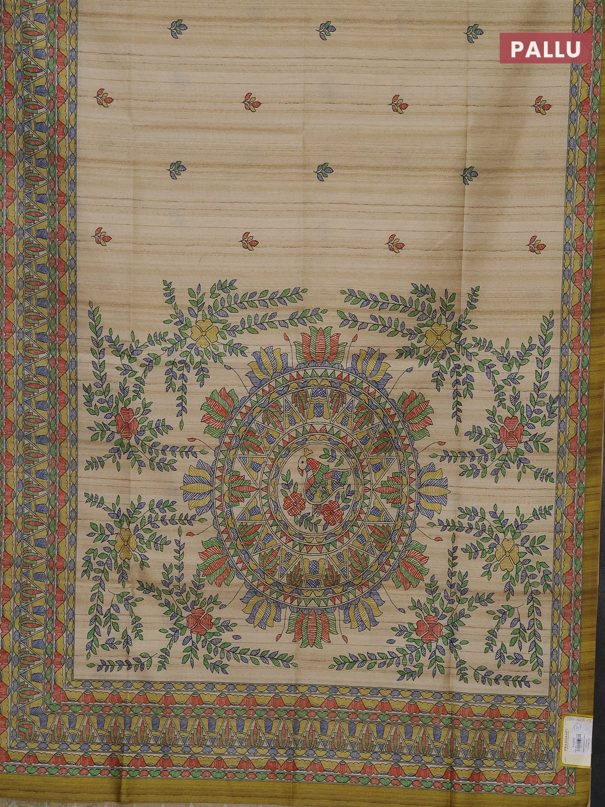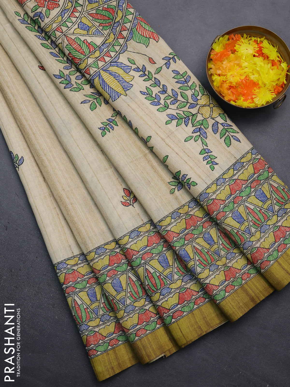 Semi tussar saree beige and mehendi green with madhubani prints and printed border