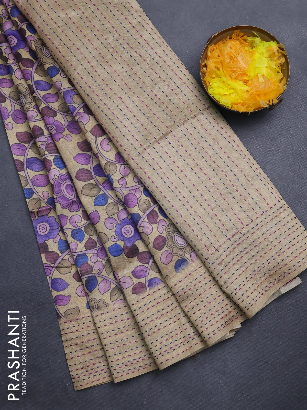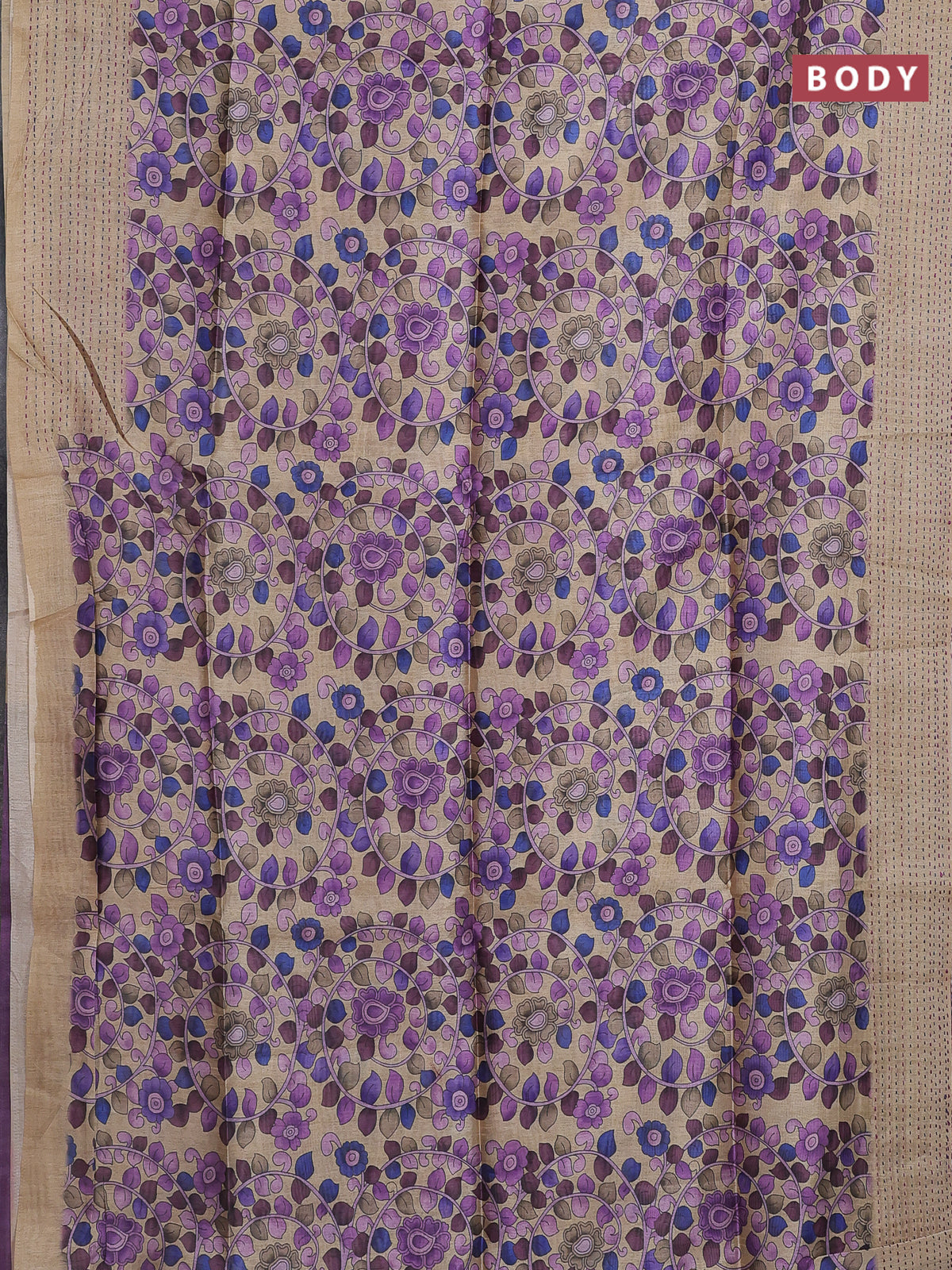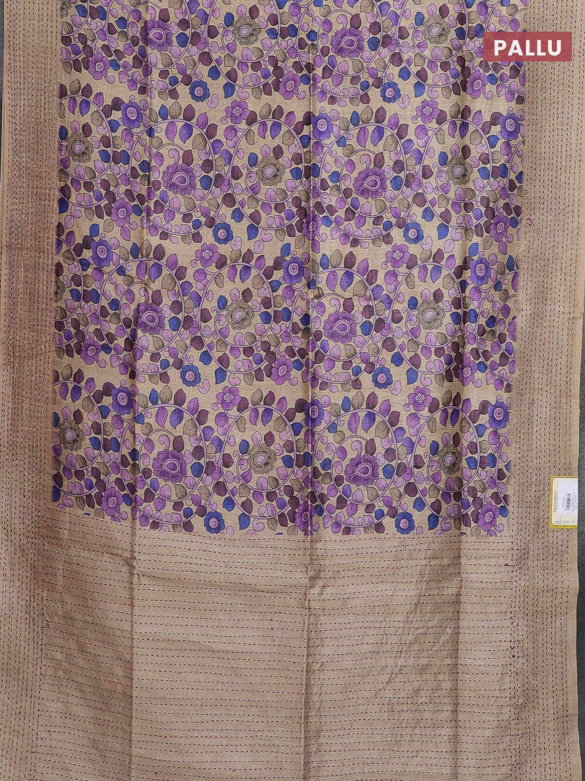 Semi tussar saree beige and purple with allover kalamkari prints and katha stitch work pallu & border