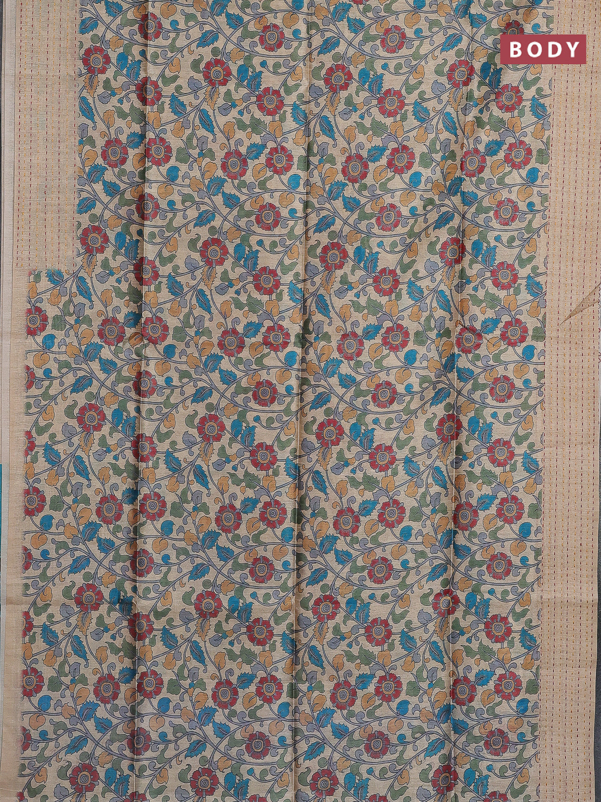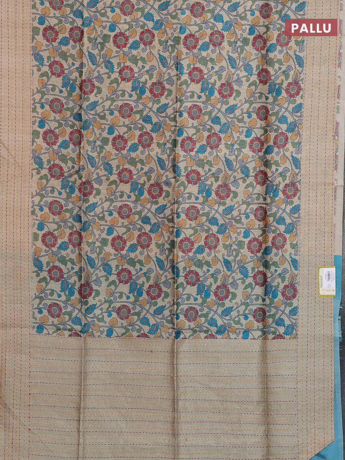 Semi tussar saree beige and teal blue with allover kalamkari prints and katha stitch work pallu & border