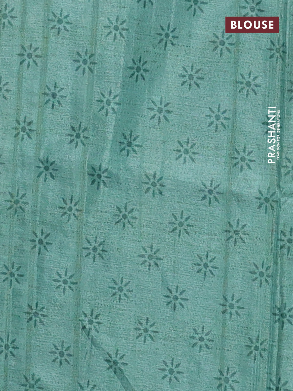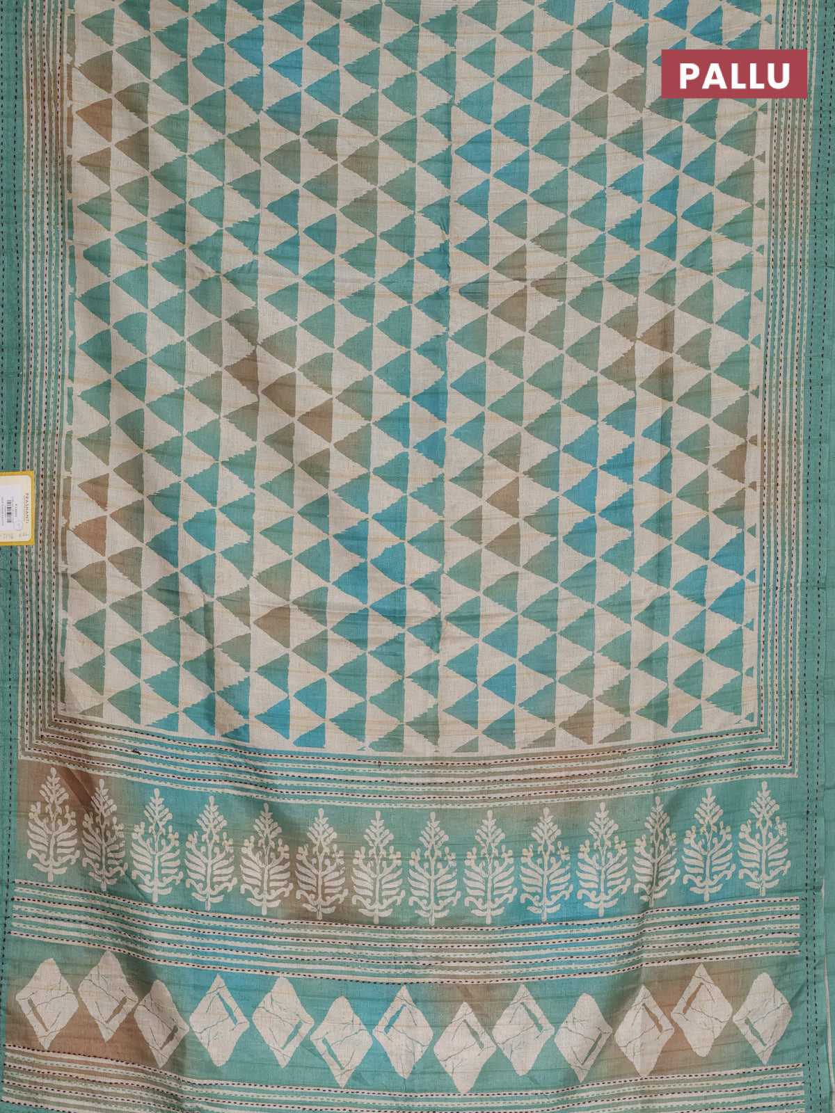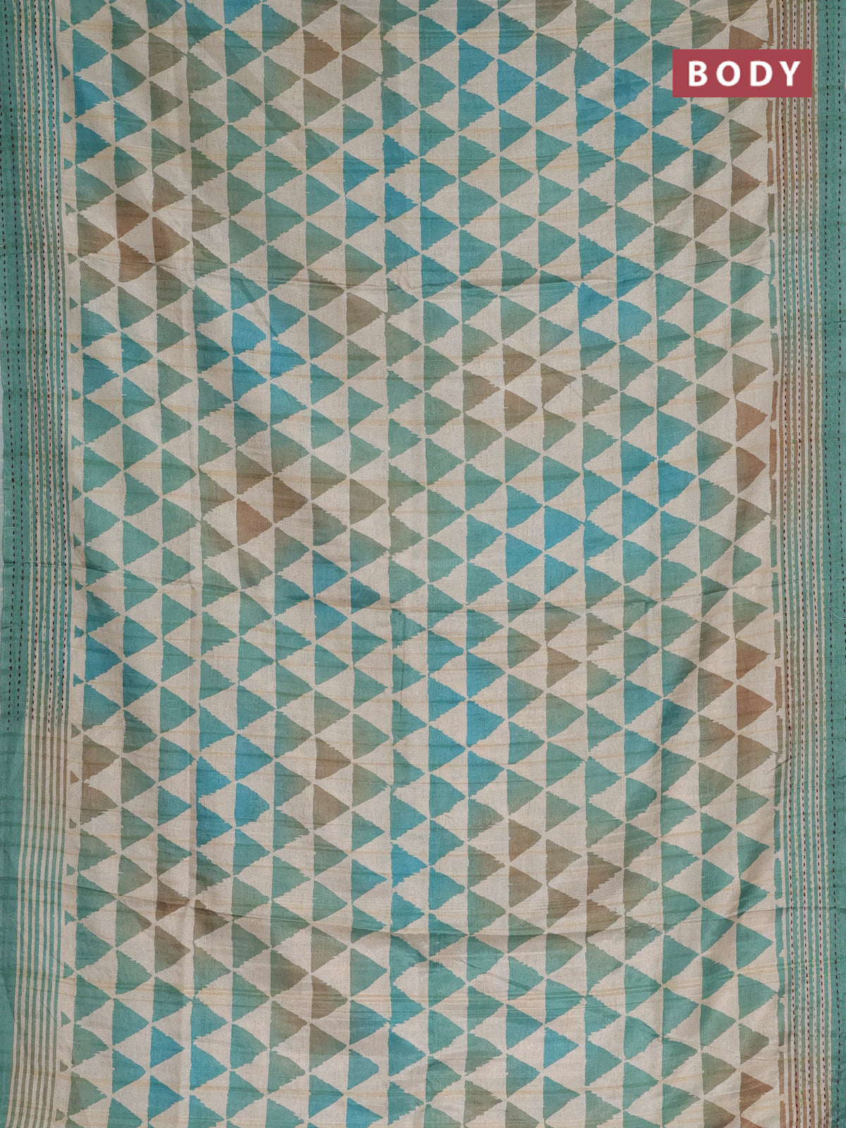 Semi tussar saree beige and teal green with allover geometric prints and kantha stitch work border