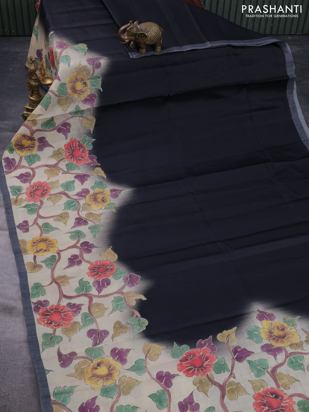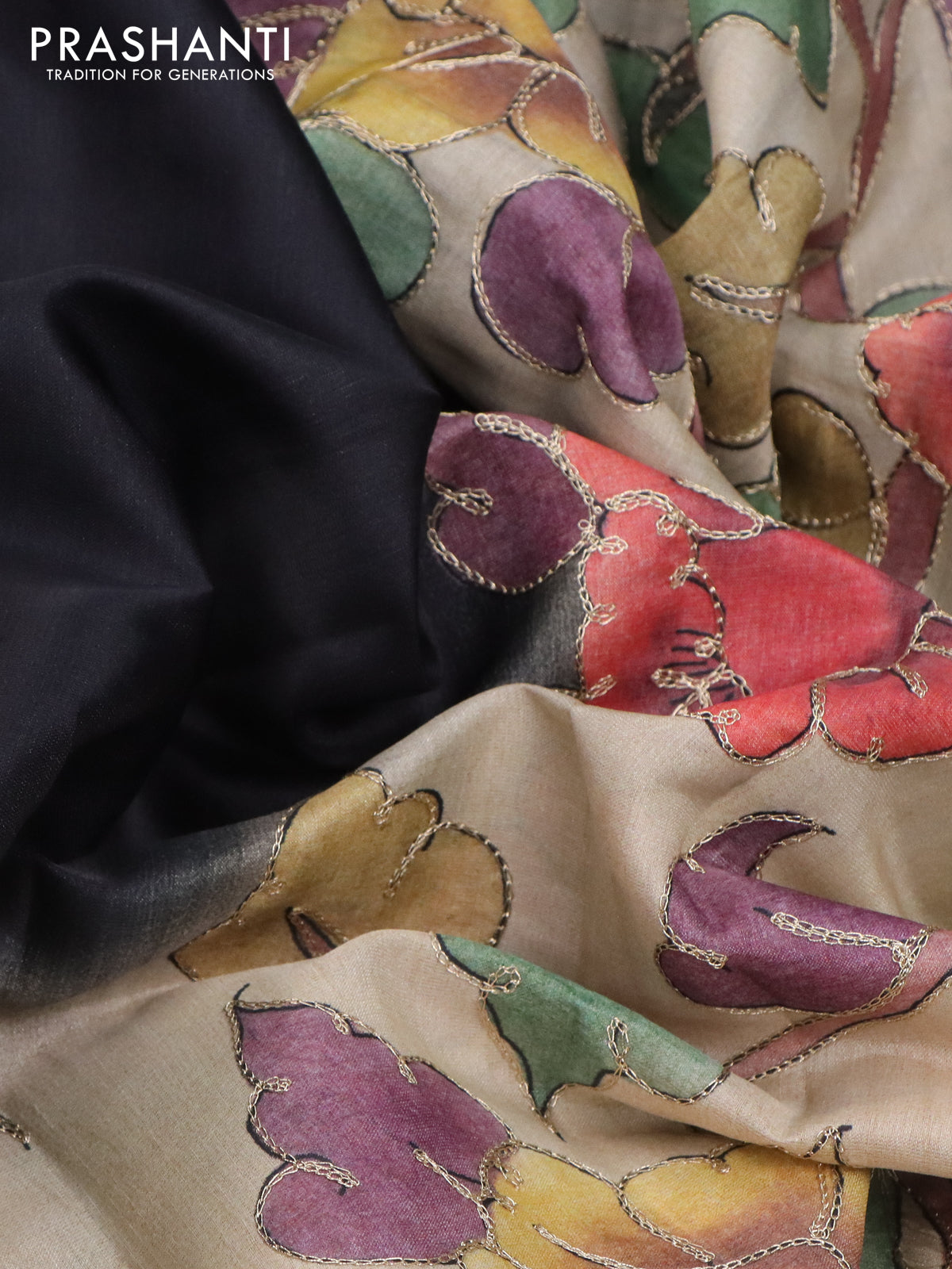 Semi tussar saree black and sandal with plain body and kalamkari prints & pita work border