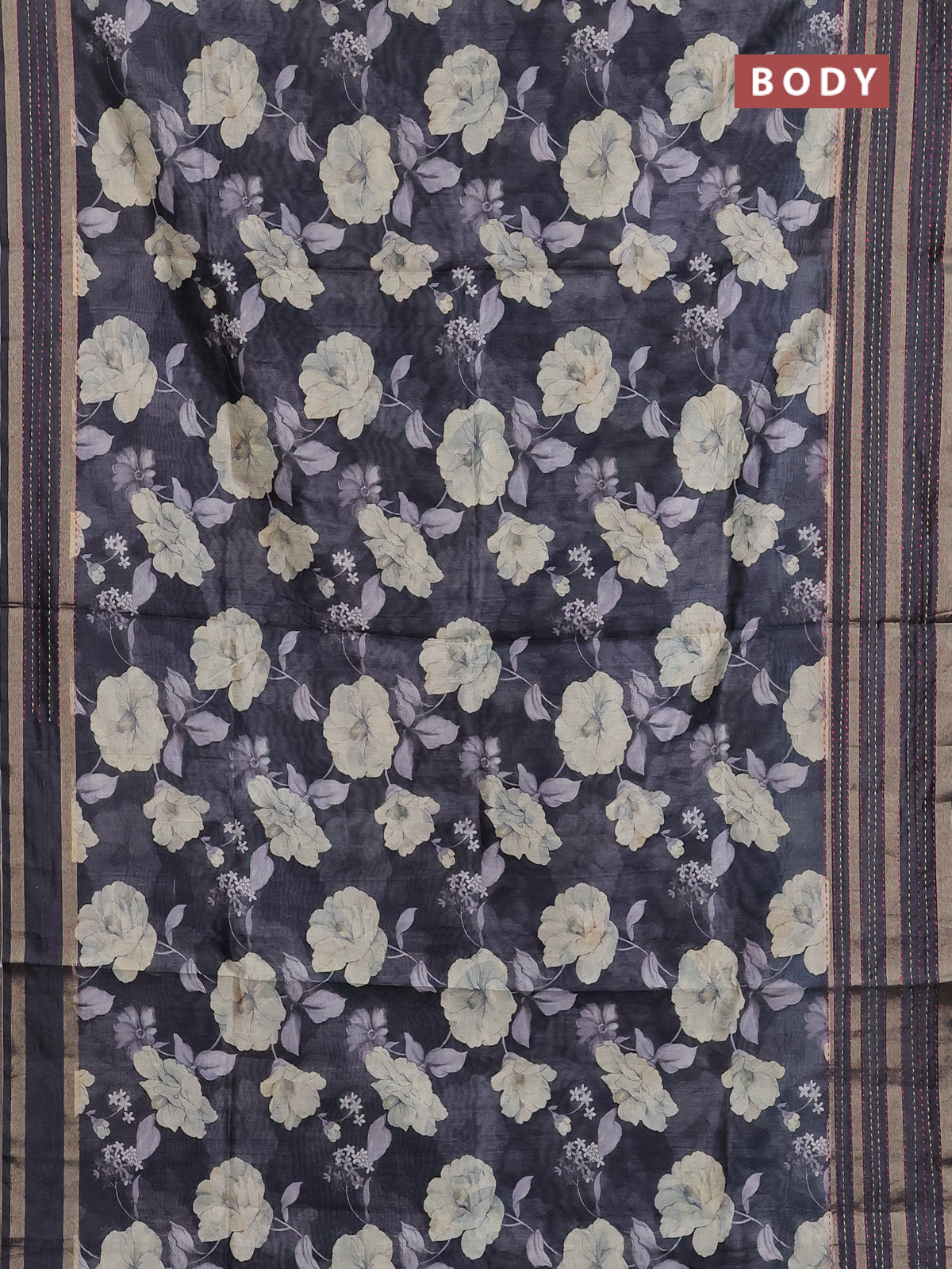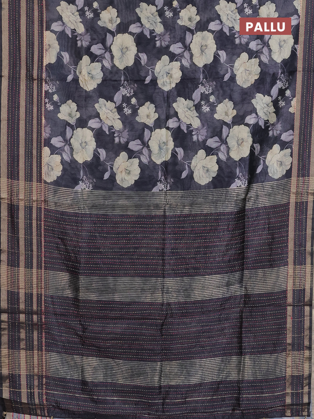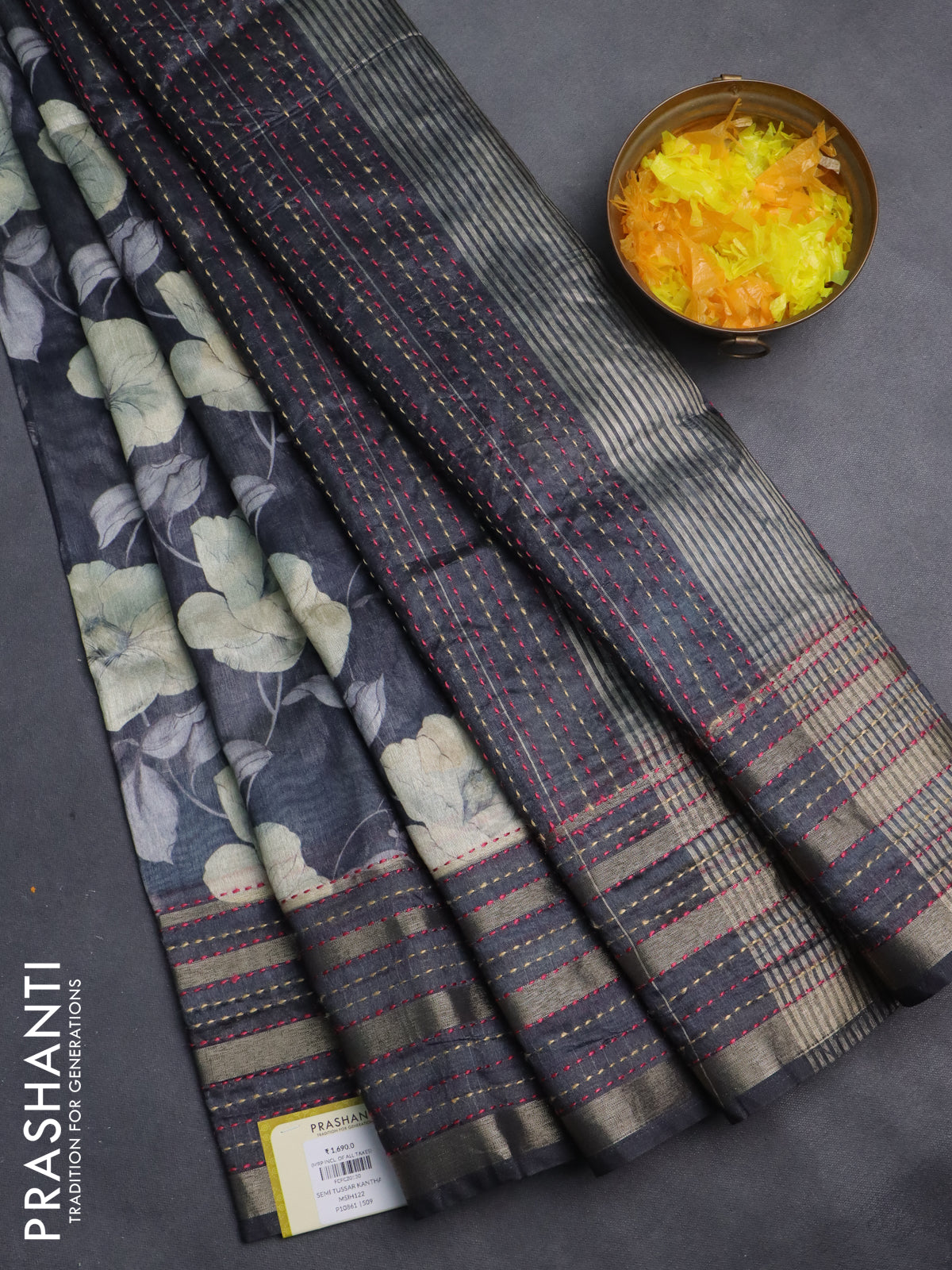 Semi tussar saree black with allover floral prints and kantha stitch work border